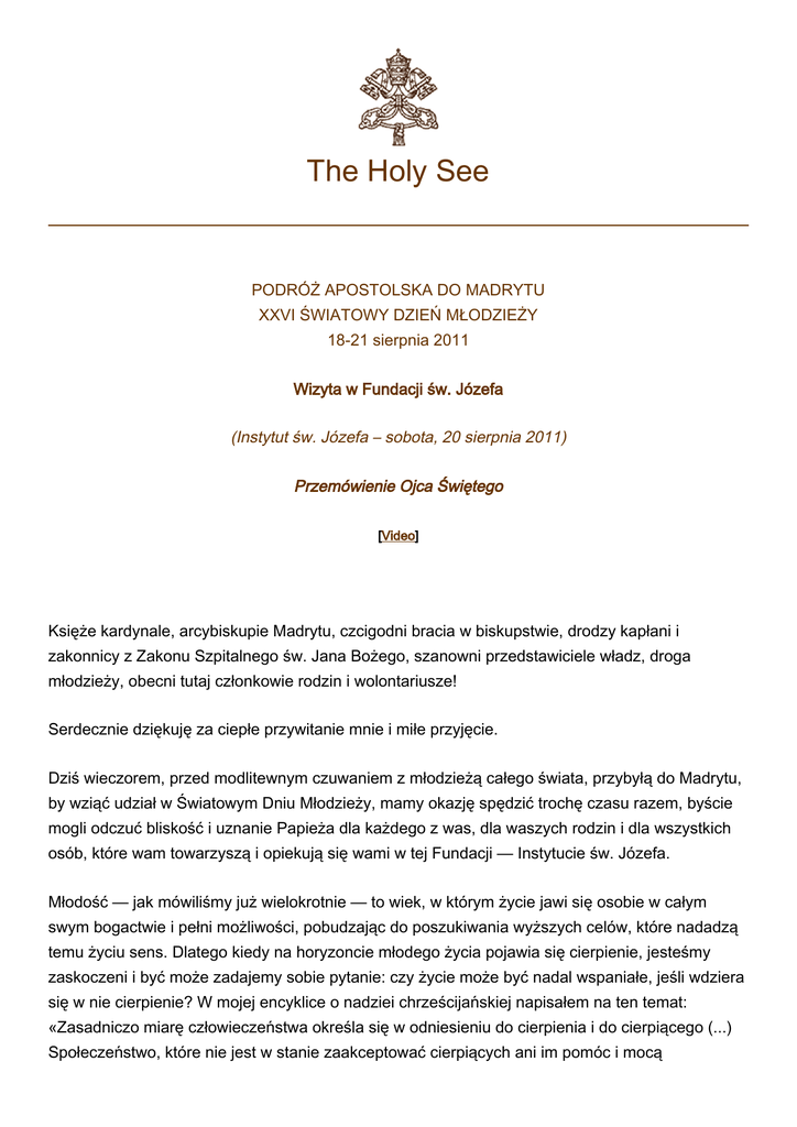 The Holy See PODRÓŻ APOSTOLSKA DO MADRYTU XXVI ŚWIATOWY DZIEŃ MŁODZIEŻY 18-21 sierpnia 2011 Wizyta w Fundacji św. Józefa (Instytut św. Józefa – sobota, 20 sierpnia 2011) Przemówienie Ojca Świętego [Video] Księże kardynale, arcybiskupie Madrytu, czcigodni bracia w biskupstwie, drodzy kapłani i zakonnicy z Zakonu Szpitalnego św. Jana Bożego, szanowni przedstawiciele władz, droga młodzieży, obecni tutaj członkowie rodzin i wolontariusze! Serdecznie dziękuję za ciepłe przywitanie mnie i miłe przyjęcie. Dziś wieczorem, przed modlitewnym czuwaniem z młodzieżą całego świata, przybyłą do Madrytu, by wziąć udział w Światowym Dniu Młodzieży, mamy okazję spędzić trochę czasu razem, byście mogli odczuć bliskość i uznanie Papieża dla każdego z was, dla waszych rodzin i dla wszystkich osób, które wam towarzyszą i opiekują się wami w tej Fundacji — Instytucie św. Józefa. Młodość — jak mówiliśmy już wielokrotnie — to wiek, w którym życie jawi się osobie w całym swym bogactwie i pełni możliwości, pobudzając do poszukiwania wyższych celów, które nadadzą temu życiu sens. Dlatego kiedy na horyzoncie młodego życia pojawia się cierpienie, jesteśmy zaskoczeni i być może zadajemy sobie pytanie: czy życie może być nadal wspaniałe, jeśli wdziera się w nie cierpienie? W mojej encyklice o nadziei chrześcijańskiej napisałem na ten temat: «Zasadniczo miarę człowieczeństwa określa się w odniesieniu do cierpienia i do cierpiącego (...) Społeczeństwo, które nie jest w stanie zaakceptować cierpiących ani im pomóc i mocą 2 współczucia współuczestniczyć w cierpieniu, również duchowo, jest społeczeństwem okrutnym i nieludzkim» (Spe salvi, 38). Te słowa odzwierciedlają długą tradycję humanitaryzmu, który rodzi się z ofiary, którą Chrystus składa z samego siebie na krzyżu za nas i dla naszego zbawienia. Jezus, a także idąca Jego śladami Matka Bolesna i święci są świadkami, którzy uczą nas przeżywać dramat cierpienia dla naszego dobra i zbawienia świata. Świadkowie ci mówią nam przede wszystkim o godności każdego ludzkiego życia, stworzonego na obraz Boga. Żadna udręka nie jest w stanie usunąć tego boskiego znamienia, wyrytego w głębi człowieka. Co więcej: od chwili, kiedy Syn Boży dobrowolnie przyjął ból i śmierć, obrazem Boga jest również oblicze człowieka, który cierpi. Ta szczególna miłość Pana do cierpiących każe nam patrzyć na drugiego człowieka czystymi oczyma, aby oprócz potrzebnych rzeczy zewnętrznych dać mu niezbędne spojrzenie pełne miłości, którego potrzebuje. Jednakże jest to możliwe wyłącznie jako owoc osobistego spotkania z Chrystusem. Jesteście tego świadomi wy, zakonnicy, krewni, pracownicy służby zdrowia i wolontariusze, którzy na co dzień żyjecie i pracujecie z tymi młodymi ludźmi. Swoim życiem i poświęceniem głosicie, że wielkość, do której powołany jest człowiek, stanowi okazywanie współczucia i towarzyszenie z miłością cierpiącym, tak jak czynił Bóg. A w waszej wspaniałej pracy rozbrzmiewają także słowa Ewangelii: «Wszystko, co uczyniliście jednemu z tych braci moich najmniejszych, Mnieście uczynili» (Mt 25, 40). Z drugiej strony, jesteście świadkami ogromnego dobra, jakim jest życie tych młodych ludzi dla osób, które są blisko nich, i dla całej ludzkości. W sposób tajemniczy, ale bardzo realny, obecność tego życia budzi w naszych często zatwardziałych sercach czułość, która otwiera nas na zbawienie. Życie tych młodych ludzi z pewnością zmienia ludzkie serca, dlatego jesteśmy wdzięczni Panu za to, że mogliśmy ich poznać. Drodzy przyjaciele, nasze społeczeństwo, w którym zbyt często podaje się w wątpliwość nieocenioną godność życia, każdego życia, potrzebuje was: przyczyniacie się w sposób decydujący do budowania cywilizacji miłości. A nawet więcej: odgrywacie wiodącą rolę w tej cywilizacji. A jako dzieci Kościoła ofiarowujecie Panu swoje życie z jego smutkami i radościami, współpracując z Nim i w pewien sposób tworząc «część skarbca współczucia, którego potrzebuje rodzaj ludzki» (Spe salvi, 40). Z wielką miłością i przez wstawiennictwo św. Józefa, św. Jana Bożego i św. Benedykta Menniego zawierzam was z całego serca Bogu, naszemu Panu: niech On będzie waszą mocą i nagrodą. A znakiem Jego miłości niech będzie błogosławieństwo apostolskie, którego udzielam wam, wszystkim waszym krewnym i przyjaciołom. Bardzo dziękuję. 3 © Copyright - Libreria Editrice Vaticana