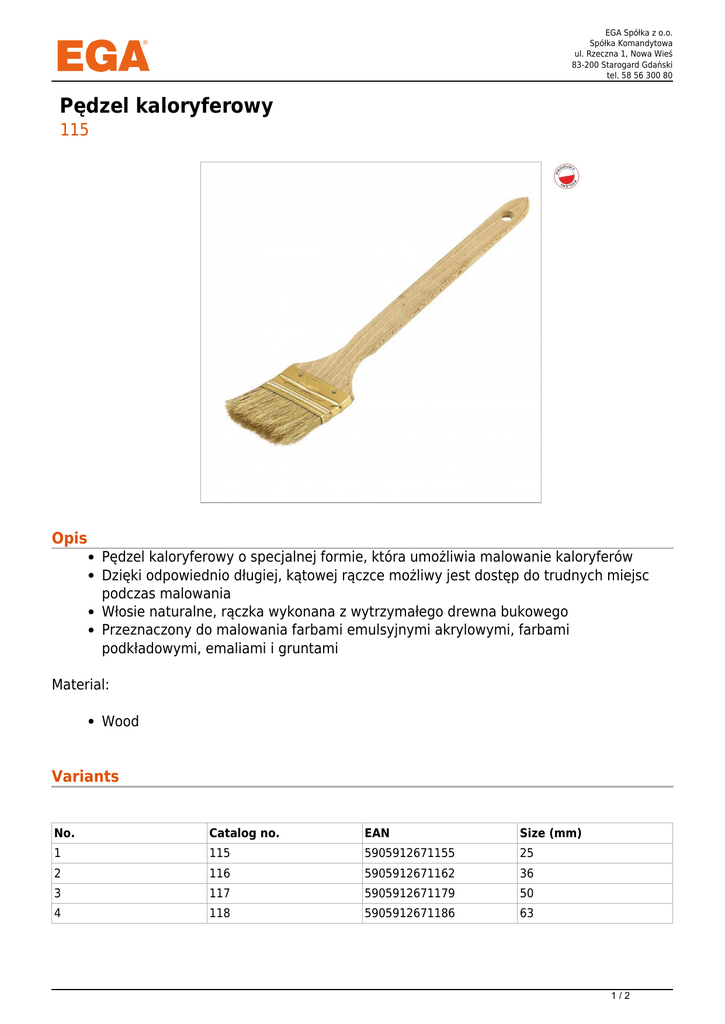 EGA Spółka z o.o. Spółka Komandytowa ul. Rzeczna 1, Nowa Wieś 83-200 Starogard Gdański tel. 58 56 300 80 Pędzel kaloryferowy 115 Opis Pędzel kaloryferowy o specjalnej formie, która umożliwia malowanie kaloryferów Dzięki odpowiednio długiej, kątowej rączce możliwy jest dostęp do trudnych miejsc podczas malowania Włosie naturalne, rączka wykonana z wytrzymałego drewna bukowego Przeznaczony do malowania farbami emulsyjnymi akrylowymi, farbami podkładowymi, emaliami i gruntami Material: Wood Variants No. Catalog no. EAN Size (mm) 1 115 5905912671155 25 2 116 5905912671162 36 3 117 5905912671179 50 4 118 5905912671186 63 1/2 EGA Spółka z o.o. Spółka Komandytowa ul. Rzeczna 1, Nowa Wieś 83-200 Starogard Gdański tel. 58 56 300 80 2/2 Powered by TCPDF (www.tcpdf.org)