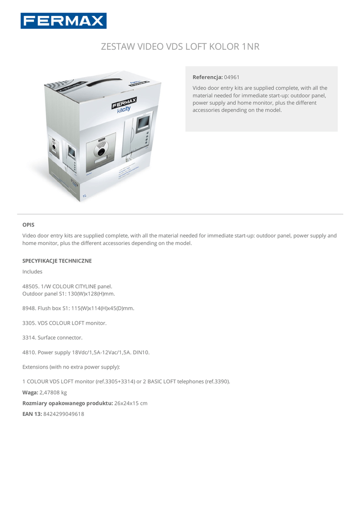 ZESTAW VIDEO VDS LOFT KOLOR 1NR Referencja: 04961 Video door entry kits are supplied complete, with all the material needed for immediate start-up: outdoor panel, power supply and home monitor, plus the different accessories depending on the model. OPIS Video door entry kits are supplied complete, with all the material needed for immediate start-up: outdoor panel, power supply and home monitor, plus the different accessories depending on the model. SPECYFIKACJE TECHNICZNE Includes 48505. 1/W COLOUR CITYLINE panel. Outdoor panel S1: 130(W)x128(H)mm. 8948. Flush box S1: 115(W)x114(H)x45(D)mm. 3305. VDS COLOUR LOFT monitor. 3314. Surface connector. 4810. Power supply 18Vdc/1,5A-12Vac/1,5A. DIN10. Extensions (with no extra power supply): 1 COLOUR VDS LOFT monitor (ref.3305+3314) or 2 BASIC LOFT telephones (ref.3390). Waga: 2,47808 kg Rozmiary opakowanego produktu: 26x24x15 cm EAN 13: 8424299049618 Zawarte produkty PANEL 1NR VDS VIDEO CITY KIT Ref: 48505 New Cityline Panel: CityLine is the "continuous profile" outdoor panel line for buildings. This new panel model is more robust, more luxurious and... CITY FLUSH BOX FOR KIT (S1) Ref: 08948 Do wykonania instalacji panelu należy umieścić obudowę w ścianie lub murze, do którego zostaje przymocowany panel. Obudowy podtynkowe są produkowane... ZASILACZ. 18Vdc/1,5A12Vac/1,5A Ref: 04810 Używa się do zasilania różnego osprzętu instalacji Fermax. Wykonane z samogasnącego materiału VO. Zawierają komplet pokryw do ochrony złączy. PODSTAWA MONITORA LOFT VDS Ref: 03314 VDS Monitor Connector For B&W or Colour Loft Monitor For VDS installations + INFO + INFO + INFO + INFO MONITOR VDS LOFT KOLOR Ref: 03305 KOLOROWY monitor wideodomofonu. Ekran TFT 3,5". Instalowany w lokalach, pozwala na komunikację z panelem zewnętrznym, otwieranie drzwi oraz zapewnia... + INFO