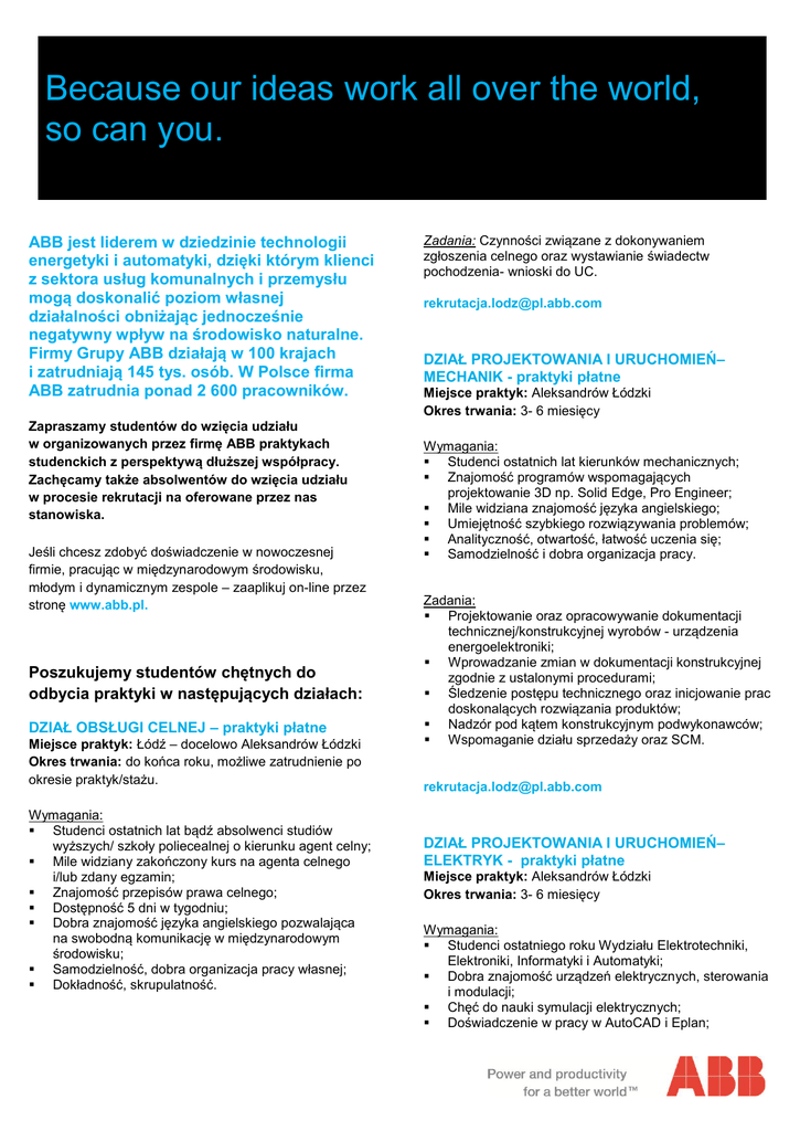 Because our ideas work all over the world, so can you. ABB jest liderem w dziedzinie technologii energetyki i automatyki, dzięki którym klienci z sektora usług komunalnych i przemysłu mogą doskonalić poziom własnej działalności obniżając jednocześnie negatywny wpływ na środowisko naturalne. Firmy Grupy ABB działają w 100 krajach i zatrudniają 145 tys. osób. W Polsce firma ABB zatrudnia ponad 2 600 pracowników. Zapraszamy studentów do wzięcia udziału w organizowanych przez firmę ABB praktykach studenckich z perspektywą dłuższej współpracy. Zachęcamy także absolwentów do wzięcia udziału w procesie rekrutacji na oferowane przez nas stanowiska. Jeśli chcesz zdobyć doświadczenie w nowoczesnej firmie, pracując w międzynarodowym środowisku, młodym i dynamicznym zespole – zaaplikuj on-line przez stronę www.abb.pl. Poszukujemy studentów chętnych do odbycia praktyki w następujących działach: DZIAŁ OBSŁUGI CELNEJ – praktyki płatne Miejsce praktyk: Łódź – docelowo Aleksandrów Łódzki Okres trwania: do końca roku, możliwe zatrudnienie po okresie praktyk/stażu. Wymagania: Studenci ostatnich lat bądź absolwenci studiów wyższych/ szkoły poliecealnej o kierunku agent celny; Mile widziany zakończony kurs na agenta celnego i/lub zdany egzamin; Znajomość przepisów prawa celnego; Dostępność 5 dni w tygodniu; Dobra znajomość języka angielskiego pozwalająca na swobodną komunikację w międzynarodowym środowisku; Samodzielność, dobra organizacja pracy własnej; Dokładność, skrupulatność. Zadania: Czynności związane z dokonywaniem zgłoszenia celnego oraz wystawianie świadectw pochodzenia- wnioski do UC. [email protected] DZIAŁ PROJEKTOWANIA I URUCHOMIEŃ– MECHANIK - praktyki płatne Miejsce praktyk: Aleksandrów Łódzki Okres trwania: 3- 6 miesięcy Wymagania: Studenci ostatnich lat kierunków mechanicznych; Znajomość programów wspomagających projektowanie 3D np. Solid Edge, Pro Engineer; Mile widziana znajomość języka angielskiego; Umiejętność szybkiego rozwiązywania problemów; Analityczność, otwartość, łatwość uczenia się; Samodzielność i dobra organizacja pracy. Zadania: Projektowanie oraz opracowywanie dokumentacji technicznej/konstrukcyjnej wyrobów - urządzenia energoelektroniki; Wprowadzanie zmian w dokumentacji konstrukcyjnej zgodnie z ustalonymi procedurami; Śledzenie postępu technicznego oraz inicjowanie prac doskonalących rozwiązania produktów; Nadzór pod kątem konstrukcyjnym podwykonawców; Wspomaganie działu sprzedaży oraz SCM. [email protected] DZIAŁ PROJEKTOWANIA I URUCHOMIEŃ– ELEKTRYK - praktyki płatne Miejsce praktyk: Aleksandrów Łódzki Okres trwania: 3- 6 miesięcy Wymagania: Studenci ostatniego roku Wydziału Elektrotechniki, Elektroniki, Informatyki i Automatyki; Dobra znajomość urządzeń elektrycznych, sterowania i modulacji; Chęć do nauki symulacji elektrycznych; Doświadczenie w pracy w AutoCAD i Eplan; Chęć rozwoju w obszarze Energoelektroniki; Umiejętność pracy zarówno samodzielnej jak i w zespole; Dobra znajomość języka angielskiego pozwalająca na swobodną komunikację w międzynarodowym środowisku; Komunikatywność, zdolności analityczne; Zorganizowanie. Zadania: Projektowanie oraz opracowywanie dokumentacji technicznej/konstrukcyjnej wyrobów - urządzenia energoelektroniki; Wprowadzanie zmian w dokumentacji konstrukcyjnej zgodnie z ustalonymi procedurami; Śledzenie postępu technicznego oraz inicjowanie prac doskonalących rozwiązania produktów; Nadzór pod kątem konstrukcyjnym podwykonawców; Wspomaganie działu sprzedaży oraz SCM. [email protected]