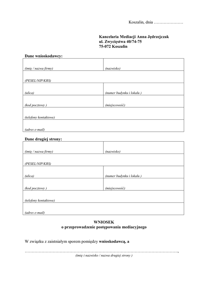 Koszalin, dnia ………………… Kancelaria Mediacji Anna Jędrzejczak ul. Zwycięstwa 40/74-75 75-072 Koszalin Dane wnioskodawcy: (imię / nazwa firmy) (nazwisko) (PESEL/NIP/KRS) (ulica) (numer budynku i lokalu ) (kod pocztowy ) (miejscowość) (telefony kontaktowe) (adres e-mail) Dane drugiej strony: (imię / nazwa firmy) (nazwisko) (PESEL/NIP/KRS) (ulica) (numer budynku i lokalu ) (kod pocztowy ) (miejscowość) (telefony kontaktowe) (adres e-mail) WNIOSEK o przeprowadzenie postępowania mediacyjnego W związku z zaistniałym sporem pomiędzy wnioskodawcą, a …………………………………………….…………………………………………………., (imię i nazwisko / nazwa drugiej strony ) składam wniosek o przeprowadzenie postępowania mediacyjnego przez mediatora sądowego Annę Jędrzejczak, w sprawie dotyczącej …………………………………..……………………………………………………………. ( przedmiot sporu ) o wartości ……………………….... zł ( słownie: ……………………………. złotych) Zobowiązuję się do uiszczenia opłaty wstępnej wynoszącej 100,00 zł Wnoszę do mediatora o skontaktowanie się z drugą Stroną i uzyskanie przez niego zgody drugiej strony na warunki mediacji oraz osobę mediatora. Oświadczam, że spór ten nie jest rozpatrywany obecnie przez sąd powszechny / spór tej jest obecnie rozpatrywany przez Sąd …………………….. w miejscowości ……………………pod sygn. akt ……………………………………………* Wyrażam zgodę na przetwarzanie moich danych osobowych zawartych w niniejszym wniosku o przeprowadzenie postępowania mediacyjnego dla potrzeb niezbędnych do realizacji mediacji ( zgodnie z ustawą z dnia 29 sierpnia 1997 r. o ochronie danych osobowych ). …………………………… (czytelny podpis wnioskodawcy ) * Wykreślić nieprawidłowe odpowiedzi i uzupełnić dane
