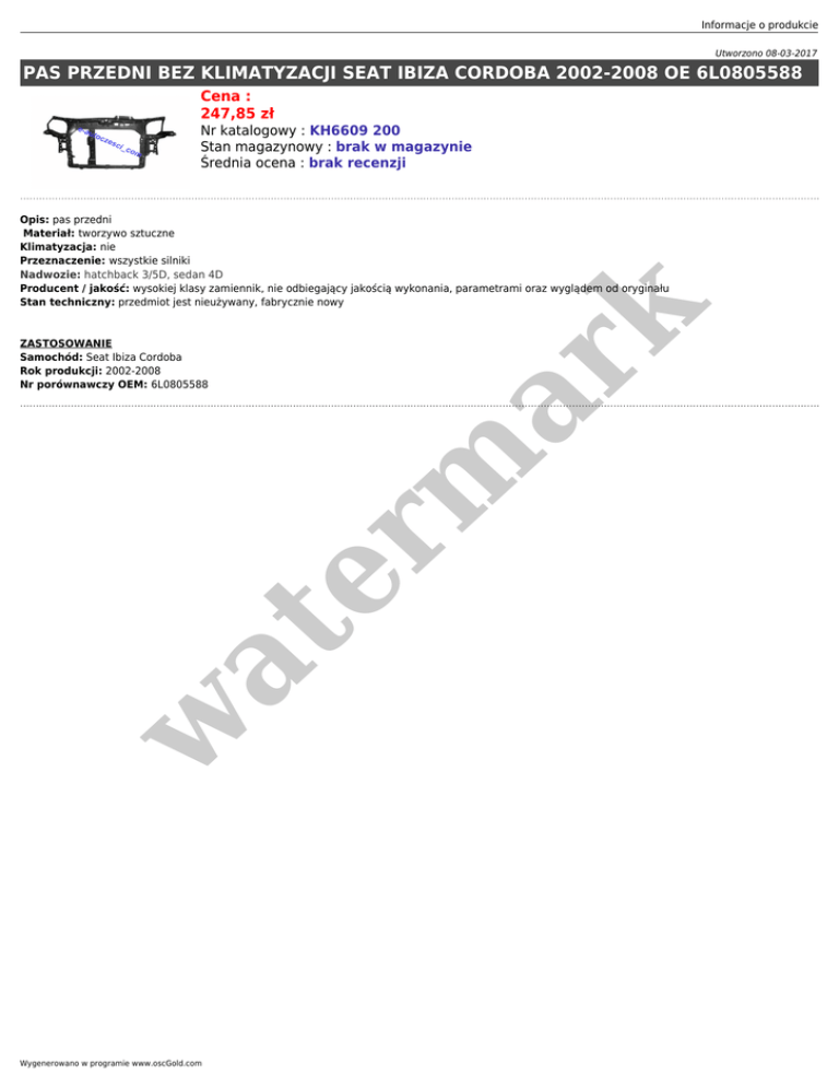 Informacje o produkcie Utworzono 08-03-2017 PAS PRZEDNI BEZ KLIMATYZACJI SEAT IBIZA CORDOBA 2002-2008 OE 6L0805588 Cena : 247,85 zł Nr katalogowy : KH6609 200 Stan magazynowy : brak w magazynie Średnia ocena : brak recenzji w at ZASTOSOWANIE Samochód: Seat Ibiza Cordoba Rok produkcji: 2002-2008 Nr porównawczy OEM: 6L0805588 er m ar k Opis: pas przedni Materiał: tworzywo sztuczne Klimatyzacja: nie Przeznaczenie: wszystkie silniki Nadwozie: hatchback 3/5D, sedan 4D Producent / jakość: wysokiej klasy zamiennik, nie odbiegający jakością wykonania, parametrami oraz wyglądem od oryginału Stan techniczny: przedmiot jest nieużywany, fabrycznie nowy Wygenerowano w programie www.oscGold.com
