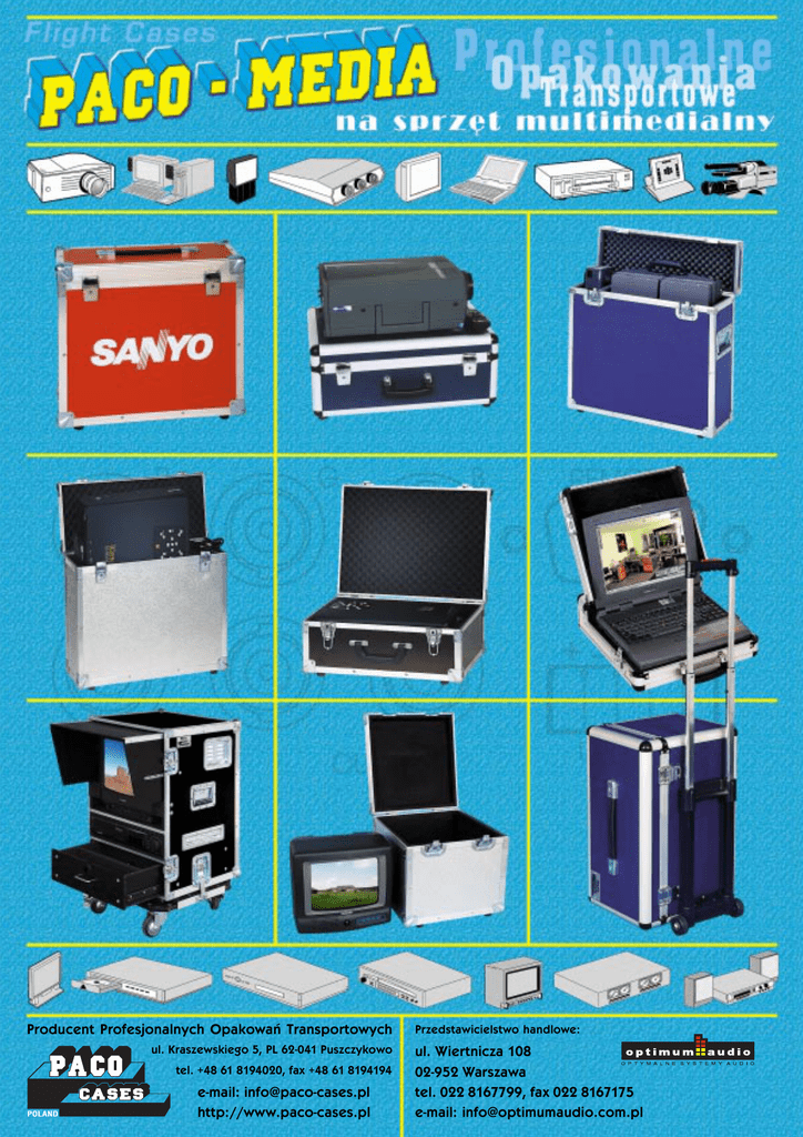 Producent Profesjonalnych Opakowań Transportowych ul. Kraszewskiego 5, PL 62-041 Puszczykowo tel. +48 61 8194020, fax +48 61 8194194 e-mail: [email protected] http://www.paco-cases.pl Przedstawicielstwo handlowe: ul. Wiertnicza 108 02-952 Warszawa tel. 022 8167799, fax 022 8167175 e-mail: [email protected]