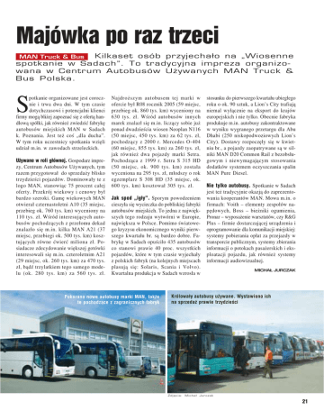 Majówka po raz trzeci Kilkaset osób przyjechało na „Wiosenne spotkanie w Sadach”. To tradycyjna impreza organizo− wana w Centrum Autobusów Używanych MAN Truck & Bus Polska. MAN Truck & Bus S potkanie organizowane jest corocz− nie i trwa dwa dni. W tym czasie dotychczasowi i potencjalni klienci firmy mogą bliżej zapoznać się z ofertą han− dlową spółki, jak również zwiedzić fabrykę autobusów miejskich MAN w Sadach k. Poznania. Jest też coś „dla ducha”. W tym roku uczestnicy spotkania wzięli udział m.in. w zawodach strzeleckich. Używane w roli głównej. Gospodarz impre− zy, Centrum Autobusów Używanych, tym razem przygotował do sprzedaży blisko trzydzieści pojazdów. Dominowały te z logo MAN, stanowiąc 75 procent całej oferty. Przekrój wiekowy i cenowy był bardzo szeroki. Gamę wiekowych MAN otwierał czternastoletni A10 (35 miejsc, przebieg ok. 760 tys. km) wyceniony na 110 tys. zł. Wśród interesujących auto− busów pochodzących z przełomu dekad znalazło się m.in. kilka MAN A21 (37 miejsc, przebiegi ok. 500 tys. km) kosz− tujących równe ćwierć miliona zł. Po− siadacze zdecydowanie większej gotówki interesowali się m.in. czteroletnim A21 (29 miejsc, ok. 260 tys. km) za 470 tys. zł, bądź trzylatkiem tego samego mode− lu (ok. 280 tys. km) za 560 tys. zł. Najdroższym autobusem tej marki w ofercie był R08 rocznik 2005 (59 miejsc, przebieg ok. 860 tys. km) wyceniony na 630 tys. zł. Wśród autobusów innych marek znalazł się m.in. liczący sobie już ponad dwadzieścia wiosen Neoplan N116 (50 miejsc, 450 tys. km) za 62 tys. zł, pochodzący z 2000 r. Mercedes O−404 (60 miejsc, 855 tys. km) za 260 tys. zł, jak również dwa pojazdy marki Setra. Pochodząca z 1999 r. Setra S 315 HD (50 miejsc, ok. 900 tys. km) została wyceniona na 295 tys. zł, młodszy o rok egzemplarz S 308 HD (35 miejsc, ok. 600 tys. km) kosztował 305 tys. zł. Jak spod „igły”. Sporym powodzeniem cieszyła się wycieczka do pobliskiej fabryki autobusów miejskich. To jedna z najwięk− szych tego rodzaju wytwórni w Europie, największa w Polsce. Pomimo światowe− go kryzysu ekonomicznego wyniki pierw− szego kwartału br. są bardzo dobre. Fa− brykę w Sadach opuściło 435 autobusów co stanowi prawie 40 proc. wszystkich pojazdów, które w tym czasie wyjechały z polskich fabryk (na kolejnych miejscach plasują się: Solaris, Scania i Volvo). Kwartalna produkcja w Sadach wzrosła w Pokazano nowe autobusy marki MAN, także te pochodzące z zagranicznych fabryk stosunku do pierwszego kwartału ubiegłego roku o ok. 90 sztuk, a Lion’s City trafiają niemal wyłącznie na eksport do krajów europejskich i nie tylko. Obecnie fabryka produkuje m.in. autobusy zakontraktowane w wyniku wygranego przetargu dla Abu Dhabi (250 niskopodwoziowych Lion’s City). Dostawy rozpoczęły się w kwiet− niu br., a pojazdy zaopatrywane są w sil− niki MAN D20 Common Rail z bezobsłu− gowym i niewymagającym stosowania dodatków systemem oczyszczania spalin MAN Pure Diesel. Nie tylko autobusy. Spotkanie w Sadach jest też tradycyjnie okazją do zaprezento− wania kooperantów MAN. Mowa m.in. o firmach: Voith – elementy zespołów na− pędowych, Boss – bieżniki ogumienia, Pronar – wyposażenie warsztatów, czy R&G Plus – firmie dostarczającej urządzenia i oprogramowanie dla komunikacji miejskiej: systemy pobierania opłat za przejazdy w transporcie publicznym, systemy zbierania informacji o potokach pasażerskich i eks− ploatacji pojazdu, jak również systemy informacji audiowizualnej. MICHAŁ JURCZAK Królowały autobusy używane. Wystawiono ich na sprzedaż prawie trzydzieści Zdjęcia: Michał Jurczak 21