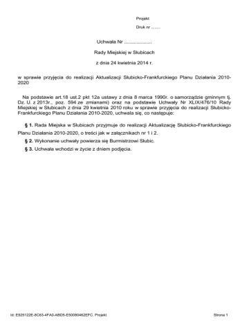 Projekt Druk nr ........ Uchwała Nr .................... Rady Miejskiej w Słubicach z dnia 24 kwietnia 2014 r. w sprawie przyjęcia do realizacji Aktualizacji Słubicko-Frankfurckiego Planu Działania 20102020 Na podstawie art.18 ust.2 pkt 12a ustawy z dnia 8 marca 1990r. o samorządzie gminnym tj. Dz. U. z 2013r., poz. 594 ze zmianami) oraz na podstawie Uchwały Nr XLIX/476/10 Rady Miejskiej w Słubicach z dnia 29 kwietnia 2010 roku w sprawie przyjęcia do realizacji SłubickoFrankfurckiego Planu Działania 2010-2020, uchwala się, co następuje: § 1. Rada Miejska w Słubicach przyjmuje do realizacji Aktualizację Słubicko-Frankfurckiego Planu Działania 2010-2020, o treści jak w załącznikach nr 1 i 2. § 2. Wykonanie uchwały powierza się Burmistrzowi Słubic. § 3. Uchwała wchodzi w życie z dniem podjęcia. Id: E925122E-8C63-4FA0-ABD5-E50080462EFC. Projekt Strona 1 Załącznik Nr 1 do Uchwały Nr .................... Rady Miejskiej w Słubicach z dnia 24 kwietnia 2014 r. Aktualizacja Słubicko-Frankfurckiego Planu Działania na lata 20102020 w odniesieniu do nowej perspektywy programowej UE 20142020 Autor: Słubicko-Frankfurckie Centrum Kooperacji Gmina Słubice/Miasto Frankfurt nad Odrą 1 Id: E925122E-8C63-4FA0-ABD5-E50080462EFC. Projekt Strona 2 Spis treści Część 1. Wprowadzenie 3 Część 2. Bilans wdrażania Słubicko-Frankfurckiego Planu Działania w latach 2010-2013 5 Część 3. Hasło i wizja dla Słubic i Frankfurtu nad Odrą 2020 16 Część 4. Wnioski końcowe dotyczące współpracy transgranicznej obu miast ( 2014-2020) 17 Część 5. Trzy nadrzędne cele strategiczne, 15 kierunków rozwoju i wskaźniki zmierzające do osiągnięcia ww. celów 19 Część 6. Planowane projekty i działania na lata 2014-2020 27 Załącznik nr 1: Tabela- Przegląd celów, kierunków rozwoju, projektów i działań 2 Id: E925122E-8C63-4FA0-ABD5-E50080462EFC. Projekt Strona 3 Część 1. Wprowadzenie Miasta Słubice i Frankfurt nad Odrą mogą dużo zyskać dzięki swojej przestrzennej bliskości, różnorodnym powiązaniom między obszarami miejskimi, wyzwaniom teraźniejszości i przyszłości głównie poprzez ukierunkowaną na osiągnięcie celu współpracę w wielu dziedzinach. W tym celu konieczne jest, aby obie administracje dysponowały odpowiednim instrumentarium, które składało się bedzie z: 1. Długoterminowej, wspólnej strategii zorientowanej z jednej strony na znalezieniu rozwiązań istotnych problemów, z drugiej na wykorzystaniu własnych mocnych stron i potencjału rozwoju koncentrującej się na uzyskaniu wsparcia na poziomie lokalnym, regionalnym, krajowym i europejskim. 2. Wspólnych, trwałych projektów, dzięki realizacji których strategia będzie mogła być wdrażana. 3. Wspólnej struktury, koordynującej i wspierającej wdrażanie strategii i projektów. Słubicko-Frankfurcki Plan Działania 2010-2020, przyjęty uchwałą przez obie Rady Miejskie w dniu 29 kwietnia 2010 roku określa wspólną wizję i projekty. Dla ich realizacji powstały nowe struktury i zasilone zostały struktury już istniejące. Obecnie istnieje potrzeba aktualizacji listy projektów zamieszczonych w wersji planu z dnia 29.04.2010 roku. Wiąże się to z tym, że w latach 2010-2013 na ogólną liczbę 22 projektów 11 zostało w całości lub częściowo zrealizowanych. Ponadto rozpoczętych i zakończonych zostało 17 dodatkowych projektów1. Aby móc osiągnąć 24 cele strategiczne obrane w 2010 roku, należy do 2020 roku zrealizować nowe projekty względnie działania2. Słubicko-Frankfurcki Plan Działania na lata 2010-2020 wymaga aktualizacji z trzech powodów: 1. Występujących w ostatnich trzech latach nowych problemów głównie natury gospodarczej, z którymi chcielibyśmy się wspólnie zmierzyć. 2. Pozytywnych rezultatów w dziedzinie transgranicznej, publicznej komunikacji miejskiej, wspólnego marketingu i turystyki wodnej otwierających nowe mozliwości rozwoju. 3. Analizy kierunków wsparcia UE do 2020, jak również istotnych dokumentów strategicznych szczebla krajowego, regionalnego oraz lokalnego wyznaczających nowe wyzwania i szanse, które w zwiększonym zakresie musimy wykorzystać. 1 2 Patrz: Część 2, Bilans wdrażania Słubicko-Frankfurckiego Planu Działania w latach 2010-2013, s. 5. Patrz: Część 6, Planowane projekty i działania na lata 2014-2020, s. 27. 3 Id: E925122E-8C63-4FA0-ABD5-E50080462EFC. Projekt Strona 4 Przy sporządzaniu dokumentu wykorzystane zostały dokumenty3, zbiory danych4 i analiz5 oraz wytyczne UE określające możliwość pozyskania dofinansowania w latach 2014-20206. Słubicko-Frankfurckie Centrum Kooperacji jako wspólne biuro obu miast w sierpniu 2012 roku zwróciło się do wydziałów merytorycznych obu administracji, instytyucji oświatowych, instytucji kultury i nauki oraz przedstawicieli gospodarki z prośbą o przygotowanie propozycj polsko-niemieckich projektów. Pod koniec 2012 roku kierownictwa obu miast dokonały pierwszej oceny 50 projektów. Rezultatem trzech warsztatów strategicznych i określenia przez UE obszarów wsparcia przewidzianych na lata 2014-2020, a także aktualizacji Frankfurckiej Zintegrowanej Koncepcji Rozwoju Miejskiego (INSEK) i Strategii Gminy Słubice lista projektów została ponownie zmieniona. W związku z powyższym Słubicko-Frankfurckie Centrum Kooperacji przedłożyło projekt aktualizacji Planu Działania wyposażony w 3 nadrzędne cele strategiczne, 15 kierunków rozwoju i 46 propozycje projektów do realizacji w latach 2014-20207. Przedkładany dokument ma na celu dążenie do tego aby oba miasta miały na pograniczu polsko-niemieckim unikatowy charakter, który w sposób szczególny będzie odnosił się do mocnych stron Słubic i Frankfurtu nad Odrą jako Dwumiasta. Dokumentem chcemy dać odpowiedź na pytanie, w jakich dziedzinach rozwoju miejskiego Słubice i Frankfurt nad Odrą poprzez synergię, względnie poprzez ukierunkowane na cel działania mogą rozwiązy