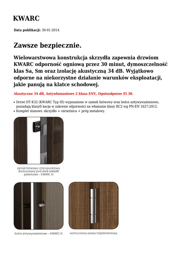 KWARC Data publikacji: 30-01-2014 Zawsze bezpiecznie. Wielowarstwowa konstrukcja skrzydła zapewnia drzwiom KWARC odporność ogniową przez 30 minut, dymoszczelność klas Sa, Sm oraz izolację akustyczną 34 dB. Wyjątkowo odporne na niekorzystne działanie warunków eksploatacji, jakie panują na klatce schodowej. Akustyczne 34 dB, Antywłamaniowe 2 klasa ENV, Ognioodporne EI 30. ● ● Drzwi DT-K32 (KWARC Typ III) wyposażone w zamek listwowy oraz bolce antywyważeniowe, posiadają klasyfi kację w zakresie odporności na włamanie klasy RC2 wg PN-EN 1627:2012. Komplet stanowi: skrzydło + ościeżnica + próg metalowy. Konstrukcja skrzydła Ramę skrzydła wykonano z tarcicy drewna egzotycznego. Poszycie skrzydła stanowi warstwa aluminium i płyta drewnopochodna. Dostępne skrzydła uzupełnione aluminiowymi intarsjami w kolorze srebrnym lub czarnym. Okleiny naturalne wykończone lakierem matowym. Akcesoria w cenie skrzydła ● ● ● ● ● ● ● Zamek wpuszczany z zasuwką prostokątną pod wkładkę patent (KWARC typ I) Dwa zamki wpuszczane z zasuwką prostokątną pod wkładkę patent (KWARC typ II) Zamek listwowy czteropunktowy dostosowany pod dwie wkładki patentowe i trzy bolce antywyważeniowe (KWARC typ III) Trzy wzmocnione zawiasy trójelementowe w kolorze srebrnym Wizjer szerokokątny w kolorze srebrnym (opcja) Uszczelka pęczniejąca pod wpływem wysokiej temperatury we wrębie skrzydła Ościeżnica wyposażona w próg ze stali nierdzewnej standardowy (90 mm) Ościeżnice ● ● Ościeżnica metalowa kątowa, o szerokości profi lu 100 mm. Wykonana z blachy stalowej, dwustronnie ocynkowanej, o grubości 1,5 mm Wyposażona w uszczelkę ognioodporną, trzy zawiasy czopowe standard, próg metalowy ze stali nierdzewnej w wersji standardowej (90 mm), wzmocnienie pod samozamykacz KWARC I posiada zaczep pod jeden zamek, KWARC II – pod dwa zamki, KWARC III – pod zamek listwowy oraz sześć dybli montażowych i otwory pod bolce antywyważeniowe Ościeżnica PROJEKT Uwagi ● ● ● ● ● Aprobata Techniczna AT-15-3575/2009 ITB Warszawa. Certyfi kat Zgodności Nr ITB - 0567/W, ITB Warszawa. Przygotowanie do skrótu (maksymalnie o 60 mm). W celu spełnienia warunków Aprobaty Technicznej, do drzwi KWARC należy stosować samozamykacz Klasa izolacyjności akustycznej Rw = 32 dB (zakres 32 ÷ 36 dB). Dopłaty ● ● ● ● ● ● ● ● ● ● ● rozmiar „100” wkładki patentowe *pokrycie okleiną naturalną satin pokrycie okleiną naturalną Dąb Biały (RAL 9016) ramka 1 (na 1 stronę, na dwie strony cena x 2) ramka 2 (na 1 stronę, na dwie strony cena x 2) ramka 3 (na 1 stronę, na dwie strony cena x 2) ramka 4 (na 1 stronę, na dwie strony cena x 2) intarsje srebrne w okleinach syntetycznych (na 1 stronę, na 2 strony cena x2) intarsje srebrne w okleinach naturalnych (na 1 stronę, na 2 strony cena x2) intarsje srebrne lub czarne wyłącznie dla kolekcji frezowane OFFICE – dotyczy modeli 6–9 ● ● ● ● rozszerzenie profi lu ościeżnicy od 101 do 150 mm rozszerzenie profi lu ościeżnicy od 151 do 270 mm rozszerzenie profi lu ościeżnicy od 271 do 390 mm klamka z szyldem, szyld górny Kolorystyka
