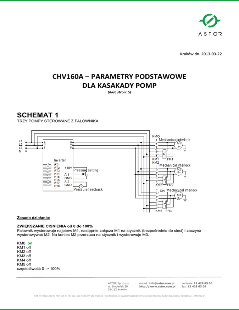 Kraków dn. 2013-03-22 CHV160A – PARAMETRY PODSTAWOWE DLA KASAKADY POMP (ilość stron: 5) SCHEMAT 1 TRZY POMPY STEROWANE Z FALOWNIKA Zasada działania: ZWIĘKSZANIE CISNIENIA od 0 do 100% Falownik wysterowuje najpierw M1, następnie załącza M1 na stycznik (bezpośrednio do sieci) i zaczyna wysterowywać M2. Na koniec M2 przerzuca na stycznik i wysterowuje M3. KM0 on KM1 off KM2 off KM3 off KM4 off KM5 off częstotliwość 0 -> 100% ASTOR Sp. z o.o. ul. Smoleńsk 29 31-112 Kraków e-mail: [email protected] http://www.astor.com.pl centrala: 12 428 63 00 fax: 12 428 63 09 KRS nr: 0000120940, NIP: 676-01-05-127, Sąd Rejonowy dla Krakowa - Śródmieścia, XI Wydział Gospodarczy Krajowego Rejestru Sądowego, Kapitał zakładowy: 1 000 000 zł KM0 off KM1 on KM2 on KM3 off KM4 off KM5 off częstotliwość 0 -> 100% KM0 off KM1 on KM2 off KM3 on KM4 on KM5 off częstotliwość 0 -> 100% ZMNIEJSZANIE CISNIENIA od 100 do 0%. W przypadku gdy wszystkie pompy są wysterowane w 100%, falownik najpierw zaczyna zmniejszać M3 do 0 Hz, dopiero wtedy wyłącza stycznik na M2 (odłącza pompę), równocześnie zwiększa M3 do 100%. Kolejno jak M3 zejdzie znowu do 0 wyłącza stycznik na M1 i podnosi M3 do 100%. Na koniec zjeżdża z częstotliwością na M3 do 0 Hz (jest to stan kiedy wszystkie trzy pompy są wyłączone). KM0 off KM1 on KM2 off KM3 on KM4 on KM5 off częstotliwość 100 -> 0% KM0 off KM1 on KM2 off KM3 off KM4 on KM5 off częstotliwość 100 -> 0% KM0 off KM1 off KM2 off KM3 off KM4 on KM5 off częstotliwość 100 -> 0% USTAWIENIE GŁÓWNYCH PARAMETRÓW: P8.00 - > 1 załączenie karty “WATER SUPPLY CARD” P8.01 - > 1 załączenie “Circular FRQ”, falownik może obsłużyć więcej, aniżeli jedną pompę sterowaną z falownika P8.03 - > 1 załączenie pompy A jako falownikowej P8.04 - > 1 załączenie pompy B jako falownikowej P8.05 - > 1 załączenie pompy C jako falownikowej P2.00 – P2.07 - > dostroić zgodnie z tablicą znamionową pomp ASTOR Sp. z o.o. ul. Smoleńsk 29 31-112 Kraków e-mail: [email protected] http://www.astor.com.pl centrala: 12 428 63 00 fax: 12 428 63 09 KRS nr: 0000120940, NIP: 676-01-05-127, Sąd Rejonowy dla Krakowa - Śródmieścia, XI Wydział Gospodarczy Krajowego Rejestru Sądowego, Kapitał zakładowy: 1 000 000 zł P0.02 -> 0 tutaj należy zastosować nastawy fabryczne P0.03 -> 0 tutaj należy zastosować nastawy fabryczne P3.00 – P3.18 - > należy dostroić PID P6.03 - > 1 wyjście przekaźnikowe RT1 jako sygnał dla stycznika KM0 P6.04 - > 2 wyjście przekaźnikowe RT2 jako sygnał dla stycznika KM1 P6.05 - > 3 wyjście przekaźnikowe RT3 jako sygnał dla stycznika KM2 P6.06 - > 4 wyjście przekaźnikowe RT4 jako sygnał dla stycznika KM3 P6.07 - > 5 wyjście przekaźnikowe RT5 jako sygnał dla stycznika KM4 P6.08 - > 6 wyjście przekaźnikowe RT6 jako sygnał dla stycznika KM5 Ta konfiguracja zapewnia wysterowanie trzech pomp z falownika w kaskadzie. Dodatkowo można zmodyfikować parametry związane z czasami (martwy czas pomiędzy przełączeniami na dodatkowe pompy, czasy przyspieszania i hamowania etc.) Zmiana pomp wiodących w obrębie grup (sterowanie stycznikowe i falownikowe) odbywa się w parametrach: P8.24 P8.25 ASTOR Sp. z o.o. ul. Smoleńsk 29 31-112 Kraków e-mail: [email protected] http://www.astor.com.pl centrala: 12 428 63 00 fax: 12 428 63 09 KRS nr: 0000120940, NIP: 676-01-05-127, Sąd Rejonowy dla Krakowa - Śródmieścia, XI Wydział Gospodarczy Krajowego Rejestru Sądowego, Kapitał zakładowy: 1 000 000 zł SCHEMAT 2 TRZY POMPY, JEDNA STEROWANA Z FALOWNIKA, DWIE PODPIĘTE NA SZTYWNO DO SIECI (STEROWANE STYCZNIKOWO) Zasada działania: ZWIĘKSZANIE CISNIENIA od 0 do 100% Falownik wysterowuje najpierw M1 od 0 do 100%, następnie załącza M2 na stycznik (bezpośrednio do sieci) równocześnie zmniejszając częstotliwość M1 do 0 Hz. Na koniec M3 przerzuca na stycznik jak poprzednio równocześnie zmniejszając M1 do 0 Hz. KM0 on KM1 off KM2 off KM3 off częstotliwość 0 -> 100% KM0 on KM1 off KM2 on KM3 off częstotliwość 0 -> 100% KM0 on KM1 off KM2 on KM3 on częstotliwość 0 -> 100% ZMNIEJSZANIE CISNIENIA od 100 do 0%. W przypadku gdy wszystkie pompy są wysterowane w 100%, falownik najpierw zaczyna zmniejszać M1 do 0 Hz, dopiero wtedy wyłącza stycznik na M2 (odłącza pompę), równocześnie zwiększa M1 do 100%. Kolejno jak M1 zejdzie znowu do 0 wyłącza stycznik na M3 i podnosi M1 do 100%. Na koniec zjeżdża z częstotliwością na M1 do 0 Hz (jest to stan kiedy wszystkie trzy pompy są wyłączone). KM0 on KM1 off ASTOR Sp. z o.o. ul. Smoleńsk 29 31-112 Kraków e-mail: [email protected] http://www.astor.com.pl centrala: 12 428 63 00 fax: 12 428 63 09 KRS nr: 0000120940, NIP: 676-01-05-127, Sąd Rejonowy dla Krakowa - Śródmieścia, XI Wydział Gospodarczy Krajowego Rejestru Sądowego, Kapitał zakładowy: 1 000 000 zł KM2 on KM3 on częstotliwość 0 -> 100% KM0 on KM1 off KM2 off KM3 on częstotliwość 0 -> 100% KM0 on KM1 off KM2 off KM3 off częstotliwość 0 -> 100% USTAWIENIE GŁÓWNYCH PARAMETRÓW: P8.00 - > 1 załączenie karty “WATER SUPPLY CARD” P8.01 - > 1 załączenie “Circular FRQ”, falownik może obsłużyć więcej, aniżeli jedną pompę sterowaną z falownika P8.03 - > 1 załączenie pompy A jako falownikowej P8.04 - > 2 załączenie pompy B jako stycznikowej P8.05 - > 2 załączenie pompy C jako stycznikowej P2.00 – P2.07 - > dostroić zgodnie z tablicą znamionową pomp P0.02 -> 0 tutaj należy zastosować nastawy fabryczne P0.03 -> 0 tutaj należy zastosować nastawy fabryczne P3.00 – P3.18 - > należy dostroić PID P6.03 - > 1 wyjście przekaźnikowe RT1 jako sygnał dla stycznika KM0 P6.04 - > 2 wyjście przekaźnikowe RT2 jako sygnał dla stycznika KM1 P6.05 - > 4 wyjście przekaźnikowe RT3 jako sygnał dla stycznika KM2 P6.06 - > 6 wyjście przekaźnikowe RT4 jako sygnał dla stycznika KM3 Ta konfiguracja zapewnia wysterowanie trzech pomp z falownika w kaskadzie