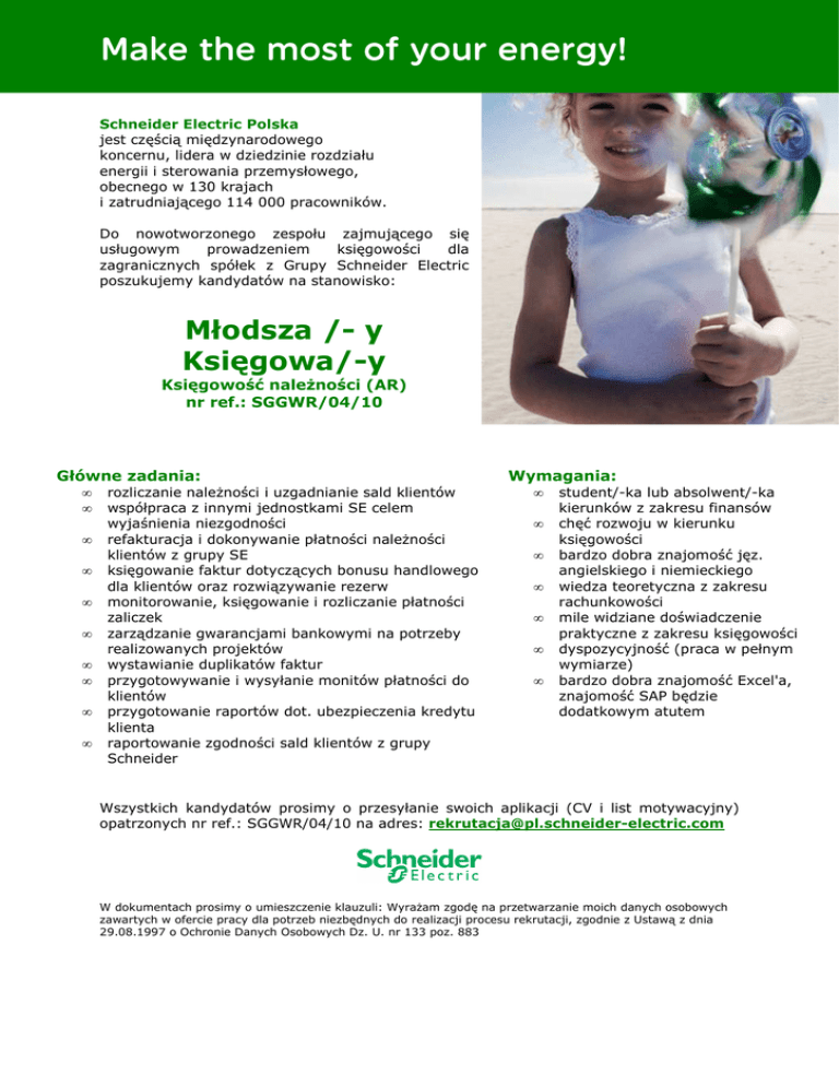 Make the most of your energy! Schneider Electric Polska jest częścią międzynarodowego koncernu, lidera w dziedzinie rozdziału energii i sterowania przemysłowego, obecnego w 130 krajach i zatrudniającego 114 000 pracowników. Do nowotworzonego zespołu zajmującego się usługowym prowadzeniem księgowości dla zagranicznych spółek z Grupy Schneider Electric poszukujemy kandydatów na stanowisko: Młodsza /- y Księgowa/-y Księgowość naleŜności (AR) nr ref.: SGGWR/04/10 Główne zadania: • • • • • • • • • • rozliczanie naleŜności i uzgadnianie sald klientów współpraca z innymi jednostkami SE celem wyjaśnienia niezgodności refakturacja i dokonywanie płatności naleŜności klientów z grupy SE księgowanie faktur dotyczących bonusu handlowego dla klientów oraz rozwiązywanie rezerw monitorowanie, księgowanie i rozliczanie płatności zaliczek zarządzanie gwarancjami bankowymi na potrzeby realizowanych projektów wystawianie duplikatów faktur przygotowywanie i wysyłanie monitów płatności do klientów przygotowanie raportów dot. ubezpieczenia kredytu klienta raportowanie zgodności sald klientów z grupy Schneider Wymagania: • • • • • • • student/-ka lub absolwent/-ka kierunków z zakresu finansów chęć rozwoju w kierunku księgowości bardzo dobra znajomość jęz. angielskiego i niemieckiego wiedza teoretyczna z zakresu rachunkowości mile widziane doświadczenie praktyczne z zakresu księgowości dyspozycyjność (praca w pełnym wymiarze) bardzo dobra znajomość Excel'a, znajomość SAP będzie dodatkowym atutem Wszystkich kandydatów prosimy o przesyłanie swoich aplikacji (CV i list motywacyjny) opatrzonych nr ref.: SGGWR/04/10 na adres: [email protected] W dokumentach prosimy o umieszczenie klauzuli: WyraŜam zgodę na przetwarzanie moich danych osobowych zawartych w ofercie pracy dla potrzeb niezbędnych do realizacji procesu rekrutacji, zgodnie z Ustawą z dnia 29.08.1997 o Ochronie Danych Osobowych Dz. U. nr 133 poz. 883
