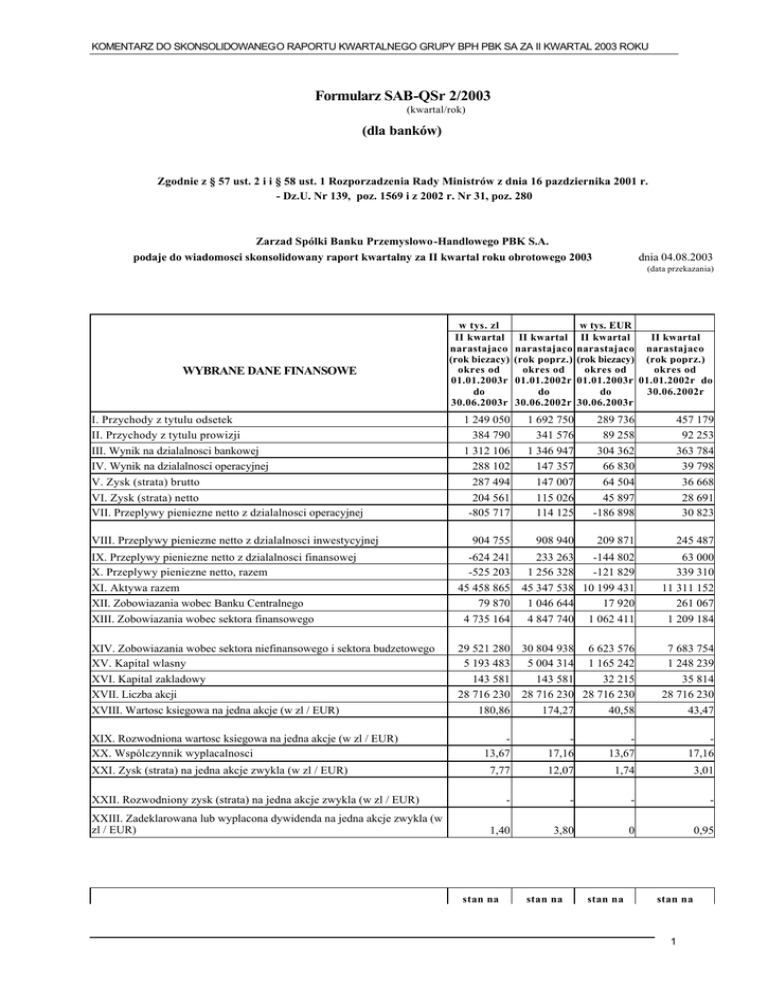 KOMENTARZ DO SKONSOLIDOWANEGO RAPORTU KWARTALNEGO GRUPY BPH PBK SA ZA II KWARTAL 2003 ROKU Formularz SAB-QSr 2/2003 (kwartal/rok) (dla banków) Zgodnie z § 57 ust. 2 i i § 58 ust. 1 Rozporzadzenia Rady Ministrów z dnia 16 pazdziernika 2001 r. - Dz.U. Nr 139, poz. 1569 i z 2002 r. Nr 31, poz. 280 Zarzad Spólki Banku Przemyslowo-Handlowego PBK S.A. podaje do wiadomosci skonsolidowany raport kwartalny za II kwartal roku obrotowego 2003 dnia 04.08.2003 (data przekazania) WYBRANE DANE FINANSOWE I. Przychody z tytulu odsetek II. Przychody z tytulu prowizji III. Wynik na dzialalnosci bankowej IV. Wynik na dzialalnosci operacyjnej V. Zysk (strata) brutto VI. Zysk (strata) netto VII. Przeplywy pieniezne netto z dzialalnosci operacyjnej VIII. Przeplywy pieniezne netto z dzialalnosci inwestycyjnej w tys. zl II kwartal narastajaco (rok biezacy) okres od 01.01.2003r do 30.06.2003r II kwartal narastajaco (rok poprz.) okres od 01.01.2002r do 30.06.2002r w tys. EUR II kwartal II kwartal narastajaco narastajaco (rok biezacy) (rok poprz.) okres od okres od 01.01.2003r 01.01.2002r do do 30.06.2002r 30.06.2003r 1 249 050 384 790 1 312 106 288 102 287 494 204 561 -805 717 1 692 750 341 576 1 346 947 147 357 147 007 115 026 114 125 289 736 89 258 304 362 66 830 64 504 45 897 -186 898 457 179 92 253 363 784 39 798 36 668 28 691 30 823 904 755 908 940 209 871 245 487 IX. Przeplywy pieniezne netto z dzialalnosci finansowej X. Przeplywy pieniezne netto, razem XI. Aktywa razem XII. Zobowiazania wobec Banku Centralnego XIII. Zobowiazania wobec sektora finansowego -624 241 -525 203 45 458 865 79 870 4 735 164 233 263 -144 802 1 256 328 -121 829 45 347 538 10 199 431 1 046 644 17 920 4 847 740 1 062 411 63 000 339 310 11 311 152 261 067 1 209 184 XIV. Zobowiazania wobec sektora niefinansowego i sektora budzetowego XV. Kapital wlasny XVI. Kapital zakladowy XVII. Liczba akcji XVIII. Wartosc ksiegowa na jedna akcje (w zl / EUR) 29 521 280 5 193 483 143 581 28 716 230 180,86 30 804 938 6 623 576 5 004 314 1 165 242 143 581 32 215 28 716 230 28 716 230 174,27 40,58 7 683 754 1 248 239 35 814 28 716 230 43,47 XIX. Rozwodniona wartosc ksiegowa na jedna akcje (w zl / EUR) XX. Wspólczynnik wyplacalnosci XXI. Zysk (strata) na jedna akcje zwykla (w zl / EUR) 13,67 17,16 13,67 17,16 7,77 12,07 1,74 3,01 - - - - 1,40 3,80 0 0,95 XXII. Rozwodniony zysk (strata) na jedna akcje zwykla (w zl / EUR) XXIII. Zadeklarowana lub wyplacona dywidenda na jedna akcje zwykla (w zl / EUR) stan na stan na stan na stan na 1 KOMENTARZ DO SKONSOLIDOWANEGO RAPORTU KWARTALNEGO GRUPY BPH PBK SA ZA II KWARTAL 2003 ROKU SKONSOLIDOWANY BILANS 30.06.2003r 31.03.2003r 30.06.2002r 31.03.2002r koniec koniec koniec koniec kwartalu kwartalu kwartalu kwartalu (rok poprz.) (rok biezacy) (rok biezacy) (rok poprz.) Aktywa I. Kasa, operacje z Bankiem Centralnym II. Dluzne papiery wartosciowe uprawnione do redyskontowania w Banku Centralnym III. Naleznosci od sektora finansowego 1. Naleznosci krótkoterminowe a) w rachunku biezacym b) pozostale naleznosci krótkoterminowe 2. Naleznosci dlugoterminowe IV. Naleznosci od sektora niefinansowego 1. Naleznosci krótkoterminowe a) w rachunku biezacym b) pozostale naleznosci krótkoterminowe 2. Naleznosci dlugoterminowe V. Naleznosci od sektora budzetowego 1. Naleznosci krótkoterminowe a) w rachunku biezacym b) pozostale naleznosci krótkoterminowe 2. Naleznosci dlugoterminowe VI. Naleznosci z tytulu zakupionych papierów wartosciowych z otrzymanym przyrzeczeniem odkupu VII. Dluzne papiery wartosciowe VIII. Naleznosci od jednostek podporzadkowanych wycenianych metoda praw wlasnosci 1. Zaleznych 2. Wspólzaleznych 3. Stowarzyszonych IX. Udzialy lub akcje w jednostkach zaleznych wycenianych metoda praw wlasnosci X. Udzialy lub akcje w jednostkach wspólzaleznych wycenianych metoda praw wlasnosci XI. Udzialy lub akcje w jednostkach stowarzyszonych wycenianych metoda praw wlasnosci XII.Udzialy lub akcje w innych jednostkach XIII. Pozostale papiery wartosciowe i inne aktywa finansowe XIV. Wartosci niematerialne i prawne, w tym: - wartosc firmy XV. Wartosc firmy jednostek podporzadkowanych XVI. Rzeczowe aktywa trwale XV. Inne aktywa 1. Przejete aktywa - do zbycia 2. Zapasy 3. Pozostale XVI. Rozliczenia miedzyokresowe 1. Aktywa z tytulu odroczonego podatku dochodowego 2. Pozostale rozliczenia miedzyokresowe Aktywa razem 1 451 374 1 694 281 1 913 641 1 605 563 47 685 4 316 165 3 994 028 642 735 3 351 293 322 137 21 054 920 11 570 980 2 896 213 8 674 767 9 483 940 1 892 377 672 648 31 866 640 782 1 219 729 51 019 94 742 6 320 514 8 958 408 6 096 764 8 915 452 2 754 507 1 452 205 3 342 257 7 463 247 223 750 42 956 20 533 852 19 280 369 11 599 253 10 824 593 2 762 441 3 387 036 8 836 812 7 437 557 8 934 599 8 455 776 1 365 924 995 340 667 996 605 070 31 303 110 758 636 693 494 312 697 928 390 270 162 381 10 505 412 10 204 530 1 927 874 8 276 656 300 882 18 949 406 9 140 901 3 328 932 5 811 969 9 808 505 599 498 187 599 58 698 128 901 411 899 12 110 247 10 950 127 10 012 139 49 916 8 272 259 107 521 64 422 43 099 180 367 137 801 42 566 204 686 150 081 54 605 288 856 240 016 48 840 154 740 137 947 153 610 133 328 - - - - 6 673 20 274 29 192 35 014 1 173 111 882 256 493 258 537 643 333 364 369 997 1 970 2 080 1 146 764 1 172 210 342 728 231 430 2 572 2 642 8 119 10 435 332 037 218 353 958 153 853 696 903 776 779 376 54 377 74 320 45 385 880 45 347 538 10 275 37 179 582 203 546 124 385 610 2 302 1 174 241 738 952 3 478 10 157 725 317 747 103 645 939 101 164 44 404 998 10 621 28 413 1 394 975 483 966 311 624 1 630 1 091 601 397 001 2 559 4 972 389 470 915 629 867 377 48 252 45 458 865 Pasywa I. Zobowiazania wobec Banku Centralnego 79 870 109 727 1 046 644 229 619 2 KOMENTARZ DO SKONSOLIDOWANEGO RAPORTU KWARTALNEGO GRUPY BPH PBK SA ZA II KWARTAL 2003 ROKU II. Zobowiazania wobec sektora finansowego 1. Zobowiazania krótkoterminowe a) w rachunku biezacym b) pozostale zobowiazania krótkoterminowe 2. Zobowiazania dlugoterminowe III. Zobow