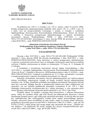 Warszawa, dnia 4 listopada 2016 r. GŁÓWNY INSPEKTOR NADZORU BUDOWLANEGO DON.7200.410.2016.KAL DECYZJA Na podstawie art. 158 § 1 w związku z art. 156 § 1 ustawy z dnia 14 czerwca 1960r. Kodeks postępowania administracyjnego (jednolity tekst ustawy: Dz. U. z 2016 r. poz. 23 z późn. zm.) po przeprowadzeniu wszczętego z urzędu, w związku z wnioskiem Ogólnopolskiego Stowarzyszenia Przeciwdziałania Elektroskażeniom „Prawo do Życia” z siedzibą w Rzeszowie, postępowania administracyjnego w sprawie stwierdzenia nieważności decyzji Wielkopolskiego WINB z dnia 19.07.2016 r., znak: WOA.7721.243.2016.MO, utrzymującej w mocy decyzję PINB dla powiatu poznańskiego z dnia 20.05.2016 r., znak: PINB/WOA/430/28/2016/4549, odmawiam stwierdzenia nieważności decyzji Wielkopolskiego Wojewódzkiego Inspektora Nadzoru Budowlanego z dnia 19.07.2016 r., znak: WOA.7721.243.2016.MO. UZASADNIENIE Decyzją z dnia 19.07.2016 r., znak: WOA.7721.243.2016.MO Wielkopolski WINB, utrzymał w mocy decyzję PINB dla powiatu poznańskiego z dnia 20.05.2016 r., znak: PINB/WOA/430/28/2016/4549, którą umorzono w całości postępowanie administracyjne w sprawie wymierzenia inwestorowi kary za nielegalne użytkowanie stacji bazowej telefonii cyfrowej T-Mobile zrealizowanej na działce nr ewidencyjny 77/2 przy ul. 11 listopada 69 w Luboniu. Z wnioskiem o stwierdzenie nieważności decyzji organu wojewódzkiego z dnia 19.07.2016 r., wystąpiło Ogólnopolskie Stowarzyszenie Przeciwdziałania Elektroskażeniom „Prawo do Życia” z siedzibą w Rzeszowie. GINB postanowieniem z dnia 12.10.2016 r., znak: DON.7200.410.2016.KAL, wydanym na podstawie art. 31 § 2 Kpa, zawiadomił o wszczęciu z urzędu postępowania w sprawie stwierdzenia nieważności ww. decyzji. Instytucja stwierdzenia nieważności decyzji administracyjnych jest nadzwyczajnym trybem weryfikacji, stanowiącym wyjątek od zasady trwałości decyzji administracyjnej zawartej w art. 16 Kpa. Zaistnienie przesłanki powodującej stwierdzenie nieważności decyzji musi być oczywiste. Badając decyzję w postępowaniu nadzorczym organ zobligowany jest sprawdzić, czy nie zachodzi jakakolwiek przesłanka wymieniona w art. 156 § 1 Kpa, skutkująca koniecznością wyeliminowania jej z obrotu prawnego, w tym zarzucana przez stronę skarżącą wada rażącego naruszenia prawa określona w art. 156 § 1 pkt 2 Kpa. Wyjaśnić należy, że zgodnie z przyjętą linią orzecznictwa, z rażącym naruszeniem prawa mamy do czynienia wtedy, gdy treść decyzji jest jednoznacznie sprzeczna z treścią określonego przepisu prawa i gdy rodzaj tego naruszenia powoduje, że decyzja taka nie może być zaakceptowana jako rozstrzygnięcie wydane przez organy praworządnego państwa. Ponadto, naruszenie prawa kwalifikuje się jako rażące, mając na uwadze skutki społecznogospodarcze naruszenia prawa (wyrok WSA w Warszawie z dnia 25.11.2005 r., sygn. akt VII SA/Wa 513/05), a także biorąc pod uwagę skutki tego naruszenia dla strony - miałyby być one dotkliwe i ich dotkliwość dla strony miałaby być niczym nieusprawiedliwiona (por. wyrok NSA z dnia 02.03.2006 r., sygn. akt II GSK 398/05). Jak wynika ze zgromadzonego materiału dowodowego stacja bazowa telefonii cyfrowej, zlokalizowana na działce nr ewid. 77/2 przy ul. 11 listopada 69 w Luboniu, została zrealizowana w warunkach samowoli budowlanej. W związku z tym organy nadzoru budowlanego wdrożyły procedurę postępowania legalizacyjnego. Jakkolwiek postępowanie zostało wszczęte, to jednak inwestor T-Mobile Polska S.A. nie podjęła czynności zmierzających do zakończeniu ww. postępowania. Wobec powyższego PINB dla powiatu poznańskiego decyzją z dnia 09.10.2015 r., znak: PINB/WOA/430/149/2013/14487, nakazał rozbiórkę przedmiotowej stacji bazowej telefonii komórkowej. Ww. decyzja została utrzymana w mocy decyzją Wielkopolskiego WINB z dnia 30.12.2015 r., znak: WOA.7721.418.2015.MO. Następnie w związku z podaniem Ogólnopolskiego Stowarzyszenia Przeciwdziałania Elektroskażeniom „Prawo do Życia” z siedzibą w Rzeszowie z dnia 14.04.2016 r., pismem PINB dla powiatu poznańskiego z dnia 22.04.2016 r., znak: PINB/WOA/430/28/2016/4549, zawiadomiono o wszczęciu z urzędu postępowania w sprawie wymierzenia inwestorowi kary za nielegalne użytkowanie stacji bazowej telefonii cyfrowej T-Mobile zrealizowanej na działce nr ewid. 77/2 położonej przy ul. 11 Listopada 69 w Luboniu. Po przeprowadzeniu postępowania wyjaśniającego, organ powiatowy decyzją z dnia 20.05.2016 r., znak: PINB/WOA/430/28/2016/4549, umorzył na podstawie art. 105 § 1 Kpa prowadzone postępowanie. W uzasadnieniu wskazanej decyzji wyjaśniono, że kara z tytułu nielegalnego użytkowania obiektu budowlanego dotyczy wyłącznie obiektów budowlanych, na realizację których inwestor uzyskał decyzję o pozwoleniu na budowę i przystąpił do ich użytkowania bez dopełnienia odpowiednich formalności tj. bez skutecznego zawiadomienia o zakończeniu budowy lub uzyskania decyzji o pozwoleniu na użytkowanie. Z powyższym stanowiskiem zgodził się Wielkopolski WINB, który decyzją z dnia 19.07.2016 r. utrzymał w mocy ww. decyzję. W ocenie GINB kontrolowane w niniejszym postępowaniu nieważnościowym decyzje nie są obarczone żadną z wad wymienionych w art. 156 § 1 Kpa. Wyjaśnić należy, że art. 57 ust. 7 ustawy Prawo budowlane obliguje organ nadzoru budowlanego do wymierzenia kary z tytułu nielegalnego użytkowania w przypadku stwierdzenia, że przystąpiono do użytkowania obiektu lub jego części z naruszeniem art. 54 i 55 wskazanej ustawy, nie pozostawiając w tej kwestii organowi miejsca dla uznania administracyjnego. Ww. przepisy nakładają na inwestora obowiązek polegający na tym, że przed przystąpieniem do użytkowania obiektu budowlanego musi on albo zawiadomić właściwy organ o zakończeniu budowy, albo złożyć wniosek o udzielenie pozwolenia na użytkowanie i taką ostateczną decyzj