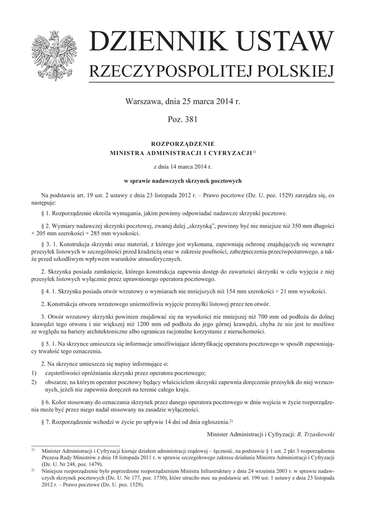 DZIENNIK USTAW RZECZYPOSPOLITEJ POLSKIEJ Warszawa, dnia 25 marca 2014 r. Poz. 381 ROZPORZĄDZENIE MINISTRA ADMINISTRACJI I CYFRYZACJI 1) z dnia 14 marca 2014 r. w sprawie nadawczych skrzynek pocztowych Na podstawie art. 19 ust. 2 ustawy z dnia 23 listopada 2012 r. – Prawo pocztowe (Dz. U. poz. 1529) zarządza się, co następuje: § 1. Rozporządzenie określa wymagania, jakim powinny odpowiadać nadawcze skrzynki pocztowe. § 2. Wymiary nadawczej skrzynki pocztowej, zwanej dalej „skrzynką”, powinny być nie mniejsze niż 350 mm długości × 205 mm szerokości × 285 mm wysokości. § 3. 1. Konstrukcja skrzynki oraz materiał, z którego jest wykonana, zapewniają ochronę znajdujących się wewnątrz przesyłek listowych w szczególności przed kradzieżą oraz w zakresie poufności, zabezpieczenia przeciwpożarowego, a także przed szkodliwym wpływem warunków atmosferycznych. 2. Skrzynka posiada zamknięcie, którego konstrukcja zapewnia dostęp do zawartości skrzynki w celu wyjęcia z niej przesyłek listowych wyłącznie przez uprawnionego operatora pocztowego. § 4. 1. Skrzynka posiada otwór wrzutowy o wymiarach nie mniejszych niż 154 mm szerokości × 21 mm wysokości. 2. Konstrukcja otworu wrzutowego uniemożliwia wyjęcie przesyłki listowej przez ten otwór. 3. Otwór wrzutowy skrzynki powinien znajdować się na wysokości nie mniejszej niż 700 mm od podłoża do dolnej krawędzi tego otworu i nie większej niż 1200 mm od podłoża do jego górnej krawędzi, chyba że nie jest to możliwe ze względu na bariery architektoniczne albo ogranicza racjonalne korzystanie z nieruchomości. § 5. 1. Na skrzynce umieszcza się informacje umożliwiające identyfikację operatora pocztowego w sposób zapewniający trwałość tego oznaczenia. 2. Na skrzynce umieszcza się napisy informujące o: 1) częstotliwości opróżniania skrzynki przez operatora pocztowego; 2) obszarze, na którym operator pocztowy będący właścicielem skrzynki zapewnia doręczenie przesyłek do niej wrzuconych, jeżeli nie zapewnia doręczeń na terenie całego kraju. § 6. Kolor stosowany do oznaczania skrzynek przez danego operatora pocztowego w dniu wejścia w życie rozporządzenia może być przez niego nadal stosowany na zasadzie wyłączności. § 7. Rozporządzenie wchodzi w życie po upływie 14 dni od dnia ogłoszenia.2) Minister Administracji i Cyfryzacji: R. Trzaskowski Minister Administracji i Cyfryzacji kieruje działem administracji rządowej – łączność, na podstawie § 1 ust. 2 pkt 3 rozporządzenia Prezesa Rady Ministrów z dnia 18 listopada 2011 r. w sprawie szczegółowego zakresu działania Ministra Administracji i Cyfryzacji (Dz. U. Nr 248, poz. 1479). 2) Niniejsze rozporządzenie było poprzedzone rozporządzeniem Ministra Infrastruktury z dnia 24 września 2003 r. w sprawie nadawczych skrzynek pocztowych (Dz. U. Nr 177, poz. 1730), które utraciło moc na podstawie art. 190 ust. 1 ustawy z dnia 23 listopada 2012 r. – Prawo pocztowe (Dz. U. poz. 1529). 1)