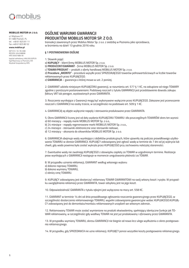 MOBILUS MOTOR SP. Z O.O. ul. Miętowa 37, 61-680 Poznań, PL tel. +48 61 825 81 11 fax +48 61 825 80 52 www.mobilus.pl NIP 972-10-78-008 REGON 634538898 KRS 0000188418 kapitał zakładowy 496,000.00PLN Sąd Rejonowy w Poznaniu XXI Wydział Gospodarczy KRS OGÓLNE WARUNKI GWARANCJI PRODUKTÓW MOBILUS MOTOR SP. Z O.O. transakcji zawieranych przez Mobilus Motor Sp. z o.o. z siedzibą w Poznaniu jako sprzedawca, w brzmieniu na dzień 13 grudnia 2016 roku. § 1 POSTANOWIENIA OGÓLNE 1. Słownik pojęć: a) KUPUJĄCY - klient firmy MOBILUS MOTOR Sp. z o.o. b) PRODUCENT/GWARANT - firma MOBILUS MOTOR Sp. z o.o. c) TOWAR/PRODUKT – produkt z oferty handlowej MOBILUS MOTOR Sp. z o.o. d) Procedura „AKONTO” - procedura wysyłki przez SPRZEDAJĄCEGO towarów pełnowartościowych w liczbie towarów reklamowanych przez KUPUJĄCEGO. e) GWARANCJA – gwarancja o której mowa w ust. 2 poniżej. 2. GWARANT udziela niniejszym KUPUJĄCEMU gwarancji, w rozumieniu art. 577 § 1 KC, na zakupione od niego TOWARY zgodnie z poniższymi postanowieniami. Podstawą roszczeń z tytułu GWARANCJI jest przedstawienie dowodu zakupu: faktury VAT lub paragon, wystawionych przez GWARANTA. 3. Roszczenia wynikające z Gwarancji mogą być wykonywane wyłącznie przez KUPUJĄCEGO. Zakazane jest przenoszenie roszczeń z GWARANCJI na osoby trzecie, w szczególności na podstawie art. 509 § 1 KC. 4. GWARANCJĄ są objęte wyłącznie napędy i sterowania produkowane przez GWARANTA. 5. Okres GWARANCJI liczony jest od daty wydania KUPUJĄCEMU TOWARU i dla poszczególnych TOWARÓW okres ten wynosi: a) 60 miesięcy - napędy marki MOBILUS MOTOR Sp. z o.o., b) 24 miesiące - napędy regenerowane marki MOBILUS MOTOR Sp. z o.o., c) 24 miesiące - sterowniki elektroniczne oraz sterowniki radiowe, d) 12 miesięcy - akcesoria do siłowników MOBILUS MOTOR Sp. z o.o. 6. GWARANCJA obejmuje wady wynikające z defektów produkcyjnych, które ujawniły się podczas prawidłowego użytkowania TOWARU w okresie GWARANCJI. KUPUJĄCY zobowiązany jest zgłosić wadę w terminie do 7 dni od jej wykrycia lub chwili, gdy wada powinna była zostać wykryta przez KUPUJĄCEGO przy zachowaniu należytej staranności. 7. Ewentualne wady nie zwalniają KUPUJĄCEGO z obowiązku zapłaty za TOWAR w uzgodnionym terminie. Realizacja praw wynikających z GWARANCJI następuje w momencie uregulowania płatności za TOWAR. 8. W przypadku uznania reklamacji, GWARANT według własnego wyboru: a) dokona naprawy TOWARU, b) dokona wymiany TOWARU, c) obniży cenę TOWARU. 9. KUPUJĄCY zobowiązany jest dostarczyć reklamowy TOWAR GWARANTOWI na swój własny koszt i ryzyko. W przypadku uwzględniania reklamacji przez GWARANTA, towar odsyłany jest na jego koszt. 10. Odpowiedzialność GWARANTA z tytułu rękojmi jest wyłączona na mocy art. 558 KC. 11. GWARANT w terminie 14 dni od dnia prawidłowego zgłoszenia roszczenia gwarancyjnego przez KUPUJĄCEGO, w szczególności dostarczenia reklamowanego TOWARU, wypełni zobowiązania gwarancyjne wobec KUPUJACEGO.KUPUJĄCY zobowiązany jest do demontażu/montażu reklamowanych urządzeń we własnym zakresie.. 12. Reklamowany TOWAR może zostać wymienione na produkt ekwiwalentny, spełniający identyczne funkcje jak TOWAR reklamowany, w szczególności gdy wadliwy TOWAR nie jest już produkowany i oferowany przez GWARANTA. 13. W przypadku wymiany TOWARU, okresu GWARANCJI nie biegnie od nowa lecz ulega wydłużeniu o okres postępowania reklamacyjnego. 14. W przypadku, gdy SPRZEDAWCA nie uzna reklamacji, KUPUJĄCY ponosi wszystkie koszty postępowania reklamacyjnego. 1 MOBILUS MOTOR SP. Z O.O. ul. Miętowa 37, 61-680 Poznań, PL tel. +48 61 825 81 11 fax +48 61 825 80 52 www.mobilus.pl NIP 972-10-78-008 REGON 634538898 KRS 0000188418 kapitał zakładowy 496,000.00PLN Sąd Rejonowy w Poznaniu XXI Wydział Gospodarczy KRS 15. GWARANCJA nie obejmuje: a) urządzeń zainstalowanych niezgodnie z instrukcją, b) urządzeń zainstalowanych przez osoby nieposiadające odpowiednich uprawnień (min. SEP do 1 kV), c) uszkodzeń mechanicznych, termicznych, chemicznych i wszystkich innych spowodowanych zaniechaniem bądź działaniem użytkownika albo siły zewnętrznej (np. przepięciami w sieci, wyładowaniami atmosferycznymi itp.), d) uszkodzeń powstałych w wyniku nieprawidłowego montażu i użytkowania, e) użytkowania niezgodnego z przeznaczeniem, f) wymiany elementów posiadających określoną żywotność (zabieraki, adaptery), g) skutków naturalnego zużycia materiałów, h) konserwacji Produktów, i) baterii i akumulatorów. 16. GWARANT nie ponosi odpowiedzialności za jakiekolwiek straty lub koszty KUPUJĄCEGO, wynikające bezpośrednio lub pośrednio z zastosowania wadliwego TOWARU, włączając w to szkody bezpośrednie, pośrednie i odpowiedzialność warunkową jakiejkolwiek natury. W szczególności odpowiedzialność GWARANTA z tytułu wad TOWARU nie obejmuje prawa KUPUJĄCEGO do domagania się zwrotu utraconych zysków lub poniesionych strat związanych z wadą TOWARU, naprawienia szkody związanej z utratą wizerunku KUPUJĄCEGO itp. 17. TOWAR, którego reklamacji nie uznano, pozostaje do odbioru u SPRZEDAWCY przez okres 6 miesięcy. Po upływie tego terminu TOWAR nieodebrany zostanie automatycznie zutylizowany. § 2 PROCEDURA AKONTO 1. GWARANT, może - wedle własnego wyboru - dostarczyć KUPUJĄCEMU TOWAR na wymianę pomijając procedurę standardowego rozpatrzenia zgłoszenia reklamacyjnego. 2. GWARANT wraz z produktami dostarcza KUPUJĄCEMU fakturę VAT (z 30 dniowym terminem płatności). Kupujący ma 21 dni kalendarzowych na zwrot reklamowanego TOWARU GWARANTOWI. GWARANT wystawia fakturę korygującą na reklamowany TOWAR jeśli uzna reklamację za zasadną. Jeśli KUPUJĄCY nie zwróci reklamowanego TOWARU w ciągu 21 dni kalendarzowych od daty wysyłki AKONTO lub jeśli zwrócony TOWAR nie będzie spełniał warunków uznania reklamacji za zasadną, GWARANT ma prawo odmowy wystawienia faktury korygującej