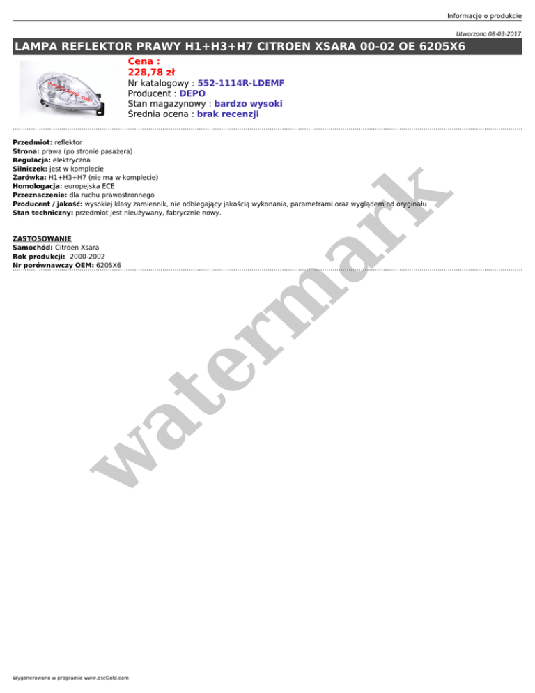 Informacje o produkcie Utworzono 08-03-2017 LAMPA REFLEKTOR PRAWY H1+H3+H7 CITROEN XSARA 00-02 OE 6205X6 Cena : 228,78 zł Nr katalogowy : 552-1114R-LDEMF Producent : DEPO Stan magazynowy : bardzo wysoki Średnia ocena : brak recenzji w at ZASTOSOWANIE Samochód: Citroen Xsara Rok produkcji: 2000-2002 Nr porównawczy OEM: 6205X6 er m ar k Przedmiot: reflektor Strona: prawa (po stronie pasażera) Regulacja: elektryczna Silniczek: jest w komplecie Żarówka: H1+H3+H7 (nie ma w komplecie) Homologacja: europejska ECE Przeznaczenie: dla ruchu prawostronnego Producent / jakość: wysokiej klasy zamiennik, nie odbiegający jakością wykonania, parametrami oraz wyglądem od oryginału Stan techniczny: przedmiot jest nieużywany, fabrycznie nowy. Wygenerowano w programie www.oscGold.com