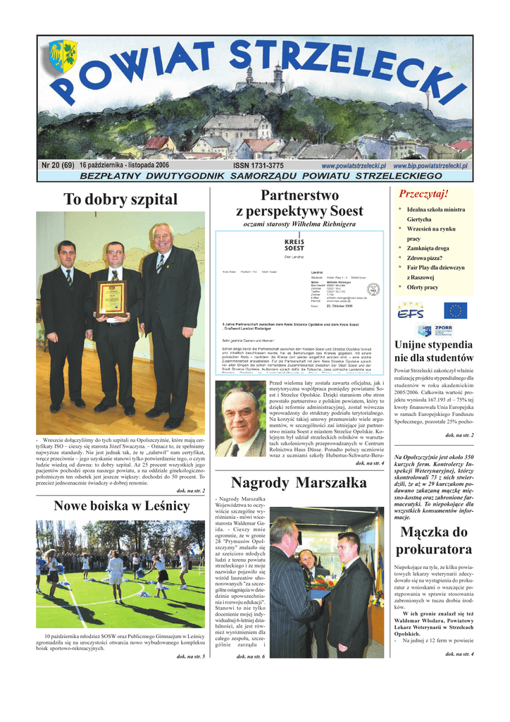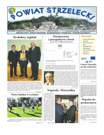 To dobry szpital Partnerstwo z perspektywy Soest oczami starosty Wilhelma Riebnigera Przeczytaj! * Idealna szko³a ministra Giertycha * Wrzesieñ na rynku pracy * Zamkniêta droga * Zdrowa pizza? * Fair Play dla dziewczyn z Raszowej * Oferty pracy Unijne stypendia nie dla studentów - Wreszcie do³¹czylimy do tych szpitali na Opolszczynie, które maj¹ certyfikaty ISO cieszy siê starosta Józef Swaczyna. Oznacz to, ¿e spe³niamy najwy¿sze standardy. Nie jest jednak tak, ¿e te za³atwi³ nam certyfikat, wrêcz przeciwnie jego uzyskanie stanowi tylko potwierdzenie tego, o czym ludzie wiedz¹ od dawna: to dobry szpital. A¿ 25 procent wszystkich jego pacjentów pochodzi spoza naszego powiatu, a na oddziale ginekologicznopo³o¿niczym ten odsetek jest jeszcze wiêkszy: dochodzi do 50 procent. To przecie¿ jednoznacznie wiadczy o dobrej renomie. dok. na str. 2 Nowe boiska w Lenicy 10 padziernika m³odzie¿ SOSW oraz Publicznego Gimnazjum w Lenicy zgromadzi³a siê na uroczystoci otwarcia nowo wybudowanego kompleksu boisk sportowo-rekreacyjnych. dok. na str. 5 Przed wieloma laty zosta³a zawarta oficjalna, jak i merytoryczna wspó³praca pomiêdzy powiatami Soest i Strzelce Opolskie. Dziêki staraniom obu stron powsta³o partnerstwo z polskim powiatem, który to dziêki reformie administracyjnej, zosta³ wówczas wprowadzony do struktury podzia³u terytorialnego. Na korzyæ takiej umowy przemawia³o wiele argumentów, w szczególnoci za istniej¹ce ju¿ partnerstwo miasta Soest z miastem Strzelce Opolskie. Kolejnym by³ udzia³ strzeleckich rolników w warsztatach szkoleniowych przeprowadzanych w Centrum Rolnictwa Haus Düsse. Ponadto polscy uczniowie wraz z uczniami szko³y Hubertus-Schwartz-Berudok. na str. 4 Nagrody Marsza³ka - Nagrody Marsza³ka Województwa to oczywicie szczególne wyró¿nienia - mówi wicestarosta Waldemar Gaida. - Cieszy mnie ogromnie, ¿e w gronie 28 "Prymusów Opolszczyzny" znalaz³o siê a¿ szecioro m³odych ludzi z terenu powiatu strzeleckiego i ¿e moje nazwisko pojawi³o siê wród laureatów uhonorowanych "za szczególne osi¹gniêcia w dziedzinie upowszechniania i rozwoju edukacji". Stanowi to nie tylko docenienie mojej indywidualnej 6-letniej dzia³alnoci, ale jest równie¿ wyró¿nieniem dla ca³ego zespo³u, szczególnie zarz¹du i dok. na str. 6 Powiat Strzelecki zakoñczy³ w³anie realizacjê projektu stypendialnego dla studentów w roku akademickim 2005/2006. Ca³kowita wartoæ projektu wynios³a 167.193 z³ 75% tej kwoty finansowa³a Unia Europejska w ramach Europejskiego Funduszu Spo³ecznego, pozosta³e 25% pocho- dok. na str. 2 Na Opolszczynie jest oko³o 350 kurzych ferm. Kontrolerzy Inspekcji Weterynaryjnej, którzy skontrolowali 73 z nich stwierdzili, ¿e a¿ w 29 kurczakom podawano zakazan¹ m¹czkê miêsno-kostn¹ oraz zabronione farmaceutyki. To niepokoj¹ce dla wszystkich konsumentów informacje. M¹czka do prokuratora Niepokoj¹ce na tyle, ¿e kilku powiatowych lekarzy weterynarii zdecydowa³o siê na wyst¹pienia do prokuratur z wnioskami o wszczêcie postêpowania w sprawie stosowania zabronionych w tuczu drobiu rodków. W ich gronie znalaz³ siê te¿ Waldemar W³odara, Powiatowy Lekarz Weterynarii w Strzelcach Opolskich. - Na jednej z 12 ferm w powiecie dok. na str. 4