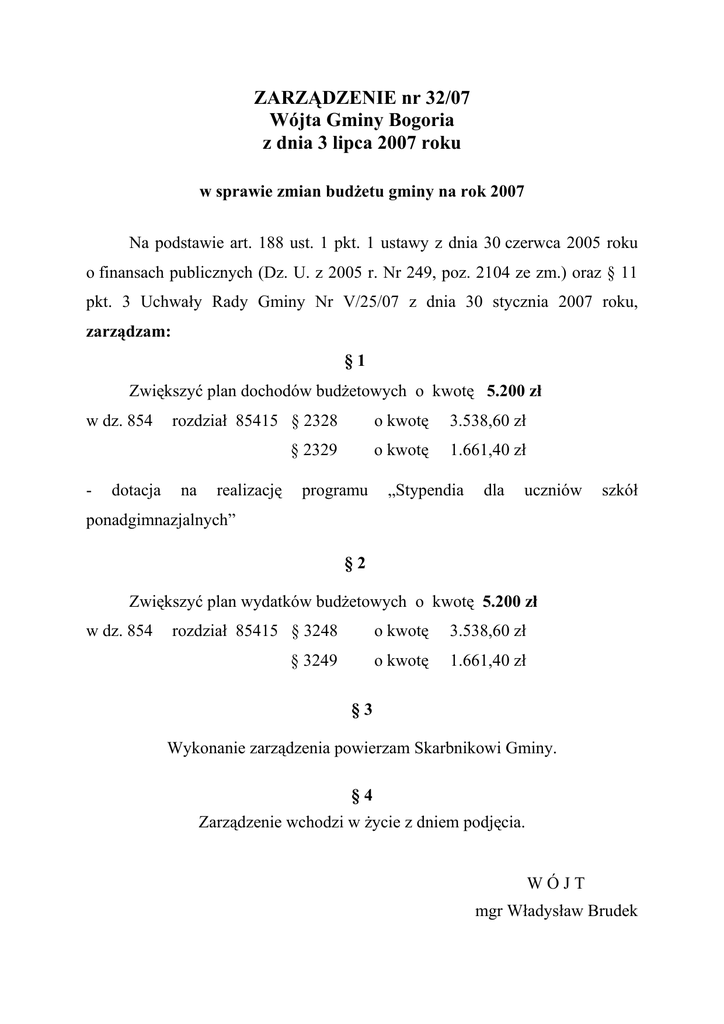ZARZĄDZENIE nr 32/07 Wójta Gminy Bogoria z dnia 3 lipca 2007 roku w sprawie zmian budżetu gminy na rok 2007 Na podstawie art. 188 ust. 1 pkt. 1 ustawy z dnia 30 czerwca 2005 roku o finansach publicznych (Dz. U. z 2005 r. Nr 249, poz. 2104 ze zm.) oraz § 11 pkt. 3 Uchwały Rady Gminy Nr V/25/07 z dnia 30 stycznia 2007 roku, zarządzam: §1 Zwiększyć plan dochodów budżetowych o kwotę 5.200 zł w dz. 854 - dotacja rozdział 85415 § 2328 o kwotę 3.538,60 zł § 2329 o kwotę 1.661,40 zł na realizację programu „Stypendia dla uczniów szkół ponadgimnazjalnych” §2 Zwiększyć plan wydatków budżetowych o kwotę 5.200 zł w dz. 854 rozdział 85415 § 3248 o kwotę 3.538,60 zł § 3249 o kwotę 1.661,40 zł §3 Wykonanie zarządzenia powierzam Skarbnikowi Gminy. §4 Zarządzenie wchodzi w życie z dniem podjęcia. WÓJT mgr Władysław Brudek