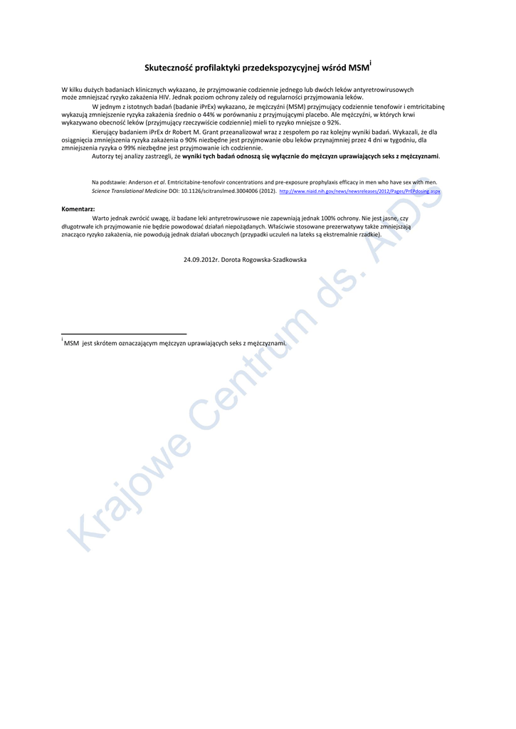 Skuteczność profilaktyki przedekspozycyjnej wśród MSM i W kilku dużych badaniach klinicznych wykazano, że przyjmowanie codziennie jednego lub dwóch leków antyretrowirusowych może zmniejszać ryzyko zakażenia HIV. Jednak poziom ochrony zależy od regularności przyjmowania leków. W jednym z istotnych badań (badanie iPrEx) wykazano, że mężczyźni (MSM) przyjmujący codziennie tenofowir i emtricitabinę wykazują zmniejszenie ryzyka zakażenia średnio o 44% w porównaniu z przyjmującymi placebo. Ale mężczyźni, w których krwi wykazywano obecność leków (przyjmujący rzeczywiście codziennie) mieli to ryzyko mniejsze o 92%. Kierujący badaniem iPrEx dr Robert M. Grant przeanalizował wraz z zespołem po raz kolejny wyniki badań. Wykazali, że dla osiągnięcia zmniejszenia ryzyka zakażenia o 90% niezbędne jest przyjmowanie obu leków przynajmniej przez 4 dni w tygodniu, dla zmniejszenia ryzyka o 99% niezbędne jest przyjmowanie ich codziennie. Autorzy tej analizy zastrzegli, że wyniki tych badań odnoszą się wyłącznie do mężczyzn uprawiających seks z mężczyznami. Na podstawie: Anderson et al. Emtricitabine-tenofovir concentrations and pre-exposure prophylaxis efficacy in men who have sex with men. Science Translational Medicine DOI: 10.1126/scitranslmed.3004006 (2012). http://www.niaid.nih.gov/news/newsreleases/2012/Pages/PrEPdosing.aspx Komentarz: Warto jednak zwrócić uwagę, iż badane leki antyretrowirusowe nie zapewniają jednak 100% ochrony. Nie jest jasne, czy długotrwałe ich przyjmowanie nie będzie powodować działań niepożądanych. Właściwie stosowane prezerwatywy także zmniejszają znacząco ryzyko zakażenia, nie powodują jednak działań ubocznych (przypadki uczuleń na lateks są ekstremalnie rzadkie). 24.09.2012r. Dorota Rogowska-Szadkowska i MSM jest skrótem oznaczającym mężczyzn uprawiających seks z mężczyznami.