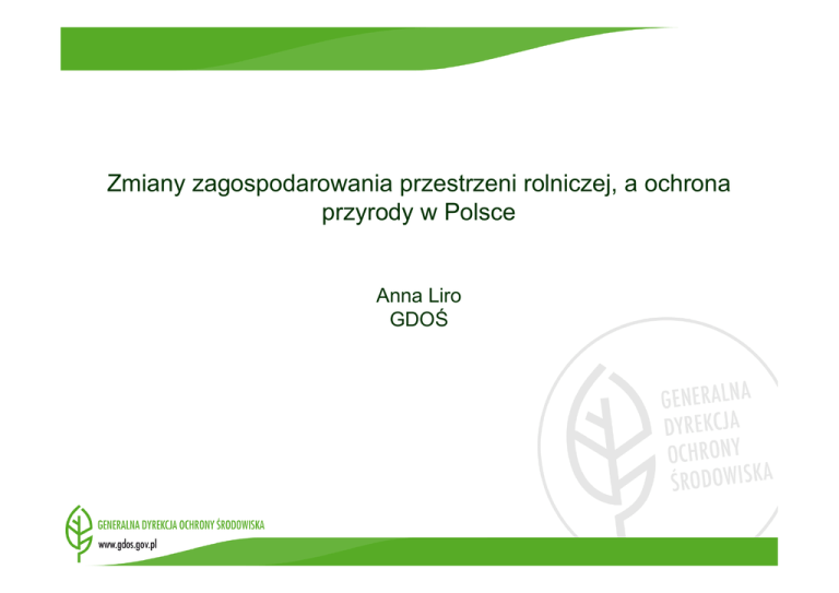 Zmiany zagospodarowania przestrzeni rolniczej, a ochrona przyrody w Polsce Anna Liro GDOŚ Realizacja NCW związanego z uprawą biomasy do produkcja biopaliw może prowadzić do: • zmiany sposobu i struktury użytkowania gruntów • intensyfikacji produkcji rolnej • ekspansji obszarów upraw rolnych negatywnie wpływając na środowisko i właściwy stanu ochrony zasobów różnorodności biologicznej w obrębie obszarów chronionych i poza nim Zmiany użytkowania ziemi • przekształcanie łąk i pastwisk w grunty orne • uproduktywnienie gruntów marginalnych, nieużytków, gruntów zdegradowanych • wzrost powierzchni upraw trwałych – roślin energetycznych II generacji • wzrost powierzchni rozległych monokultur i upraszczanie mozaikowej struktury obszarów rolnych • zmniejszanie powierzchni rolnictwa ekstensywnego i ekologicznego Wpływ na różnorodność biologiczną • Utrata cennych półnaturalnych łąk i pastwisk oraz innych marginalnych dla rolnictwa siedlisk - ważnych ostoi różnorodności biologicznej • Utrata agrobioróżnorodności • Wprowadzanie obcych gatunków inwazyjnych np. ślazowiec pensylwański, róża wielokwiatowa Historyczne zmiany w użytkowaniu ziemi W całym okresie powojennym przekształcenia objęły 9% pow. ziemi, w tym głównie tereny rolne: • zmiana użytkowania łąk i pastwisk na grunty orne • Zalesienia gruntów rolnych • zabudowania Użytki rolne w % (Rocznik Statystyczny GUS 2010) Rok Razem Grunty orne Sady Łąki Pastwiska Pozostałe 2005 50,9 39,1 0,9 8,2 2,7 - 2009 51,7 38,7 1,1 7,8 2,3 1,7 W Polsce funkcjonuje rozbudowany system obszarowej ochrony przyrody KSOCH: (32,3% pow. ogólnej kraju) 23 1455 125 426 164 6798 214 parki narodowe (1%) rezerwaty przyrody (0,5%) parki krajobrazowe (ok.8%) obszarów chronionego krajobrazu (22,3%) stanowiska dokumentacyjne, użytki ekologiczne, zespoły przyrodniczo-krajobrazowe, Sieć obszary Natura 2000: 964 obszary (19,8%) PN – lasy 61%, tereny rolne 15% PK – lasy 53%, grunty rolne 35% OCHK – lasy 32%, grunty rolne 40% Sieć Natura 2000 w Polsce Czy system ochrony przyrody skutecznie ograniczy negatywny wpływ polityki biopaliw? • Nie jest kompletny – reprezentacja siedlisk nieleśnych jest niedostateczna • System nie jest spójny przestrzennie, wymaga przebudowy – brak struktur korytarzy ekologicznych • Wiele korytarzy ekologicznych pozostaje poza tym systemem Instrumenty ochrony przyrody • Zakazy • Procedury ocen oddziaływania na środowisko • Planowanie ochrony • System zachęt • Edukacja Ograniczona skuteczność instrumentów • Brak wielu planów ochrony – podstawa zarządzania obszarami • Niedostateczny nadzór nad obszarami, brak odpowiedniego finansowanie działań • Brak możliwości zastosowania procedur OOS w stosunku do zmiana użytkowania w obrębie gruntów rolnych • Niska skuteczność instrumentów prawnych pozwalających na egzekwowanie przepisów prawa, ustaleń planów ochrony • Zbyt małe zasoby kadrowe służb ochrony przyrody, brak kontroli na miejscu Działania na rzecz zrównoważonej produkcji roślin energetycznych • Wprowadzenie dobrych praktyk jak ograniczać negatywne skutki na środowisko • Informacja i edukacja o wpływie upraw energetycznych na środowisko • Kontrola przekształceń TUZ na poziomie gospodarstwa Dziękuję za uwagę