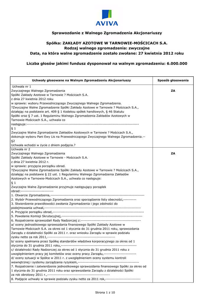 Sprawozdanie z Walnego Zgromadzenia Akcjonariuszy Spółka: ZAKŁADY AZOTOWE W TARNOWIE-MOŚCICACH S.A. Rodzaj walnego zgromadzenia: zwyczajne Data, na która walne zgromadzenie zostało zwołane: 27 kwietnia 2012 roku Liczba głosów jakimi fundusz dysponował na walnym zgromadzeniu: 6.000.000 Uchwały głosowane na Walnym Zgromadzeniu Akcjonariuszy Uchwała nr 1 Zwyczajnego Walnego Zgromadzenia Spółki Zakłady Azotowe w Tarnowie ? Mościcach S.A. z dnia 27 kwietnia 2012 roku w sprawie: wyboru Przewodniczącego Zwyczajnego Walnego Zgromadzenia. ?Zwyczajne Walne Zgromadzenie Spółki Zakłady Azotowe w Tarnowie ? Mościcach S.A., działając na podstawie art. 409 § 1 Kodeksu spółek handlowych, § 46 Statutu Spółki oraz § 7 ust. 1 Regulaminu Walnego Zgromadzenia Zakładów Azotowych w Tarnowie-Mościcach S.A., uchwala co następuje:-------------------------------------------------------------------------------------§1 Zwyczajne Walne Zgromadzenie Zakładów Azotowych w Tarnowie ? Mościcach S.A., dokonuje wyboru Pani Ewy Lis na Przewodniczącego Zwyczajnego Walnego Zgromadzenia.-§2 Uchwała wchodzi w życie z dniem podjęcia.? Uchwała nr 2 Zwyczajnego Walnego Zgromadzenia Spółki Zakłady Azotowe w Tarnowie - Mościcach S.A. z dnia 27 kwietnia 2012 r. w sprawie: przyjęcia porządku obrad. ?Zwyczajne Walne Zgromadzenie Spółki Zakłady Azotowe w Tarnowie ? Mościcach S.A., działając na podstawie § 22 ust. 1 Regulaminu Walnego Zgromadzenia Zakładów Azotowych w Tarnowie-Mościcach S.A., uchwala co następuje: §1 Zwyczajne Walne Zgromadzenie przyjmuje następujący porządek obrad:------------------------1. Otwarcie Zgromadzenia,-----------------------------------------------------------------------2. Wybór Przewodniczącego Zgromadzenia oraz sporządzenie listy obecności,---------3. Stwierdzenie prawidłowości zwołania Zgromadzenia i jego zdolności do podejmowania uchwał,-------------------------------------------------------------------------4. Przyjęcie porządku obrad,---------------------------------------------------------------------5. Powołanie Komisji Skrutacyjnej,-------------------------------------------------------------6. Rozpatrzenie sprawozdań Rady Nadzorczej z:---------------------------------------------a/ oceny jednostkowego sprawozdania finansowego Spółki Zakłady Azotowe w Tarnowie-Mościcach S.A. za okres od 1 stycznia do 31 grudnia 2011 roku, sprawozdania Zarządu z działalności Spółki za 2011 r. oraz wniosku Zarządu w sprawie podziału zysku netto za rok 2011,---------------------------------------------------b/ oceny spełniania przez Spółkę standardów władztwa korporacyjnego za okres od 1 stycznia do 31 grudnia 2011 roku,---------------------------------------------------------c/ działalności Rady Nadzorczej za okres od 1 stycznia do 31 grudnia 2011 roku z uwzględnieniem pracy jej komitetów oraz oceny pracy Zarządu,------------------------d/ oceny sytuacji w Spółce w 2011 r. z uwzględnieniem oceny systemu kontroli wewnętrznej i systemu zarządzania ryzykiem,----------------------------------------------7. Rozpatrzenie i zatwierdzenie jednostkowego sprawozdania finansowego Spółki za okres od 1 stycznia do 31 grudnia 2011 roku oraz sprawozdania Zarządu z działalności Spółki za rok obrotowy 2011 r.,-----------------------------------------------8. Podjęcie uchwały w sprawie podziału zysku netto za 2011 rok,--------------------------- Strona 1 z 10 Sposób głosowania ZA ZA 9. Rozpatrzenie sprawozdania Rady Nadzorczej z oceny skonsolidowanego sprawozdania finansowego Grupy Kapitałowej Zakładów Azotowych w Tarnowie-Mościcach S.A. za okres od 1 stycznia do 31 grudnia 2011 roku oraz sprawozdania Zarządu z działalności Grupy Kapitałowej za rok obrotowy 2011,----------------------10. Rozpatrzenie i zatwierdzenie skonsolidowanego sprawozdania finansowego Grupy Kapitałowej Zakładów Azotowych w Tarnowie-Mościcach S.A. za okres od 1 stycznia do 31 grudnia 2011 roku oraz sprawozdania Zarządu z działalności Grupy Kapitałowej za rok obrotowy 2011,----------------------------------------------------------11. Podjęcie uchwał w sprawie udzielenia Członkom Zarządu absolutorium z wykonania przez nich obowiązków za okres od 1 stycznia do 31 grudnia 2011 roku,--------------12. Podjęcie uchwał w sprawie udzielenia Członkom Rady Nadzorczej Spółki absolutorium z wykonania przez nich obowiązków od za okres od 1 stycznia do 31 grudnia 2011 roku,-----------------------------------------------------------------------------13. Informacje bieżące dla Akcjonariuszy,-------------------------------------------------------14. Zamknięcie Obrad.----------------------------------------------------------------------------§2 Uchwała wchodzi w życie z dniem podjęcia? Uchwała nr 3 Zwyczajnego Walnego Zgromadzenia Spółki Zakłady Azotowe w Tarnowie - Mościcach S.A. z dnia 27 kwietnia 2012 r. w sprawie: powołania Komisji Skrutacyjnej ?Zwyczajne Walne Zgromadzenie Spółki Zakłady Azotowe w Tarnowie - Mościcach S.A., działając na podstawie § 23 ust. 1 Regulaminu Walnego Zgromadzenia Zakładów Azotowych w Tarnowie-Mościcach S.A. , uchwala co następuje:-------------------------------------------------§14 ZA Zwyczajne Walne Zgromadzenie Zakładów Azotowych w Tarnowie ? Mościcach S.A. powołuje Komisję Skrutacyjną w składzie:-------------------------------------------------------------1. Anna Dura,----------------------------------------------------------------------------------2. Joanna Barnaś,----------------------------------------------------------------------------------3. Janusz Florek.-----------------------------------------------------------------------------------§2 Uchwała wchodzi w życie z dniem podjęcia? Uchwała nr 4 Zwyczajnego Walnego Zgromadzenia Spółki Zakłady Azotowe w Tarnowie - Mościcach S.A. z dnia 27 kwietnia 2012 r. w sprawie: zatwierdzenia jednostkowego sprawozdania fin