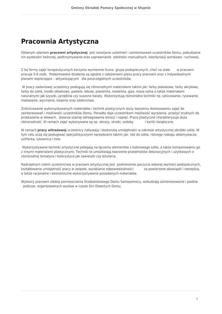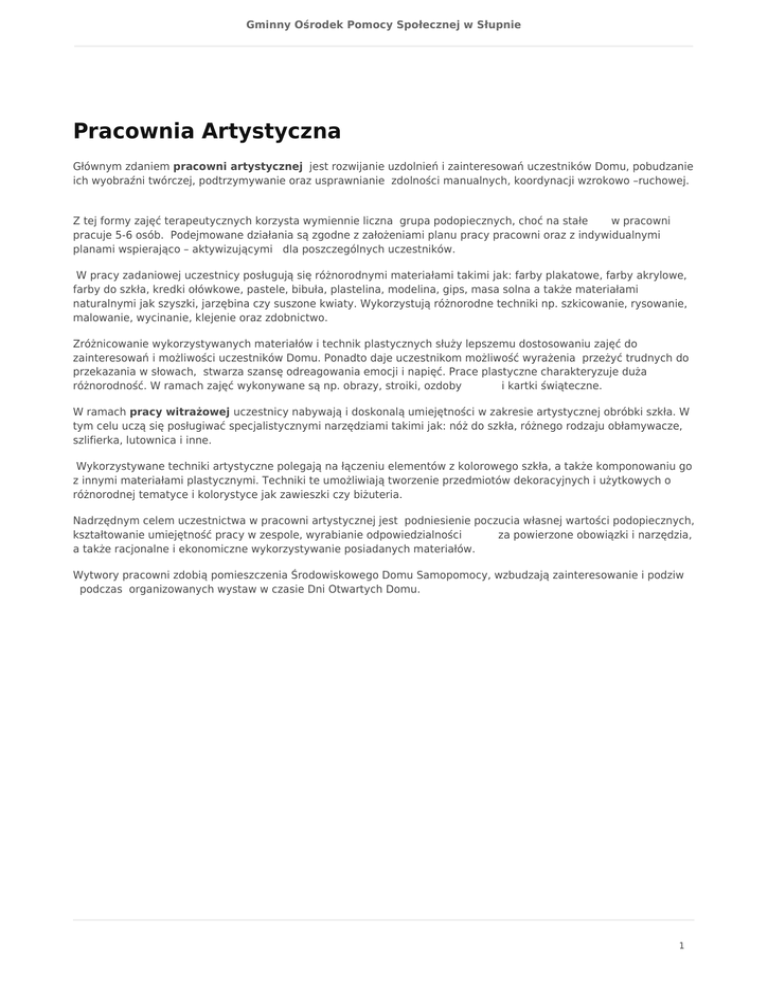 Gminny Ośrodek Pomocy Społecznej w Słupnie Pracownia Artystyczna Głównym zdaniem pracowni artystycznej jest rozwijanie uzdolnień i zainteresowań uczestników Domu, pobudzanie ich wyobraźni twórczej, podtrzymywanie oraz usprawnianie zdolności manualnych, koordynacji wzrokowo –ruchowej. Z tej formy zajęć terapeutycznych korzysta wymiennie liczna grupa podopiecznych, choć na stałe w pracowni pracuje 5-6 osób. Podejmowane działania są zgodne z założeniami planu pracy pracowni oraz z indywidualnymi planami wspierająco – aktywizującymi dla poszczególnych uczestników. W pracy zadaniowej uczestnicy posługują się różnorodnymi materiałami takimi jak: farby plakatowe, farby akrylowe, farby do szkła, kredki ołówkowe, pastele, bibuła, plastelina, modelina, gips, masa solna a także materiałami naturalnymi jak szyszki, jarzębina czy suszone kwiaty. Wykorzystują różnorodne techniki np. szkicowanie, rysowanie, malowanie, wycinanie, klejenie oraz zdobnictwo. Zróżnicowanie wykorzystywanych materiałów i technik plastycznych służy lepszemu dostosowaniu zajęć do zainteresowań i możliwości uczestników Domu. Ponadto daje uczestnikom możliwość wyrażenia przeżyć trudnych do przekazania w słowach, stwarza szansę odreagowania emocji i napięć. Prace plastyczne charakteryzuje duża różnorodność. W ramach zajęć wykonywane są np. obrazy, stroiki, ozdoby i kartki świąteczne. W ramach pracy witrażowej uczestnicy nabywają i doskonalą umiejętności w zakresie artystycznej obróbki szkła. W tym celu uczą się posługiwać specjalistycznymi narzędziami takimi jak: nóż do szkła, różnego rodzaju obłamywacze, szlifierka, lutownica i inne. Wykorzystywane techniki artystyczne polegają na łączeniu elementów z kolorowego szkła, a także komponowaniu go z innymi materiałami plastycznymi. Techniki te umożliwiają tworzenie przedmiotów dekoracyjnych i użytkowych o różnorodnej tematyce i kolorystyce jak zawieszki czy biżuteria. Nadrzędnym celem uczestnictwa w pracowni artystycznej jest podniesienie poczucia własnej wartości podopiecznych, kształtowanie umiejętność pracy w zespole, wyrabianie odpowiedzialności za powierzone obowiązki i narzędzia, a także racjonalne i ekonomiczne wykorzystywanie posiadanych materiałów. Wytwory pracowni zdobią pomieszczenia Środowiskowego Domu Samopomocy, wzbudzają zainteresowanie i podziw podczas organizowanych wystaw w czasie Dni Otwartych Domu. 1