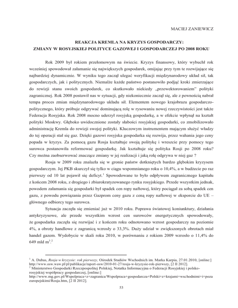 MACIEJ ZANIEWICZ REAKCJA KREMLA NA KRYZYS GOSPODARCZY: ZMIANY W ROSYJSKIEJ POLITYCE GAZOWEJ I GOSPODARCZEJ PO 2008 ROKU Rok 2009 był rokiem przełomowym na świecie. Kryzys finansowy, który wybuchł rok wcześniej spowodował załamanie się największych gospodarek, omijając przy tym te rozwijające się najbardziej dynamicznie. W wyniku tego zaczął ulegać weryfikacji międzynarodowy układ sił, tak gospodarczych, jak i politycznych. Niemalże każde państwo postanowiło podjąć kroki zmierzające do rewizji stanu swoich gospodarek, co skutkowało niekiedy „przewektorowaniem” polityki zagranicznej. Rok 2008 postawił nas w sytuacji, gdy niekoniecznie zaczął się, ale z pewnością nabrał tempa proces zmian międzynarodowego układu sił. Elementem nowego krajobrazu gospodarczopolitycznego, który próbuje odgrywać dominującą rolę w rysowaniu nowej rzeczywistości jest także Federacja Rosyjska. Rok 2008 mocno uderzył rosyjską gospodarkę, a w efekcie wpłynął na kształt polityki Moskwy. Głęboko uwidocznione zostały słabości rosyjskiej gospodarki, co zmobilizowało administrację Kremla do rewizji swojej polityki. Kluczowym instrumentem mającym służyć władzy do tej operacji stał się gaz. Dzięki gazowi rosyjska gospodarka się rozwija, przez wahania jego ceny popada w kryzys. Za pomocą gazu Rosja kształtuje swoją politykę i wreszcie przy pomocy tego surowca postanowiła reformować gospodarkę. Jak kształtuje się polityka Rosji po 2008 roku? Czy można zaobserwować znaczące zmiany w jej realizacji i jaką rolę odgrywa w niej gaz ? Rosja w 2009 roku znalazła się w gronie państw dotkniętych bardzo głębokim kryzysem gospodarczym. Jej PKB skurczył się tylko w ciągu wspomnianego roku o 10,4%, a w budżecie po raz pierwszy od 10 lat pojawił się deficyt. 1 Spowodowane to było odpływem zagranicznego kapitału z końcem 2008 roku, z drogiego i zbiurokratyzowanego rynku rosyjskiego. Przede wszystkim jednak, powodem załamania się gospodarki był spadek cen ropy naftowej, który pociągał za sobą spadek cen gazu, z powodu powiązania przez Gazprom ceny gazu z ceną ropy naftowej w eksporcie do UE – głównego odbiorcy tego surowca. Sytuacja zaczęła się zmieniać już w 2010 roku. Poprawa światowej koniunktury, działania antykryzysowe, ale przede wszystkim wzrost cen surowców energetycznych spowodowały, że gospodarka zaczęła się rozwijać i z końcem roku odnotowano wzrost gospodarczy na poziomie 4%, a obroty handlowe z zagranicą wzrosły o 33,3%. Duży udział w zwiększonych obrotach miał handel gazem. Wydobycie w skali roku 2010, w porównaniu z rokiem 2009 wzrosło o 11,4% do 649 mld m3.2 A. Dubas, Rosja w kryzysie: rok pierwszy, Ośrodek Studiów Wschodnich im. Marka Karpia, 27.01.2010, [online:] http://www.osw.waw.pl/pl/publikacje/raport-osw/2010-01-27/rosja-w-kryzysie-rok-pierwszy, [2 II 2012]. 2 Ministerstwo Gospodarki Rzeczpospolitej Polskiej, Notatka Informacyjna o Federacji Rosyjskiej i polskorosyjskiej współpracy gospodarczej, [online:] http://www.mg.gov.pl/Wspolpraca+z+zagranica/Wspolpraca+gospodarcza+Polski+z+krajami+wschodnimi+i+poza europejskimi/Rosja.htm, [2 II 2012]. 1 53 Jakie wnioski można wyciągnąć z powyższej sytuacji? Przede wszystkim, rosyjska gospodarka jest w zdecydowanej większości uzależniona od światowych cen surowców energetycznych, a w szczególności gazu ziemnego. Można wobec tego stwierdzić, że Federacja Rosyjska jest krajem nie tyle petrodolarowym, co „gazo-dolarowym”. W przypadku państw petrodolarowych, zdały sobie one sprawę z zagrożenia, jakie niesie za sobą uzależnienie od eksportu jednego surowca, w związku z czym zrzeszyły się w organizację kontrolującą ponad połowę światowych złóż ropy naftowej oraz ustalającą jej ceny na światowym rynku - OPEC. W ten sposób zabezpieczyły się przed rozgrywaniem ich przez państwa-importerów, a skuteczność swej polityki udowodniły wywołując kryzysy naftowe. Struktura rosyjskiej gospodarki i eksportu jest jednak dużo bardziej zróżnicowana, co skutkuje większą niezależnością Rosji i szerokimi perspektywami na przyszłość. Główne miejsce w rosyjskim eksporcie, stanowiąc niespełna 2/3 jego wartości, stanowią produkty mineralne. Poza nimi, Rosja eksportuje także: metale, metale szlachetne i produkty przetwórstwa metalurgicznego (ok. 13%), produkty chemiczne i gumowe oraz maszyny, urządzenia techniczne i środki transportu (po ok. 6%)3. Głównymi towarami importowanymi przez Rosję są natomiast: maszyny, urządzenia techniczne i środki transportu (ok. 44%), produkty chemiczne i guma (ok. 16%), żywność (ok. 15%)4. Wyraźnie widać wobec tego, że rosyjska gospodarka nie należy do gospodarek wysoko rozwiniętych, na co wskazuje fakt, że eksportując głównie surowce, importuje przede wszystkim produkty wysoko przetworzone. Powyższa struktura handlu zagranicznego utrzymuje się praktycznie niezmiennie od połowy lat 90-tych XX w. Kolejnym elementem nakładającym się na stan rosyjskiej gospodarki w kontekście jej zależności od eksportu surowców mineralnych, jest międzynarodowa struktura rynków ropy naftowej oraz gazu ziemnego. W przypadku ropy naftowej możemy mówić o istnieniu globalnego rynku tego surowca. Oprócz transportu ropociągami, istnieje rozbudowana infrastruktura transportu ropy tankowcami, dzięki czemu dywersyfikacja importu/eksportu surowca jest stosunkowo łatwa, a jedynym ograniczeniem jest jakość gatunkowa (tzw. ciężkość) ropy, która wymaga specjalnych technologii do przetworzenia surowca z różnych regionów. W przypadku gazu, sytuacja jest bardziej skomplikowana. Do tej pory nie powstał globalny rynek tego surowca. Wynika to z niedostatecznego rozwoju technologii przesyłu sprężonego gazu ziemnego LNG za pomocą gazowców. Nadal najtańszym i dominującym sposobem transportu gazu jest przetłaczanie go przez gazociągi. Skutkiem jest wytworze