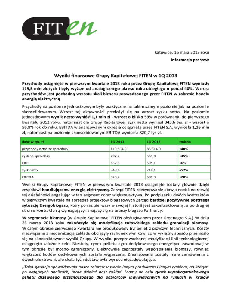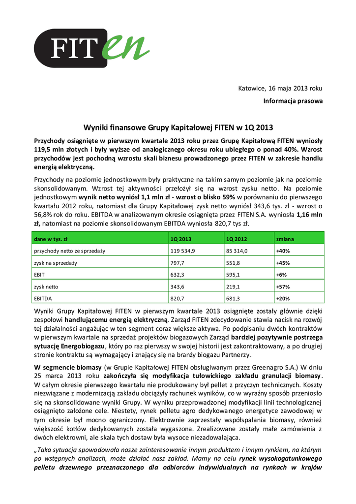 Katowice, 16 maja 2013 roku Informacja prasowa Wyniki finansowe Grupy Kapitałowej FITEN w 1Q 2013 Przychody osiągnięte w pierwszym kwartale 2013 roku przez Grupę Kapitałową FITEN wyniosły 119,5 mln złotych i były wyższe od analogicznego okresu roku ubiegłego o ponad 40%. Wzrost przychodów jest pochodną wzrostu skali biznesu prowadzonego przez FITEN w zakresie handlu energią elektryczną. Przychody na poziomie jednostkowym były praktyczne na takim samym poziomie jak na poziomie skonsolidowanym. Wzrost tej aktywności przełożył się na wzrost zysku netto. Na poziomie jednostkowym wynik netto wyniósł 1,1 mln zł - wzrost o blisko 59% w porównaniu do pierwszego kwartału 2012 roku, natomiast dla Grupy Kapitałowej zysk netto wyniósł 343,6 tys. zł - wzrost o 56,8% rok do roku. EBITDA w analizowanym okresie osiągnięta przez FITEN S.A. wyniosła 1,16 mln zł, natomiast na poziomie skonsolidowanym EBITDA wyniosła 820,7 tys zł. dane w tys. zł 1Q 2013 1Q 2012 zmiana przychody netto ze sprzedaży 119 534,9 85 314,0 +40% zysk na sprzedaży 797,7 551,8 +45% EBIT 632,3 595,1 +6% zysk netto 343,6 219,1 +57% EBITDA 820,7 681,3 +20% Wyniki Grupy Kapitałowej FITEN w pierwszym kwartale 2013 osiągnięte zostały głównie dzięki zespołowi handlującemu energią elektryczną. Zarząd FITEN zdecydowanie stawia nacisk na rozwój tej działalności angażując w ten segment coraz większe aktywa. Po podpisaniu dwóch kontraktów w pierwszym kwartale na sprzedaż projektów biogazowych Zarząd bardziej pozytywnie postrzega sytuację Energobiogazu, który po raz pierwszy w swojej historii jest zakontraktowany, a po drugiej stronie kontraktu są wymagający i znający się na branży biogazu Partnerzy. W segmencie biomasy (w Grupie Kapitałowej FITEN obsługiwanym przez Greenagro S.A.) W dniu 25 marca 2013 roku zakończyła się modyfikacja tułowickiego zakładu granulacji biomasy . W całym okresie pierwszego kwartału nie produkowany był pellet z przyczyn technicznych. Koszty niezwiązane z modernizacją zakładu obciążyły rachunek wyników, co w wyraźny sposób przeniosło się na skonsolidowane wyniki Grupy. W wyniku przeprowadzonej modyfikacji linii technologicznej osiągnięto założone cele. Niestety, rynek pelletu agro dedykowanego energetyce zawodowej w tym okresie był mocno ograniczony. Elektrownie zaprzestały współspalania biomasy, również większość kotłów dedykowanych została wygaszona. Zrealizowane zostały małe zamówienia z dwóch elektrowni, ale skala tych dostaw była wysoce niezadowalająca. „Taka sytuacja spowodowała nasze zainteresowanie innym produktem i innym rynkiem, na którym po wstępnych analizach, może działać nasz zakład. Mamy na celu rynek wysokogatunkowego pelletu drzewnego przeznaczonego dla odbiorców indywidualnych na rynkach w krajów skandynawskich, Włoch, Holandii czy Niemiec. Przeprowadziliśmy testy produkcyjne, mające na celu poznanie faktycznych wydajności na materiale drzewnym. Wyniki są obiecujące. Wyprodukowany pellet został już sprzedany i dostarczony za granicę. Za wcześnie jeszcze na to, by z pełną odpowiedzialnością powiedzieć, że w tym obszarze znajdziemy dla siebie miejsce, ale z dotychczas wykonanych prac wynika, że jest to możliwe i uzasadnione ekonomicznie. Rynek ten nie jest skorelowany z ceną zielonych certyfikatów” – mówi Roman Pluszczew. W segmencie biogazu w pierwszym kwartale kontynuowane były prace skierowane na finalizację dwóch transakcji sprzedażowych. Ostatecznie, już po zakończeniu pierwszego kwartału doszło do podpisania dwóch umów. W pierwszej transakcji nabywcą jest czeska Grupa BGS, a przedmiotem sprzedaży była Bioelektrownia Przykona Sp. z o.o. W tej transakcji spółka z Grupy FITEN występuje również w roli generalnego wykonawcy tej instalacji. Wartość transakcji to 1,5 mln złotych. Druga transakcja to sprzedaż projektu o mocy elektrycznej 2,0 MW dla szwedzkiego kontrahenta. Wartość tej transakcji wyniosła 2,4 mln złotych. „Równolegle prowadzone są kolejne rozmowy na temat sprzedaży dalszych projektów z innymi podmiotami zagranicznymi, ale są to rozmowy znacznie mniej zaawansowane niż te zakończone umowami, co powoduje, że nauczeni doświadczeniem, spodziewamy się ewentualnych nowych umów raczej pod koniec tego roku” – mówi Roman Pluszczew. *** Grupa Kapitałowa FITEN to dynamicznie rozwijająca się firm a zajmująca się hurtowym obrotem energią ele ktryczną na rynku polskim oraz rynkach europejskich, sprzedażą energii klientom końcow ym or az inwestycjami w odnawialne źródła energii. FITEN powstał w styczniu 2007 roku jako spółka utworzona przez Famur International Trade S.A., należącej do Grupy FAMUR. W listopadzie 2007 roku w Famur International Trade S.A. powołano dział obrotu energią elektryczną. Wkrótce sprzedaż energii stała się głównym przedmiotem działalności firmy. W listopadzie 2008 r. nastąpiła zmiana nazwy firmy na FITEN Spółka Akcyjna. Doszło też do emisji akcji i podwyższenia kapitału spółki do 10.600.000 zł. W grudniu 2008 roku inwestorem strategicznym FITEN S.A. został fundusz Coöperatief Avallon MBO U.A. Tym samym Spółka przestała wchodzić w skład Grupy Fa mur. W marcu 2011 Zwyczajne Walne Zgromadzenie FITEN S.A. podjęło uchwałę w sprawie podwyższenia kapitału zakładowego Spółki w drodze emisji kolejnych akcji i zdecydowano o wprowadzeniu akcji spółki do alternatywnego systemu obrotu giełdowego na NewConnect, organizowanego przez Giełdę Papierów Wartościowych w Warszawie SA. Do partnerów biznesowych spółki FITEN w zakresie handlu energią należą m.in.: Vattenfall, PGE, ČEZ, Tauron Polska Energia czy JP Morgan. Handel energią realizowany jest bezpośrednio z kontrahentami oraz za pomocą platform brokerskich. Spółka prowadzi także sprzedaż energii odbiorcom końcowym. W gronie klientów są duże przedsiębiorstwa Browary Łomża i Va