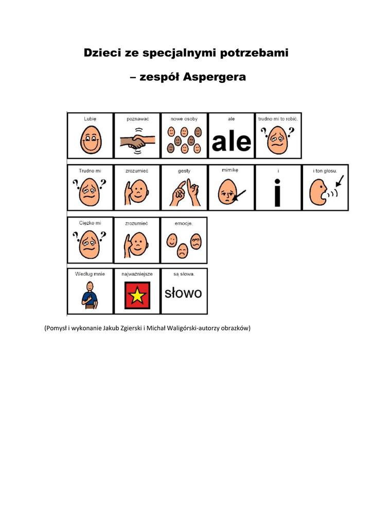Dzieci ze specjalnymi potrzebami – zespół Aspergera (Pomysł i wykonanie Jakub Zgierski i Michał Waligórski-autorzy obrazków) Zespół Aspergera jest jednym z całościowych zaburzeń rozwoju. Objawy obejmują wszystkie sfery życia dziecka, jednak z różnym nasileniem. Główne problemy dzieci z zespołem Aspergera w zakresie umiejętności językowych Perfekcjonizm języka – dziecko posługuje się niemal encyklopedycznym językiem. W określonych sytuacjach używa wyuczonych zwrotów i konstrukcji zdań, nie zważając na do dostosowania wypowiedzi do kontekstu. Może być przez to odbierane jako osoba przemądrzała, ale jest to efekt zapamiętania określonych struktur językowych, które stosowane są jako całość. Dzieci z zespołem Aspergera nie lubią określeń abstrakcyjnych, wiążących się z brakiem precyzji, np. „póżniej”, „ za chwilę”, „potem”. Słysząc takie wypowiedzi czują się zagubione i nie wiedzą, czego mają się spodziewać. Zdarzają się sytuacje, w których dziecko może być odbierane jako bezczelne. Zapytane: „Czy możesz podać mi zeszyt?” odpowie: „Mogę” nie wykonując przy tym żadnego ruchu. Nie rozumie, że w pytaniu kryło się też polecenie. Dlatego w rozmowie z dzieckiem należy unikać podwójnych znaczeń, idiomów, metafor. Należy podawać konkretne informacje oraz instrukcje do wykonania np. zamiast pytać: „Czy możesz podać mi swój zeszyt?”, powiedz „Podaj mi swój zeszyt” – to pozwoli unikać błędnej interpretacji. Dziecko z zespołem Aspergera ma trudności z rozpoczynaniem rozmowy. Ma problemy z rozróżnieniem, w jaki sposób zwracać się do dorosłych, a w jak do kolegów. W rozmowach z dorosłymi często skraca dystans. Nie potrafi odczytać także mowy ciała osób, z którymi rozmawia – zmarszczone brwi nie będą informacją o złości, niezadowoleniu rozmówcy. Wiele dzieci z zespołem Aspergera ma problemy ze skupieniem się na głosie jednej osoby, gdy wiele osób mówi jednocześnie. Trudno im wtedy wyłowić konkretną informację. Często, aby pomóc odpowiedzieć na jakieś pytanie, dziecko potrzebuje zupełnej ciszy, gdyż dopiero wtedy może udzielić poprawnej odpowiedzi. Dziecko z zespołem Aspergera może zarzucać rozmówcę informacjami na temat swoich zainteresowań, zupełnie nie zwracając uwagi na to, że druga osoba nie jest tym zainteresowana. Zespołu Aspergera nie można wyleczyć, ale można nauczyć się z nim żyć. Wiele osób z zespołem Aspergera to ponadprzeciętnie uzdolnieni ludzie. Opracowane na podstawie „Teczka pracy logopedy” wyd. Forum Wioletta Kaliszyk - neurologopeda szkolny