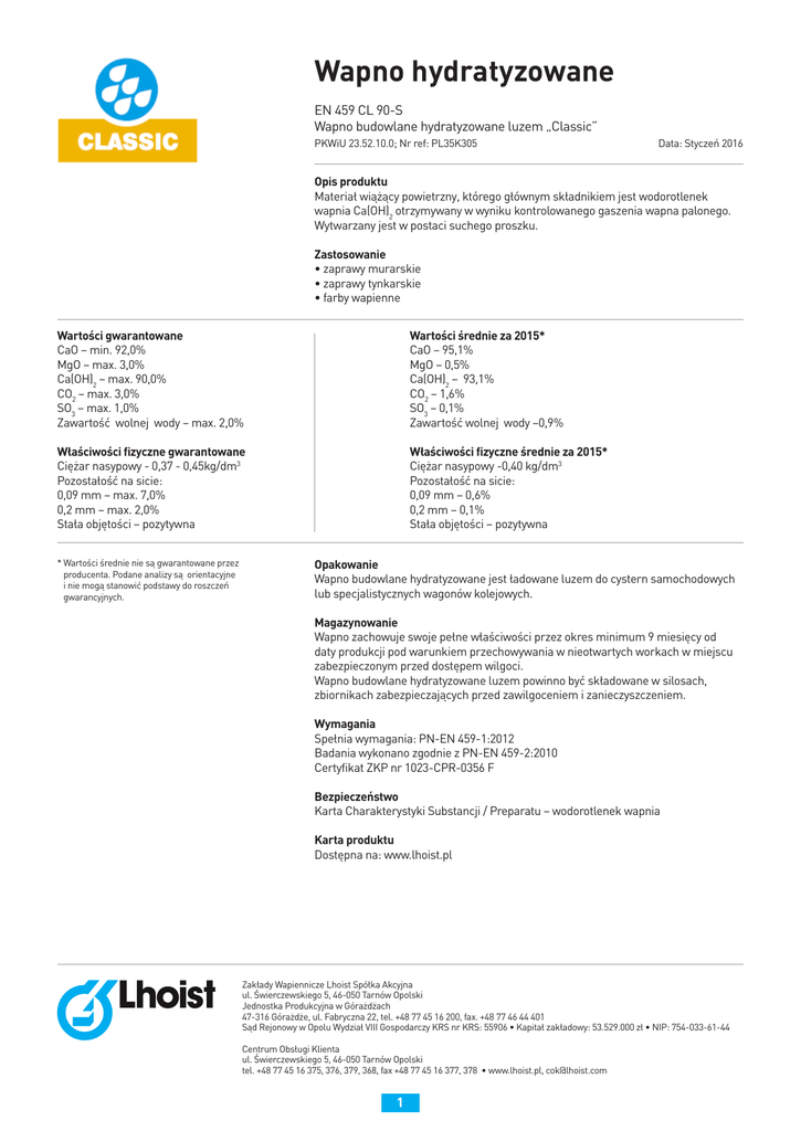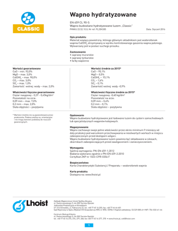 Wapno hydratyzowane Wapno hydratyzowane EN 459 CL 90-S EN 459 CL 90-S Wapno budowlane hydratyzowane luzemluzem „Classic” Wapno budowlane hydratyzowane „Classic” PKWiU 23.52.10.0; Nr ref: PL35K305 PKWiU 23.52.10.0; Nr ref: PL35K305 Data: Styczeń 2016 Wartości średnie za 2015* CaO – 95,1% MgO – 0,5% Ca(OH)2 – 93,1% CO2 – 1,6% SO3 – 0,1% Zawartość wolnej wody –0,9% Właściwości fizyczne średnie za 2015* Ciężar nasypowy -0,40 kg/dm3 Wartości gwarantowane Pozostałość na sicie: CaO – min. 92,0% 0,09mm – 0,6% MgO – max. 3,0% 0,2mm – 0,1% objętości Ca(OH) –Stała max. 90,0%– pozytywna Data: Styczeń 2016 Opis produktu Materiał wiążący powietrzny, którego głównym składnikiem jest wodorotlenek Opis produktu wapnia Ca(OH) otrzymywany w wyniku kontrolowanego gaszenia wapna palonego. Materiał wiążący powietrzny, którego2 głównym składnikiem jest wodorotlenek wapnia Wytwarzany jest w postaci suchego proszku. Ca(OH)2 otrzymywany w wyniku kontrolowanego gaszenia wapna palonego. Wytwarzany jest w postaci suchego proszku. Zastosowanie • zaprawy murarskie Zastosowanie • zaprawy murarskie• zaprawy tynkarskie • zaprawy tynkarskie• farby wapienne • farby wapienne Wartości średnie za 2015* Opakowanie CaO – 95,1% Wapno budowlane hydratyzowane jest ładowane luzem do cystern samochodowych MgO – 0,5% lub specjalistycznych wagonów kolejowych. Ca(OH)2 – 93,1% 2 CO2 – max.Wartości 3,0% gwarantowane Magazynowanie CO2 – 1,6% okres minimum 9 miesięcy od daty SO3 – max. 1,0%CaO – min. 92,0% Wapno zachowuje swoje pełne właściwości SO3przez – 0,1% produkcji pod warunkiem przechowywania w nieotwartych workach MgO – max. 3,0% 2,0% Zawartość wolnej wody – max. Zawartość wolnej wody –0,9%w miejscu Ca(OH)2 – max. 90,0% zabezpieczonym przed dostępem wilgoci. Wapno budowlane hydratyzowane luzem powinno być składowane w silosach, CO2 – max. 3,0% Właściwości fizyczne gwarantowane Właściwości fizyczne średnie za 2015* SO3 – max. 1,0% zbiornikach zabezpieczających przed zawilgoceniem i zanieczyszczeniem.3 3 Ciężar nasypowy 0,37 0,45kg/dm Ciężar nasypowy -0,40 kg/dm Zawartość wolnej wody – max. 2,0% Pozostałość na sicie: Pozostałość na sicie: Wymagania 0,09 mm – max. 7,0% fizyczne Spełnia wymagania: PN-EN 459-1:2012 0,09 mm – 0,6% Właściwości gwarantowane 0,2 mm – max. 2,0% 0,2 mm – 0,1% Badania wykonano zgodnie z PN-EN 459-2:2010 Ciężar nasypowy –- 0,37 - 0,45kg/dm3 Stała objętości pozytywna Stała objętości – pozytywna Certyfikat ZKP nr 1023-CPR-0356 F Pozostałość na sicie: 0,09mm – max. 7,0% Bezpieczeństwo 0,2mm – max. 2,0% * Wartości średnie nie są gwarantowane przez Opakowanie Karta Charakterystyki Substancji / Preparatu – wodorotlenek wapnia Stała objętości – pozytywna producenta. Podane analizy są orientacyjne Wapno budowlane hydratyzowane jest ładowane luzem do cystern samochodowych i nie mogą stanowić podstawy do roszczeń *Wartości średnie nie są gwarantowane Karta produktu lub specjalistycznych wagonów kolejowych. gwarancyjnych. przez producenta. Podane analizy są orientacyjne i nie mogą stanowić podstawy do roszczeń gwarancyjnych. Dostępna na: www.lhoist.pl Magazynowanie Wapno zachowuje swoje pełne właściwości przez okres minimum 9 miesięcy od daty produkcji pod warunkiem przechowywania w nieotwartych workach w miejscu zabezpieczonym przed dostępem wilgoci. Wapno budowlane hydratyzowane luzem powinno być składowane w silosach, zbiornikach zabezpieczających przed zawilgoceniem i zanieczyszczeniem. Wymagania Spełnia wymagania: PN-EN 459-1:2012 Badania wykonano zgodnie z PN-EN 459-2:2010 Certyfikat ZKP nr 1023-CPR-0356 F Centrum Obsługi Klienta ul. Świerczewskiego 5, 46-050 Tarnów Opolski tel.: (77) 45 16 375, 376, 379, 368; fax.: (77) 45 16 377, 378 www.lhoist.pl, [email protected] Bezpieczeństwo Karta Charakterystyki Substancji / Preparatu – wodorotlenek wapnia Zakład wapienniczy: Zakłady Wapiennicze Lhoist Spółka Akcyjna ul. Świerczewskiego 5; 46-050 Tarnów Opolski Jednostka Produkcyjna w Górażdżach 47-316 Górażdże, ul. Fabryczna 22 tel.:(77) 45 16 200; fax.: (77) 46 44 401 Sąd Rejonowy w Opolu Wydział VIII Gospodarczy KRS nr KRS: 55906 Kapitał zakładowy: 53.529.000zł; NIP: 754-033-61-44 Karta produktu Dostępna na: www.lhoist.pl Zakłady Wapiennicze Lhoist Spółka Akcyjna ul. Świerczewskiego 5, 46-050 Tarnów Opolski Jednostka Produkcyjna w Górażdżach 47-316 Górażdże, ul. Fabryczna 22, tel. +48 77 45 16 200, fax. +48 77 46 44 401 Sąd Rejonowy w Opolu Wydział VIII Gospodarczy KRS nr KRS: 55906 • Kapitał zakładowy: 53.529.000 zł • NIP: 754-033-61-44 Centrum Obsługi Klienta ul. Świerczewskiego 5, 46-050 Tarnów Opolski tel. +48 77 45 16 375, 376, 379, 368, fax +48 77 45 16 377, 378 • www.lhoist.pl, [email protected] 1 Wapno hydratyzowane Wapno hydratyzowane EN 459 CL 90-S Wapno hydratyzowane EN 459 CL 90-S Wapno budowlane luzem hydratyzowane „Classic” Wapno budowlane hydratyzowane „Classic” Wapno budowlane hydratyzowane luzem „Classic” EN 459 CL 90-S 23.52.10.0; Nr ref: PL35K305 PKWiU 23.52.10.0; Nr PKWiU ref: PL35K305 PKWiU 23.52.10.0; Nr ref: PL35K305 Data: Styczeń 2016 Data: Styczeń 2016 Wartości średnie za 2015* CaO – 95,1% MgO – 0,5% Ca(OH)2 – 93,1% CO2 – 1,6% SO3 – 0,1% Zawartość wolnej wody –0,9% Właściwości fizyczne średnie za 2015* Ciężar nasypowy -0,40 kg/dm3 Pozostałość na sicie: 0,09mm – 0,6% 0,2mm – 0,1% Stała objętości – pozytywna Wartości gwarantowane CaO – min. 92,0% MgO – max. 3,0% Ca(OH)2 – max. 90,0% CO2 – max. 3,0% SO3 – max. 1,0% Zawartość wolnej wody – max. 2,0% Właściwości fizyczne gwarantowane Ciężar nasypowy - 0,37 - 0,45kg/dm3 Pozostałość na sicie: 0,09mm – max. 7,0% 0,2mm – max. 2,0% Stała objętości – pozytywna *Wartości średnie nie są gwarantowane przez producenta. Poda