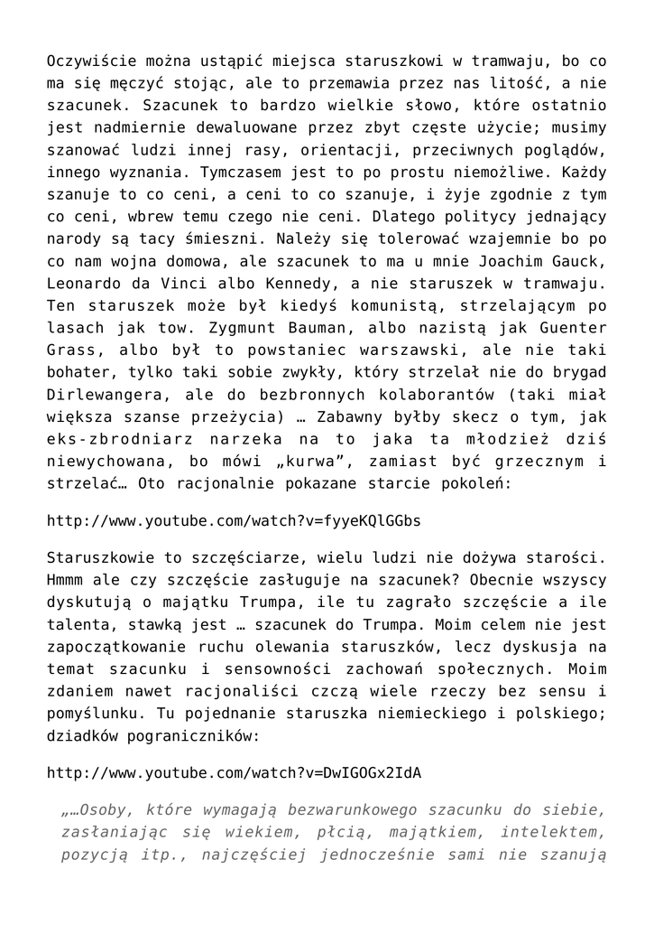Oczywiście można ustąpić miejsca staruszkowi w tramwaju, bo co ma się męczyć stojąc, ale to przemawia przez nas litość, a nie szacunek. Szacunek to bardzo wielkie słowo, które ostatnio jest nadmiernie dewaluowane przez zbyt częste użycie; musimy szanować ludzi innej rasy, orientacji, przeciwnych poglądów, innego wyznania. Tymczasem jest to po prostu niemożliwe. Każdy szanuje to co ceni, a ceni to co szanuje, i żyje zgodnie z tym co ceni, wbrew temu czego nie ceni. Dlatego politycy jednający narody są tacy śmieszni. Należy się tolerować wzajemnie bo po co nam wojna domowa, ale szacunek to ma u mnie Joachim Gauck, Leonardo da Vinci albo Kennedy, a nie staruszek w tramwaju. Ten staruszek może był kiedyś komunistą, strzelającym po lasach jak tow. Zygmunt Bauman, albo nazistą jak Guenter Grass, albo był to powstaniec warszawski, ale nie taki bohater, tylko taki sobie zwykły, który strzelał nie do brygad Dirlewangera, ale do bezbronnych kolaborantów (taki miał większa szanse przeżycia) … Zabawny byłby skecz o tym, jak eks-zbrodniarz narzeka na to jaka ta młodzież dziś niewychowana, bo mówi „kurwa”, zamiast być grzecznym i strzelać… Oto racjonalnie pokazane starcie pokoleń: http://www.youtube.com/watch?v=fyyeKQlGGbs Staruszkowie to szczęściarze, wielu ludzi nie dożywa starości. Hmmm ale czy szczęście zasługuje na szacunek? Obecnie wszyscy dyskutują o majątku Trumpa, ile tu zagrało szczęście a ile talenta, stawką jest … szacunek do Trumpa. Moim celem nie jest zapoczątkowanie ruchu olewania staruszków, lecz dyskusja na temat szacunku i sensowności zachowań społecznych. Moim zdaniem nawet racjonaliści czczą wiele rzeczy bez sensu i pomyślunku. Tu pojednanie staruszka niemieckiego i polskiego; dziadków pograniczników: http://www.youtube.com/watch?v=DwIGOGx2IdA „…Osoby, które wymagają bezwarunkowego szacunku do siebie, zasłaniając się wiekiem, płcią, majątkiem, intelektem, pozycją itp., najczęściej jednocześnie sami nie szanują innych…” Łukasz Marek Karolewski PN