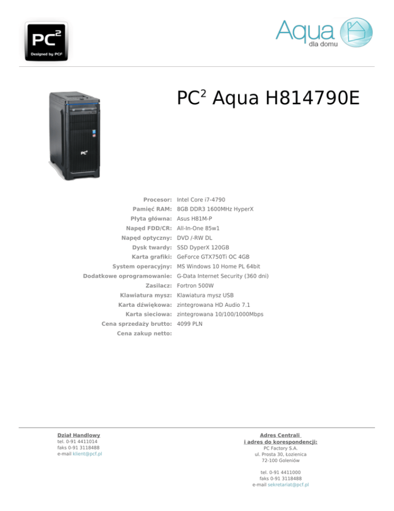 PC2 Aqua H814790E Procesor: Intel Core i7-4790 Pamięć RAM: 8GB DDR3 1600MHz HyperX Płyta główna: Asus H81M-P Napęd FDD/CR: All-In-One 85w1 Napęd optyczny: DVD /-RW DL Dysk twardy: SSD DyperX 120GB Karta grafiki: GeForce GTX750Ti OC 4GB System operacyjny: MS Windows 10 Home PL 64bit Dodatkowe oprogramowanie: G-Data Internet Security (360 dni) Zasilacz: Fortron 500W Klawiatura mysz: Klawiatura mysz USB Karta dźwiękowa: zintegrowana HD Audio 7.1 Karta sieciowa: zintegrowana 10/100/1000Mbps Cena sprzedaży brutto: 4099 PLN Cena zakup netto: Dział Handlowy tel. 0-91 4411014 faks 0-91 3118488 e-mail [email protected] Adres Centrali i adres do korespondencji: PC Factory S.A. ul. Prosta 30, Łozienica 72-100 Goleniów tel. 0-91 4411000 faks 0-91 3118488 e-mail [email protected]