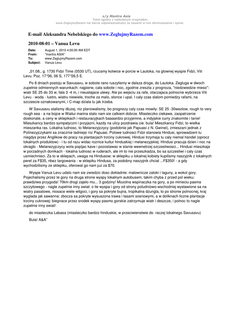 s/y Mantra Asia Tekst zgodny z nadesłanym oryginałem. www.ZeglujmyRazem nie bierze odpowiedzialności za zawarte w nim sformułowania i opinie. E-mail Aleksandra Nebelskiego do www.ZeglujmyRazem.com 2010-08-01 – Vanua Levu Date: From: To: Subject: August 1, 2010 4:00:00 AM EDT "mantra ASIA" www.ZeglujmyRazem.com Vanua Levu „01.08., g. 1730 Fidzi Time (0530 UT), rzucamy kotwice w porcie w Lautoka, na glownej wyspie Fidzi, Viti Levu. Poz. 17°36, 06 S, 177°26,5 E. Po 8 dniach postoju w Savusavu, w sobote rano ruszylismy w dalsza droge, do Lautoka. Zegluga w dwoch zupelnie odmiennych warunkach: najpierw, cala sobote i noc, zgodnie zreszta z prognoza, "niedzwiedzie mieso": wiatr SE 25 do 33 w, fala 3 -4 m, i nieustajace ulewy. Ale po wejsciu za rafe, otaczajaca polnocne wybrzeza Viti Levu - woda - lustro, wiatru niewiele, troche za malo, slonce i upal. I caly czas slalom pomiedzy rafami, na szczescie oznakowanymi, i C-map dziala tu jak trzeba. W Savusavu stalismy dluzej, niz planowalismy, bo prognozy caly czas mowily: SE 25 -30wezlow, rough to very rough sea - a na bojce w Waitui marina stalo nam sie calkiem dobrze. Miasteczko ciekawe, zaopatrzenie doskonale, a ceny w sklepikach i restauracyjkach baaaardzo przyjemne, a indyjskie curry znakomite i tanie! Mieszkancy bardzo sympatyczni i przyjazni, kazdy na ulicy pozdrawia cie: bula! Mieszkancy Fidzi, to wielka mieszanka ras. Lokalna ludnosc, to Melanezyjczycy (podobnie jak Papuasi z N. Gwinei), zmieszani jednak z Polinezyjczykami sa znacznie ladniejsi niz Papuasi. Polowe ludnosci Fidzi stanowia Hindusi, sprowadzeni tu niegdys przez Anglikow do pracy na plantacjach trzciny cukrowej. Hindusi trzymaja tu caly niemal handel (oprocz lokalnych produktow) - i tu od razu widac roznice kultur hinduskiej i melanezyjskiej: Hindusi pracuja dzien i noc na okraglo - Melanezyjczycy wola popijac kave i pozostawac w stanie wewnetrzej szczesliwosci... Hindusi mieszkaja w porzadnych domkach - lokalna ludnosc w ruderach, ale im to nie przeszkadza, bo sa szczesliwi i caly czas usmiechnieci. Za to w sklepach, uwaga na Hindusow: w sklepiku u lokalnej kobiety kupilismy naszyjnik z lokalnych perel za F$35, nbez targowania - w sklepiku Hindusa, za podobny naszyjnik chcial ...F$350! - a gdy wychodzilismy ze sklepiku, oferowal go nam juz za $70. Wyspe Vanua Levu udalo nam sie zwiedzic dosc dokladnie: malownicze zatoki i laguny, a wokol gory. Pojechalismy przez te gory na druga strone wyspy lokalnym autobusem, takim chyba z przed pol wieku: prawdziwa przygoda! 70km drogi zajelo mu... 3 godziny! Mozolna wspinaczka na gory, a po minieciu pasma szczytowego - nagle zupelnie inny swiat: o ile wyspa i gory od strony poludniowo-wschodniej wystawione sa na wiatry pasatowe, niosace wiele wilgoci, i gory sa pokryte bujna, tropikalna dzungla, to po stronie polnocnej, kraj wyglada jak sawanna: zbocza sa pokryte wysuszona trawa i lasami sosnowymi, a w doliknach liczne plantacje trzciny cukrowej: biegnace przez srodek wyspy pasmo gorskie zatrzymuje wiatr i deszcze, i polnoc to nagle zupelnie inny swiat! do miasteczka Labasa (miasteczko bardzo hinduskie, w przeciwienstwie do raczej lokalnego Savusavu) Bula! A&A” s/y Mantra Asia 2 wg: http://www.ezilon.com/maps/images/oceania/f01pol.gif