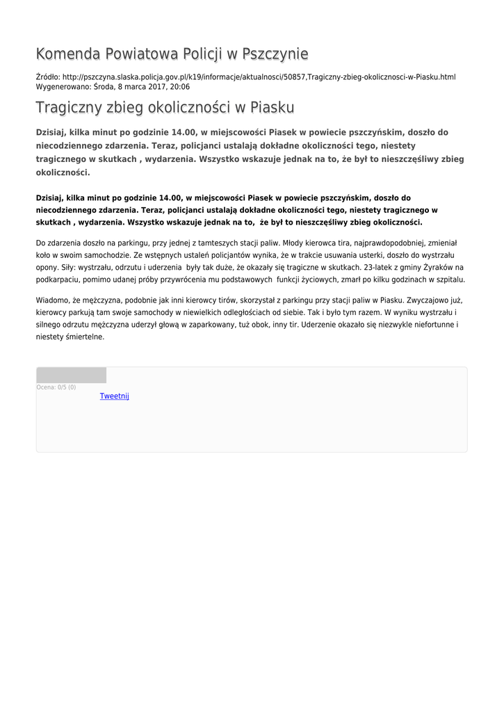Komenda Powiatowa Policji w Pszczynie Źródło: http://pszczyna.slaska.policja.gov.pl/k19/informacje/aktualnosci/50857,Tragiczny-zbieg-okolicznosci-w-Piasku.html Wygenerowano: Środa, 8 marca 2017, 20:06 Tragiczny zbieg okoliczności w Piasku Dzisiaj, kilka minut po godzinie 14.00, w miejscowości Piasek w powiecie pszczyńskim, doszło do niecodziennego zdarzenia. Teraz, policjanci ustalają dokładne okoliczności tego, niestety tragicznego w skutkach , wydarzenia. Wszystko wskazuje jednak na to, że był to nieszczęśliwy zbieg okoliczności. Dzisiaj, kilka minut po godzinie 14.00, w miejscowości Piasek w powiecie pszczyńskim, doszło do niecodziennego zdarzenia. Teraz, policjanci ustalają dokładne okoliczności tego, niestety tragicznego w skutkach , wydarzenia. Wszystko wskazuje jednak na to, że był to nieszczęśliwy zbieg okoliczności. Do zdarzenia doszło na parkingu, przy jednej z tamteszych stacji paliw. Młody kierowca tira, najprawdopodobniej, zmieniał koło w swoim samochodzie. Ze wstępnych ustaleń policjantów wynika, że w trakcie usuwania usterki, doszło do wystrzału opony. Siły: wystrzału, odrzutu i uderzenia były tak duże, że okazały się tragiczne w skutkach. 23-latek z gminy Żyraków na podkarpaciu, pomimo udanej próby przywrócenia mu podstawowych funkcji życiowych, zmarł po kilku godzinach w szpitalu. Wiadomo, że mężczyzna, podobnie jak inni kierowcy tirów, skorzystał z parkingu przy stacji paliw w Piasku. Zwyczajowo już, kierowcy parkują tam swoje samochody w niewielkich odległościach od siebie. Tak i było tym razem. W wyniku wystrzału i silnego odrzutu mężczyzna uderzył głową w zaparkowany, tuż obok, inny tir. Uderzenie okazało się niezwykle niefortunne i niestety śmiertelne. Ocena: 0/5 (0) Tweetnij