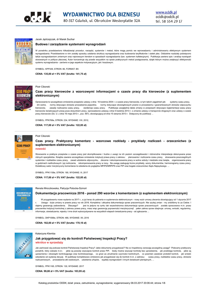 Jacek Jędrzejczak, dr Marek Suchar Budowa i zarządzanie systemami wynagrodzeń W poradniku przedstawiono kilkadziesiąt procedur, narzędzi, systemów i metod, które mogą pomóc we wprowadzeniu i administrowaniu efektywnym systemem wynagradzania. Przedstawione w nim zostały sposoby ustalania struktury wynagradzania oraz budowania taryfikatorów i siatek płac. Oddzielne rozdziały poświęcono także wynagrodzeniom zmiennym oraz najnowszym trendom w sposobach wynagradzania (tzw. systemem kafeteryjnym). Publikacja zawiera opis i analizę rozwiązań stosowanych w polityce płacowej. Autor koncentruje się przede wszystkim na opisie praktycznych metod postępowania, dzięki którym można zwiększyć efektywność systemu wynagradzania - zarówno w jego aspekcie motywacyjnym, jak i kosztowym. SYMBOL: KPP349, STRON: 86, FORMAT: B5 CENA: 135,00 zł + 5% VAT (brutto: 141,75 zł) Piotr Ciborski Czas pracy kierowców z wzorcowymi informacjami o czasie pracy dla kierowców (z suplementem elektronicznym) Opracowanie to szczegółowe omówienie przepisów ustawy z dnia 16 kwietnia 2004 r. o czasie pracy kierowców, w tym takich zagadnień jak: systemy czasu pracy, dni wolne, normy dotyczące okresów prowadzenia pojazdów, normy dotyczące obowiązkowych przerw w prowadzeniu i gwarantowanych okresów odpoczynku kierowców, zasady rozliczania czasu pracy, ewidencja czasu pracy. Publikacja uwzględnia także zmiany w przepisach dotyczące reglamentacji czasu pracy kierowców świadczących pracę poza stosunkiem pracy, wprowadzone ustawą z dnia 5 kwietnia 2013 r. o zmianie ustawy o transporcie drogowym oraz ustawy o czasie pracy kierowców (Dz. U. z dnia 16 maja 2013 r., poz. 567), obowiązującą od dnia 15 sierpnia 2013 r. Dołączony do publikacji ... SYMBOL: PPK768e, STRON: 234, WYDANIE: VIII, 2012, CENA: 117,00 zł + 5% VAT (brutto: 122,85 zł) Piotr Ciborski Czas pracy. Praktyczny komentarz - wzorcowe rozkłady - przykłady rozliczeń - orzecznictwo (z suplementem elektronicznym) nowość Stosowanie w praktyce przepisów o czasie pracy jest skomplikowane i trudne z uwagi na ich poziom szczegółowości i różnorodne interpretacje dokonywane przez różnych specjalistów. Książka zawiera szczegółowe omówienie instytucji prawa pracy z zakresu: planowania i rozliczania czasu pracy, stosowania poszczególnych systemów i rozkładów czasu pracy, zasad udzielania odpoczynku, zlecania i rekompensowania pracy w wolne soboty i niedziele oraz święta, organizowania pracy w godzinach nadliczbowych i jej rozliczania, rekompensowania pracy w nocy. Na uwagę zasługuję liczne przykłady, wzory dokumentów, harmonogramy czasu pracy. Dodatkowy walor merytoryczny komentarze to odesłania do poglądów MPiPS/MRPiPS oraz PIP oraz bogate orzecznictwo Sądu Najwyższego. ... SYMBOL: PPK1158e, STRON: 180, WYDANIE: III, 2017 CENA: 117,00 zł + 5% VAT (brutto: 122,85 zł) Renata Mroczkowska, Patrycja Potocka-Szmoń Dokumentacja pracownicza 2016 - ponad 290 wzorów z komentarzem (z suplementem elektronicznym) W przygotowaniu nowe wydanie na 2017 r., a już teraz do pobrania w suplemencie elektronicznym - nowy wzór umowy zlecenia obowiązujący od 1 stycznia 2017 r. Uwaga - duże zmiany w prawie pracy na rok 2016. Kompletna i aktualna dokumentacja spraw pracowniczych. Nie szukaj zmian - my zrobiliśmy to za Ciebie. I dajemy gwarancję zadowolenia. Dlaczego? jest to jedyna na rynku tak wszechstronna dokumentacja spraw pracowniczych została opracowana m.in. przez pracownika instytucji kontrolnej z zakresu prawa pracy, masz więc gwarancję poprawności merytorycznej! pełen zakres spraw obejmuje: umowy, wnioski, regulaminy, informacje, oświadczenia, rejestry i inne druki wykorzystywane na wszystkich etapach świadczenia pracy - od zgłoszenia ... SYMBOL: DKP1068e, STRON: 466, WYDANIE: XII, 2016 CENA: 162,00 zł + 5% VAT (brutto: 170,10 zł) Katarzyna Klemba Jak przygotować się do kontroli Państwowej Inspekcji Pracy? wkrótce w sprzedaży Jak zachować się podczas kontroli Państwowej Inspekcji Pracy? Jakie dokumenty przygotować? Na co Inspektorzy zwracają szczególną uwagę? Polecamy praktyczny poradnik, który wskaże m.in.: jakie są powody wszczęcia kontroli przez PIP, kiedy można wszcząć kontrolę bez uprzedzenia, jak przebiega kontrola, jakie są uprawnienia i obowiązki kontrolującego oraz kontrolowanego, co grozi za utrudnianie czynności kontrolnych, co powinien zawierać protokół kontroli, jak wnieść odwołanie od wydanej decyzji. W publikacji kompleksowo omówiono jak przygotować się do kontroli m.in. z zakresu: czasu pracy, rozkładów czasu pracy, okresów rozliczeniowych, prowadzenia akt osobowych, udzielania urlopów, wypłaty wynagrodzeń i innych świadczeń pieniężnych, ... SYMBOL: PPK1165, STRON: 130, WYDANIE: 2017 CENA: 99,00 zł + 5% VAT (brutto: 103,95 zł) Katalog produktów ODDK; dział: praca, zatrudnienie, wynagrodzenie; wygenerowany 08.03.2017 20:06:44; strona 1/6 Robert Jakrzewski Jak rekrutować pracowników przez Internet Jak rekrutować pracowników przez Internet? Skuteczność rekrutacji jest w dużej mierze uzależniona od naszego przygotowania do niej i od prawidłowego rozpoznania potrzeb kadrowych naszej firmy. Kiedy już dokonaliśmy takowego rozpoznania, staje przed nami pytanie, jak dotrzeć do najlepszych. Metod i sposobów jest wiele. W ostatnich latach obserwuje się intensywny wzrost możliwości rekrutowania przez Internet. Samodzielne zgłębianie wiedzy na temat, gdzie zacząć i jak prawidło opracować strategię rekrutacji internetowej, może być przytłaczające i nastręczać wiele problemów. Wychodząc zatem naprzeciw potrzebom młodych menedżerów, Autor opracował swego rodzaju drogę na skróty, ukazującą sposób rekrutowania i metody dostępne na rynkach zagranicznych, polskich ... SYMBOL: PPK214, STRON: 64, FORMAT: A5, WYDANIE: 2006 CENA: 108,00 zł + 5% VAT (brutto: 113,40 zł) Jacek Antoni Suchar Jak uniknąć dyskrymina