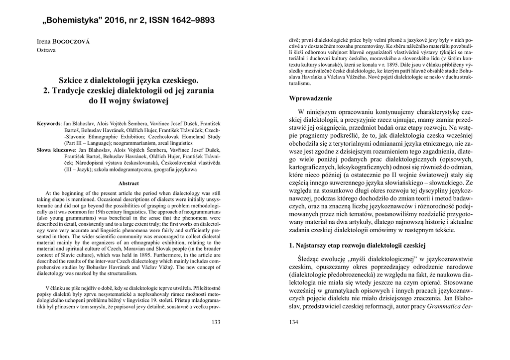 „Bohemistyka” 2016, nr 2, ISSN 1642–9893 Irena BOGOCZOVÁ Ostrava Szkice z dialektologii języka czeskiego. 2. Tradycje czeskiej dialektologii od jej zarania do II wojny światowej Keywords: Jan Blahoslav, Alois Vojtěch Šembera, Vavřinec Josef Dušek, František Bartoš, Bohuslav Havránek, Oldřich Hujer, František Trávníček; Czech-Slavonic Ethnographic Exhibition; Czechoslovak Homeland Study (Part III – Language); neogrammarianism, areal linguistics Słowa kluczowe: Jan Blahoslav, Alois Vojtěch Šembera, Vavřinec Josef Dušek, František Bartoš, Bohuslav Havránek, Oldřich Hujer, František Trávníček; Národopisná výstava českoslovanská, Československá vlastivěda (III – Jazyk); szkoła młodogramatyczna, geografia językowa Abstract At the beginning of the present article the period when dialectology was still taking shape is mentioned. Occasional descriptions of dialects were initially unsystematic and did not go beyond the possibilities of grasping a problem methodologically as it was common for 19th century linguistics. The approach of neogrammarians (also young grammarians) was beneficial in the sense that the phenomena were described in detail, consistently and to a large extent truly; the first works on dialectology were very accurate and linguistic phenomena were fairly and sufficiently presented in them. The wider scientific community was encouraged to collect dialectal material mainly by the organizers of an ethnographic exhibition, relating to the material and spiritual culture of Czech, Moravian and Slovak people (in the broader context of Slavic culture), which was held in 1895. Furthermore, in the article are described the results of the inter-war Czech dialectology which mainly includes comprehensive studies by Bohuslav Havránek and Václav Vážný. The new concept of dialectology was marked by the structuralism. V článku se píše nejdřív o době, kdy se dialektologie teprve utvářela. Příležitostné popisy dialektů byly zprvu nesystematické a nepřesahovaly rámec možností metodologického uchopení problému běžný v lingvistice 19. století. Přístup mladogramatiků byl přínosem v tom smyslu, že popisoval jevy detailně, soustavně a vcelku prav- 133 divě; první dialektologické práce byly velmi přesné a jazykové jevy byly v nich poctivě a v dostatečném rozsahu prezentovány. Ke sběru nářečního materiálu povzbudili širší odbornou veřejnost hlavně organizátoři vlastivědné výstavy týkající se materiální i duchovní kultury českého, moravského a slovenského lidu (v širším kontextu kultury slovanské), která se konala v r. 1895. Dále jsou v článku přiblíženy výsledky meziválečné české dialektologie, ke kterým patří hlavně obsáhlé studie Bohuslava Havránka a Václava Vážného. Nové pojetí dialektologie se neslo v duchu strukturalismu. Wprowadzenie W niniejszym opracowaniu kontynuujemy charakterystykę czeskiej dialektologii, a precyzyjnie rzecz ujmując, mamy zamiar przedstawić jej osiągnięcia, przedmiot badań oraz etapy rozwoju. Na wstępie pragniemy podkreślić, że to, jak dialektologia czeska wcześniej obchodziła się z terytorialnymi odmianami języka etnicznego, nie zawsze jest zgodne z dzisiejszym rozumieniem tego zagadnienia, dlatego wiele poniżej podanych prac dialektologicznych (opisowych, kartograficznych, leksykograficznych) odnosi się również do odmian, które nieco później (a ostatecznie po II wojnie światowej) stały się częścią innego suwerennego języka słowiańskiego – słowackiego. Ze względu na stosunkowo długi okres rozwoju tej dyscypliny językoznawczej, podczas którego dochodziło do zmian teorii i metod badawczych, oraz na znaczną liczbę językoznawców i różnorodność podejmowanych przez nich tematów, postanowiliśmy rozdzielić przygotowany materiał na dwa artykuły, dlatego najnowszą historię i aktualne zadania czeskiej dialektologii omówimy w następnym tekście. 1. Najstarszy etap rozwoju dialektologii czeskiej Śledząc ewolucję „myśli dialektologicznej” w językoznawstwie czeskim, opuszczamy okres poprzedzający odrodzenie narodowe (dialektologie předobrozenecká) ze względu na fakt, że naukowa dialektologia nie miała się wtedy jeszcze na czym opierać. Stosowane wcześniej w gramatykach opisowych i innych pracach językoznawczych pojęcie dialektu nie miało dzisiejszego znaczenia. Jan Blahoslav, przedstawiciel czeskiej reformacji, autor pracy Grammatica čes134 ká (1571) zawierającej (końcowy) rozdział zatytułowany De dialectis, używając wyrazu dialekty oraz wymieniając „Boemica dyalectus”, „Slovenský dyalectus” i „Polský dyalectus”, miał na myśli po prostu języki lub inne większe zespoły językowo-gwarowe. Autor pochlebnie wyrażał się na temat języka czeskiego, który uważał za „wygodny” (dosłownie: prostranný), któremu niepotrzebne jest „nepěkné skrze nos mluvení” dostrzegane u sąsiednich Polaków, którzy „jakýms nám nepříjemným huhnáním velmi sobě svůj hovor kazí” (Blahoslav 1991, s. 369)1. Klasyfikacja i charakterystyka tychże „dialektów” odzwierciedla zarówno niegdysiejszy poziom wiedzy z zakresu językoznawstwa, jak również specyficzne pojmowanie dostępnych informacji. Choć opisy te mogą dziś wywoływać uśmiech, przyznać należy, że uczynione naówczas spostrzeżenia były cennym osiągnięciem badawczym2. Fundamenty naukowej dialektologii zostały położone dopiero pod koniec XIX w., w okresie badań „praw głosowych” prowadzonych przez młodogramatyków, pierwotnie niemieckich. Również czescy młodogramatycy, w myśl pozytywistycznej filozofii i metody lingwistycznej, docierającej przede wszystkim z Lipska i Wiednia, polegali na niezawodnym materiale językowym, zanotowanym w terenie lub zaczerpniętym z miarodajnych źródeł (słowniki, artykuły opublikowane w literaturze fachowej, korespo