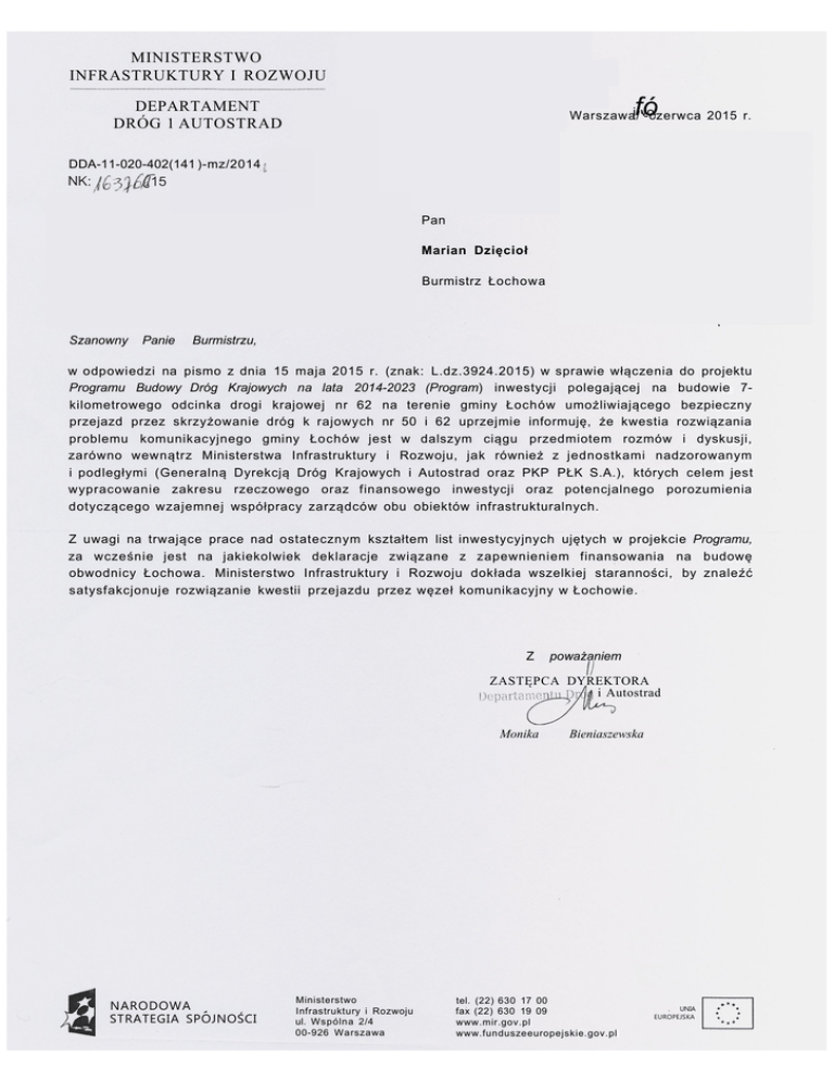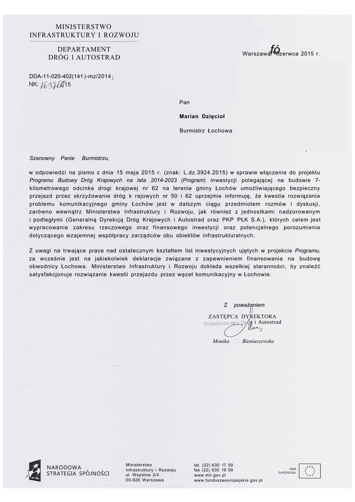 MINISTERSTWO INFRASTRUKTURY I ROZWOJU fó DEPARTAMENT DRÓG 1 AUTOSTRAD i vor Warszawa/'-czerwca 2015 r. DDA-11-020-402(141 )-mz/2014 Pan Marian Dzięcioł Burmistrz Łochowa Szanowny Panie Burmistrzu, w odpowiedzi na pismo z dnia 15 maja 2015 r. (znak: L.dz.3924.2015) w sprawie włączenia do projektu Programu Budowy Dróg Krajowych na lata 2014-2023 (Program) inwestycji polegającej na budowie 7kilometrowego odcinka drogi krajowej nr 62 na terenie gminy Łochów umożliwiającego bezpieczny przejazd przez skrzyżowanie dróg k rajowych nr 50 i 62 uprzejmie informuję, że kwestia rozwiązania problemu komunikacyjnego gminy Łochów jest w dalszym ciągu przedmiotem rozmów i dyskusji, zarówno wewnątrz Ministerstwa Infrastruktury i Rozwoju, jak również z jednostkami nadzorowanym i podległymi (Generalną Dyrekcją Dróg Krajowych i Autostrad oraz PKP PŁK S.A.), których celem jest wypracowanie zakresu rzeczowego oraz finansowego inwestycji oraz potencjalnego porozumienia dotyczącego wzajemnej współpracy zarządców obu obiektów infrastrukturalnych. Z uwagi na trwające prace nad ostatecznym kształtem list inwestycyjnych ujętych w projekcie Programu, za wcześnie jest na jakiekolwiek deklaracje związane z zapewnieniem finansowania na budowę obwodnicy Łochowa. Ministerstwo Infrastruktury i Rozwoju dokłada wszelkiej staranności, by znaleźć satysfakcjonuje rozwiązanie kwestii przejazdu przez węzeł komunikacyjny w Łochowie. Z poważaniem ZASTĘPCA DYREKTORA i Autostrad Monika NARODOWA STRATEGIA SPOJNOŚCI Ministerstwo Infrastruktury i Rozwoju ul. Wspólna 2/4 00-926 Warszawa Bieniaszewska tel. (22) 630 17 00 fax (22) 630 19 09 www.mir.gov.pl www.funduszeeuropejskie.gov.pl . UNIA EUROPEJSKA
