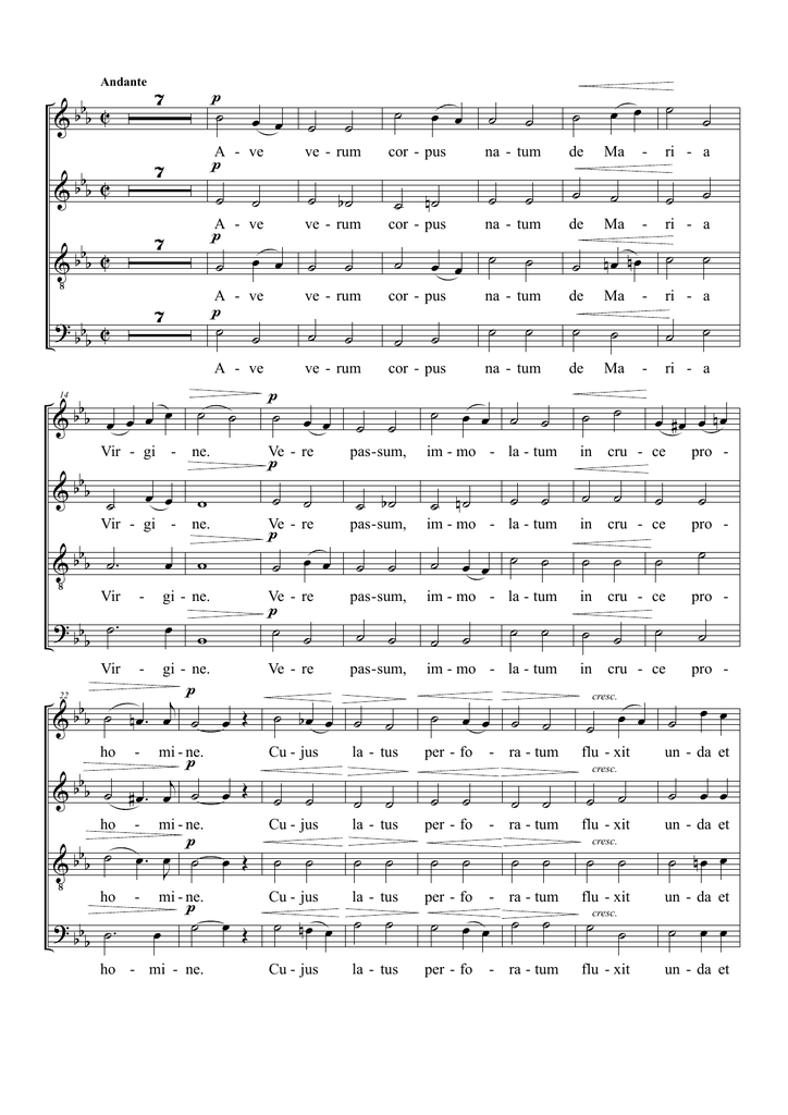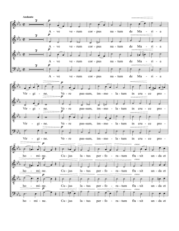 Andante b &bb C b &bb C b Vbb C 7 p ˙ ˙. Vir ˙ ne. œ œ w - - ne. œ w ho ? bb ˙ . b ˙ ˙ - - ˙ p ˙ ˙ Ve - re p ˙ œ œ ˙ mi - ne. mi - ne. p ˙ mi - ne. ho - mi - ne. Ve - re œ Œ œ Œ œ Œ œ Œ n˙ ˙ œ œ cor - pus ˙ pas - sum, ˙ b˙ pas - sum, ˙ ˙ ˙ ˙ pas - sum, pas - sum, ˙ bœ œ ˙ Cu - jus ˙ ˙ ˙ ˙ Cu - jus Cu - jus la - tus ˙ ˙ ˙ ˙ la - tus la - tus ˙ nœ œ ˙ Cu - jus ˙ ˙ la - tus de Ma ˙ ˙ ˙ ˙ ˙ ˙ ˙ ˙ ˙ na - tum de de ˙ ˙ na - tum œ œ ˙ ˙ im - mo - la - tum ˙ ˙ œ œ ˙ ˙ ˙ ˙ ˙ n˙ im - mo - la - tum ˙ im - mo - la - tum ˙ ˙ im - mo - la - tum ˙ œ œ per - fo ˙ ˙ ˙ ˙ per - fo per - fo ˙ ˙ - ra - tum ˙ ˙ ˙ ˙ - ra - tum - ra - tum œ œ per - fo ˙ ˙ ˙ - ra - tum ˙ ˙ ˙ Ma - ri - a ˙ - ˙ in ˙ ri - a Ma ˙ ri - a - ˙ de - ˙ ri - a œ #œ œ nœ cru - ce ˙ ˙ Ma nœ nœ ˙ na - tum ˙ œ œ ˙ ˙ na - tum cor - pus ˙ Ve - re gi - ne. œ p ˙ œ œ ˙ ˙ cor - pus cor - pus w p œ. œ ˙ J - p ˙ œ œ ve - rum Ve - re œ - ve - rum ˙ ˙ ve - rum gi - ne. p bb b j & ˙ #œ. œ ˙ b Vbb ˙ ˙ A - ve p j bb ˙ nœ. œ ˙ & b ho ˙ œ œ p ˙ 22 ho b˙ A - ve - Vir - gi b ˙ ˙ A - ve b &bb ˙ ? bb ˙ p ˙ Vir - gi Vir ve - rum 7 bb b V b b ˙. A - ve ˙ p & b œ œ œ œ 14 ˙ ˙ 7 7 ? b C bb œ œ ˙ ˙ ˙ ˙ pro - ˙ in cru - ce pro - in cru - ce pro - ˙ ˙ ˙ in ˙ ˙ ˙ cru - ce cresc. ˙ œ œ flu - xit cresc. ˙ ˙ ˙ ˙ flu - xit cresc. flu - xit ˙ cresc. ˙ flu - xit pro - ˙ œ œ ˙ œ œ un - da et un - da et ˙ nœ œ un - da et ˙ œ œ un - da et b & b b œ nœ œ œ p ˙ 30 bb san - gui & b ˙ san - - b &bb œ œ œ œ ˙ b &bb ˙ in b Vbb ˙ in ? bb ˙ b in b &bb ˙ 45 bb ex ˙ ex œ œ ex ˙ ex ˙ Je - su, & b ˙ ˙ b ˙ Vbb ˙ ? b ˙ bb ˙ Je - su, Je - su, Je - su, œ œ p ˙ - - a ˙ - - p ˙ ˙ a - mi - ne. ˙. œ p ˙ p ˙ - mi - ne. ˙˙ p ˙ a - mi - ne. ˙. a œ - mi - ne. p œ œ œ œ ˙ fi ˙ fi ˙ fi ˙ fi - sto ˙ - sto œ œ E - sto gui - ne; - ˙ œ œ p œ Œ ˙ ne; ˙ Œ pE pE œ Œ ˙ p ˙ 37 in ne; gui - ne; san - gui san p - œ œ b V b b œ œ bœ œ ? bb ˙ . b p œ Œ ˙ p œ œ ˙ œ O ˙ O ˙ œ Œ O ˙ ˙ O p ˙ œ œ œ œ - li Ma - ri - ae, In p œ œ ˙ ˙ ˙ no - bis Je - su œ œ Je - su ˙ œ œ - li Ma - ri - ae, In œ œ œ ˙ nœ œ prae - gu - œ œ œ œ ˙ prae - gu - œ œ œ œ p prae - gu ˙ dul - cis, ˙ ˙ ˙ dul - cis, œ œ dul - cis, O œ ˙ sta - tum, ˙ ˙ ˙ sta - tum, sta - tum, ˙ ˙ sta - tum, O Je - su pi - e, ˙ œ œ O Je - su ˙ bœ œ cresc. O ˙ Je - su cresc. ˙ Je - su œ œ cresc. cresc. œ œ œ œ ˙ œ œ œ œ œ œ ˙ œ œ no -bis mi - se - re - re, In cresc. œ - li Ma - ri - ae, In no -bis mi - se - re - re, In ˙ ˙ ˙ no -bis mi - se - re - re, In œ œ œ œ ˙ œ œ cresc. cresc. dul - cis, p ˙ - f ˙ ˙ no -bis mi - se - re - re, In œ - cresc. molto p œ œ ˙ Je - su prae - gu cresc. molto p œ œ ˙ Je - su - li Ma - ri - ae, In œ œ b˙ ˙ cresc. molto no - bis ˙ Œ no - bis ˙ E - sto œ ˙ ˙ ˙ cresc. molto no - bis ˙ Œ ˙ ˙ œ œ cresc. ˙ ˙ f Mor - tis ˙ ˙ f ˙ Mor - tis ˙ f ˙ Mor - tis ˙ Mor - tis f ˙ ˙ f Je - su, pi - e, f Je - su, n˙ ˙ pi - e, f ˙ ˙ ˙ ˙ ˙ ˙ ˙ ˙ œ nœ œ ˙ Je - su, pi - e, œ ˙ Je - su, ˙ ƒ œ œ ƒ œ œ no-bis mi - se - re - re, O œ œ œ œ b˙ œ œ œ œ ˙ no-bis mi - se - re - re, O ƒ œ œ ƒ œ œ no-bis mi - se - re - re, O œ œ œ œ ˙ no-bis mi - se - re - re, O b œ œ œ œ b & b œ œ œ œ 52 Je - su, In no - bis mi - se - re b &bb œ œ œ œ œ œ œ œ Je - su, In œ bœ œ œ Je - su, In œ nœ œ Je - su, In & b b &bb b Vbb ? bb b ˙ œ men! Œ œ Œ ˙ œ Œ men! ˙ w A w ˙ - ˙˙ ˙ w dim. ˙ œ ˙ œ - men! men! p ˙ œ ˙ œ p Œ w ˙ p Œ w A - p w œ Œ w p ˙ ˙ A œ re. re. men! ˙ p ˙ - men! œ re. re. - ˙ - - p ˙ - A w ˙ A - dim. no - bis mi - se - re ˙ men! œ ˙ dim. no - bis mi - se - re œ œ ? bb œ œ b bb ˙ no - bis mi - se - re b œ nœ Vbb œ œ 59 ˙ dim. A Œ Œ Œ Œ π ˙ œ Œ ˙˙ œœ Œ - men! p ˙ - men! ˙ - A π w ˙ A A ˙ men! ˙ men! ˙ - p w œ Œ ˙ A - p #w A - p n ww A - A p ˙ - ˙ men! Œ Ó w œ w œ ww œœ Œ Ó w w œ Œ Ó œ men! π ww A - men! π w A - men! A - men! Œ Ó