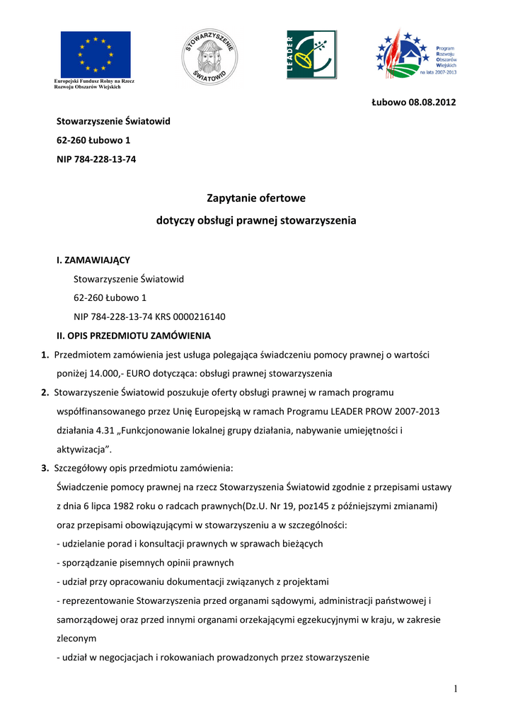 Europejski Fundusz Rolny na Rzecz Rozwoju Obszarów Wiejskich Łubowo 08.08.2012 Stowarzyszenie Światowid 62-260 Łubowo 1 NIP 784-228-13-74 Zapytanie ofertowe dotyczy obsługi prawnej stowarzyszenia I. ZAMAWIAJĄCY Stowarzyszenie Światowid 62-260 Łubowo 1 NIP 784-228-13-74 KRS 0000216140 II. OPIS PRZEDMIOTU ZAMÓWIENIA 1. Przedmiotem zamówienia jest usługa polegająca świadczeniu pomocy prawnej o wartości poniżej 14.000,- EURO dotycząca: obsługi prawnej stowarzyszenia 2. Stowarzyszenie Światowid poszukuje oferty obsługi prawnej w ramach programu współfinansowanego przez Unię Europejską w ramach Programu LEADER PROW 2007-2013 działania 4.31 „Funkcjonowanie lokalnej grupy działania, nabywanie umiejętności i aktywizacja”. 3. Szczegółowy opis przedmiotu zamówienia: Świadczenie pomocy prawnej na rzecz Stowarzyszenia Światowid zgodnie z przepisami ustawy z dnia 6 lipca 1982 roku o radcach prawnych(Dz.U. Nr 19, poz145 z późniejszymi zmianami) oraz przepisami obowiązującymi w stowarzyszeniu a w szczególności: - udzielanie porad i konsultacji prawnych w sprawach bieżących - sporządzanie pisemnych opinii prawnych - udział przy opracowaniu dokumentacji związanych z projektami - reprezentowanie Stowarzyszenia przed organami sądowymi, administracji państwowej i samorządowej oraz przed innymi organami orzekającymi egzekucyjnymi w kraju, w zakresie zleconym - udział w negocjacjach i rokowaniach prowadzonych przez stowarzyszenie 1 Europejski Fundusz Rolny na Rzecz Rozwoju Obszarów Wiejskich - nadzór nad postępowaniem egzekucyjnym i udzielanie pomocy prawnej w windykacji należności - przygotowywanie i opiniowanie umów - opracowywanie projektów uchwał - udział w Walnym Zgromadzeniu Członków - wykonywanie innych czynności związanych ze świadczeniem pomocy prawnej zlecanych przez Stowarzyszenie III. TERMIN WYKONANIA ZAMÓWIENIA Termin wykonania przedmiotu zamówienia: od 01.09.2012 r.do 30.06.2015 roku IV. OPIS SPOSBU PRZYGOTOWANIA OFERTY 1. Oferent powinien stworzyć ofertę na formularzu załączonym do niniejszego zapytania. 2. Oferent nie może być związany jakąkolwiek formą zatrudnienia z podmiotami będącymi członkami zwyczajnymi Stowarzyszenia Światowid Oferta powinna być: - opatrzona pieczątką firmową, - posiadać datę sporządzenia, - zawierać adres lub siedzibę oferenta, numer telefonu, numer NIP, - podpisana czytelnie przez wykonawcę. V. MIEJSCE ORAZ TERMIN SKŁADANIA OFERT 1. Oferta powinna być przesłana za pośrednictwem: poczty elektronicznej na adres: [email protected], faksem na nr: 61/4275950, poczty, kuriera lub też dostarczona osobiście na adres: Stowarzyszenie Światowid 62-260 Łubowo 1 do dnia 15.09.2012 roku wraz z załączoną kserokopią wypisu z rejestru przedsiębiorców lub zaświadczenia z ewidencji działalności gospodarczej, wystawione w dacie nie wcześniejszej niż sześć miesięcy przed datą złożenia oferty. Decyduje data wpływu do biura stowarzyszenia. 2. Ocena ofert zostanie dokonana w dniu 17.09.2012 a wyniki i wybór najkorzystniejszej oferty zostanie ogłoszony o godzinie 15:00 w siedzibie Stowarzyszenia Światowid 62-260 Łubowo 1 oraz na stronie internetowej pod adresem www.swiatowidlubowo.pl 3. Oferty złożone po terminie nie będą rozpatrywane 4. Oferent może przed upływem terminu składania ofert zmienić lub wycofać swoją ofertę. 2 Europejski Fundusz Rolny na Rzecz Rozwoju Obszarów Wiejskich 5. W toku badania i oceny ofert Zamawiający może żądać od oferentów wyjaśnień dotyczących treści złożonych ofert. 6. Zapytanie ofertowe zamieszczono na stronie: www.swiatowidlubowo.pl VI. OCENA OFERT Zamawiający dokona oceny ważnych ofert na podstawie następujących kryteriów: 1) Najkorzystniejsza cena 60% 2) Doświadczenie we współpracy ze stowarzyszeniami realizującymi między innymi projekty unijne 20% 3) Rekomendacje 20% VII. INFORMACJE DOTYCZĄCE WYBORU NAJKORZYSTNIEJSZEJ OFERTY O wyborze najkorzystniejszej oferty Zamawiający zawiadomi oferentów za pośrednictwem strony internetowej znajdującej się pod adresem www.swiatowidlubowo.pl VIII. DODATKOWE INFORMACJE Dodatkowych informacji udziela Emilia Jakubowska pod numerem telefonu 61/4275950 adresem email: [email protected] IX. ZAŁĄCZNIKI Wzór formularza ofertowego. Podpis Zamawiającego: ………………………………………………. Małgorzata Halber Prezes Stowarzyszenia Światowid 3 Europejski Fundusz Rolny na Rzecz Rozwoju Obszarów Wiejskich Załącznik nr 1 do zapytania ofertowego .......................................................................... .......................................................................... nazwa i adres siedziby wykonawcy .......................................................................... telefon, fax NIP: ................................................................. OFERTA dla Lokalnej Grupy Działania Stowarzyszenie Światowid W odpowiedzi na zapytanie ofertowe, dotyczącego sporządzenia oferty na obsługę prawną, w ramach działania 4.31 „Funkcjonowanie lokalnej grupy działania, nabywanie umiejętności i aktywizacja” Osi 4 LEADER Programu Rozwoju Obszarów Wiejskich na lata 2007-2013. 1. Wykonanie przedmiotu zamówienia w zakresie określonym w zapytaniu ofertowym: Cena brutto wynosząca……………………………………….zł zawierające wszelkie należne podatki, składki i inne należności ( słownie:…………………………………………………….zł) Należy podatek VAT w wysokości…………%....................zł. - wypełniają wyłącznie wykonawcy będącymi płatnikami podatku VAT (słownie:…………………………………………………….zł) Cena netto wynosi………………………………………....zł. - wypełniają wyłącznie wykonawcy będącymi płatnikami podatku VAT ( słownie:……………………………………………………zł) 2. Powyższa cena brut