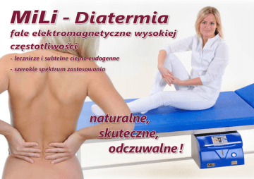 MiLi - Diatermia fale elektromagnetyczne wysokiej częstotliwości - lecznicze i subtelne ciepło endogenne - szerokie spektrum zastosowania naturalne, skuteczne, odczuwalne ! Bezoperacyjne leczenie pacjenta - przyjemnie i skutecznie Terapeutyczne spektrum zastosowania diatermii i atermicznych zabiegów jest bardzo zróżnicowane. Leczniczy wpływ spolaryzowanego pola elektromagnetycznego daje możliwość oddziaływania m.in. na organy wewnętrzne (wątrobę, nadnercza)- stymulując procesami metabolizmu. Podstawy diatermii wysokiej częstotliwości Widmo fal elektromagnetycznych jest szerokie, światło widzialne stanowi tylko jego niewielką część. Głęboko, poniżej częstotliwości promieniowania cieplnego znajdują się fale12 cm mające zastosowanie w urządzeniu medycznym MiLi. Dzięki ich pozytywnemu oddziaływaniu na struktury tkankowe zawierające elektrolity powstaje ciepło endogenne - przyjemne, lecznicze, bez efektów ubocznych. Diatermia –fale elektromagnetyczne wysokiej częstotliwości jest uznaną formą terapii od ponad stu lat. Prowadzone i publikowane w ostatnich dziesięcioleciach fundamentalne prace naukowe z zakresu chemii i biochemii, nagrodzone m.in. nagrodą Nobla (1997) - za zbadanie i wyjaśnienie enzymatycznego mechanizmu syntezy) potwierdziły zależność energii komórek ciała i potencjału elektrycznego. Fizyczne i biologiczne efekty diatermii bazują na powszechnie uznanych i wielokrotnie potwierdzonych prawach natury. Te aksjomaty są oczywiste, wieloletnio prowadzone doświadczenia w oparciu o efekty lecznicze potwierdziły ich fizjoterapeutyczą skuteczność. Laryngologiczne zastosowanie Lecznicze i uzdrawiające efekty MiLi – jako jedyno z niewielu urządzeń medycznych gwarantuje przeprowadzenie terapii całego ciała pacjenta bez potrzeby posiadania i konieczności wymiany różnego rodzaju aplikatorów. Dla potrzeb laryngologicznych skonstruowano współpracujący z MiLi promiennik umożliwiający realizację terapii punktowej. Poniżej niektóre z możliwości zastosowania: zastosowania MiLi, stymulujące m.in. procesem metabolizmu,przekrwienia tkanek i rozluźnienia mięśni, znalazły praktyczne i efektywne zastosowanie w terapii wielu schorzeń np: • zapalenie zatok przynosowych • zapalenie stawów szczęki • zapalenie ucha środkowego • zapalenie ucha zewnętrznego • ropień okołomigdałowy • zapalenie krtani • Arthrose • Asthma bronchiale • Morbus Bechterew • Brachialgia • Bronchitis chronica • Coccygodynia • Contusion, Distorsion • Cystitis • Epicondylitis • Ischias • Zmiany zwyrodnieniowe odcinka szyjnego, lędźwiowego i piersiowego kręgosłupa • Mialgia • Neuralgia • Neuropatia obwodowa • Reumatoidalne zapalenie stawów i mięśni • Periarthritis • Periostitis • Pleuritis • Polyarthritis rheumatica • Dolegliwości pourazowe • Pyelitis • Spondylitis • Tendinitis i Tenosynovitis • Tendovaginitis • Zespół de Quervaina • Furunculus, Carbunculus • Thrombophlebitis • Ropne i atopowe zapalenie skóry, Łuszczyca • Adnexitis • Mastitis • Metritis chronica • Prostatitis Pozytywne efekty lecznicze z punktu widzenia pacjenta terapia nie Skuteczna,bezoperacyjna wymagająca farmakologicznego leczenia rozciągliwości włókien Poprawa kolagenowych tkanki łącznej 1. Standby-Modus krążenia i zwiększenie Poprawa metabolizmu układu odpornościowego Wzmocnienie organizmu analgetyczne, stymulacja Oddziaływanie resorpcji i procesu fagocytozy Optymalizacja lepkości płynu maziowego pozycja terapii Relaksująca,wygodna eliminująca stany napięć mięśniowych 4. Behandlungs-Modus 2. Auswahl der Fachrichtung szybkiego i trwałego sukcesu Perspektywa terapeutycznego Terapia bez efektów ubocznych Obsługa i zastosowanie spektrum zastosowania w różnych Szerokie kierunkach medycyny selektywnego , Możliwość ukierunkowanego doboru programów zabiegu terapia całego ciała w jednym Samodzielna zabiegu Bezproblemowa wymiana promienników Głęboka penetracja terapii bezpieczna i intuicyjna obsługa Prosta, urządzenia i bezpieczny dobór programów dzięki Łatwy zintegrowanej tabeli zastosowań 3. Auswahl der Indikation Ekonomiczne aspekty Oszczędność kosztów i czasu spektrum zastosowań, Większe optymalne wykorzystanie własnego potencjału medycznego Kontrola wykonanych zabiegów i optymalne Oszczędne wykorzystanie zaplecza medycznego wydatków z własnego Redukcja budżetu farmakologicznego Możliwości terapii kombinowanych Dodatkowe możliwości zastosowania - terapia kombinowana Subiektywnie odczuwalny, przyjemny i relaksujący zabieg diatermiczny- MiLi lub MagnoLi- (terapia polem magnetycznym) jest idealnym uzupełnieniem i przygotowaniem pacjenta do innych form terapii. Leczenie układu mięśniowo-szkieletowego i odcinków kręgosłupa urządzeniem TRAComputer - jest bardzo skuteczną i uznaną formą leczenia. Zabieg wprowadzający przy zastosowaniu MiLi eliminuje napięcia mięśniowe przygotowując pacjenta w optymalny sposób do tego rodzaju terapii. oraz wybór kolorystyki leżanki Możliwości odmiennej gamy kolorów realizujemy na specjalne zamówienie. W celu uniknięcia rozbieżności w kolorystyce na wskutek błędów w druku prosimy o bezpośredni kontakt . Zastrzegamy sobie prawo do zmian technicznych bez wcześniejszego powiadomienia Dane techniczne MiLi Diatermia Zestaw terapeutyczny do trakcji odcinka szyjnego,piersiowego i lędźwiowego kręgosłupa,bioder i ramion Serwis Gwarancją najlepszego serwisu jest bezpośredni kontakt z użytkownikiem.Dewiza ta przyświeca nam od przeszło 30 lat działalności na rynku sprzętu medycznego. W przypadku zainteresowania chętnie przedstawimy państwu MiLi, oraz zademonstrujemy optymalne możliwości wykorzystania urządzenia. Prosimy o kontakt, zawsze służymy radą i pomocą. Leżanka: stal szlachetna ( niklowo-chromowa ), antymagnetyczna wymiary 65 x 75 x 200cm, waga: 42kg MiLi -Generato