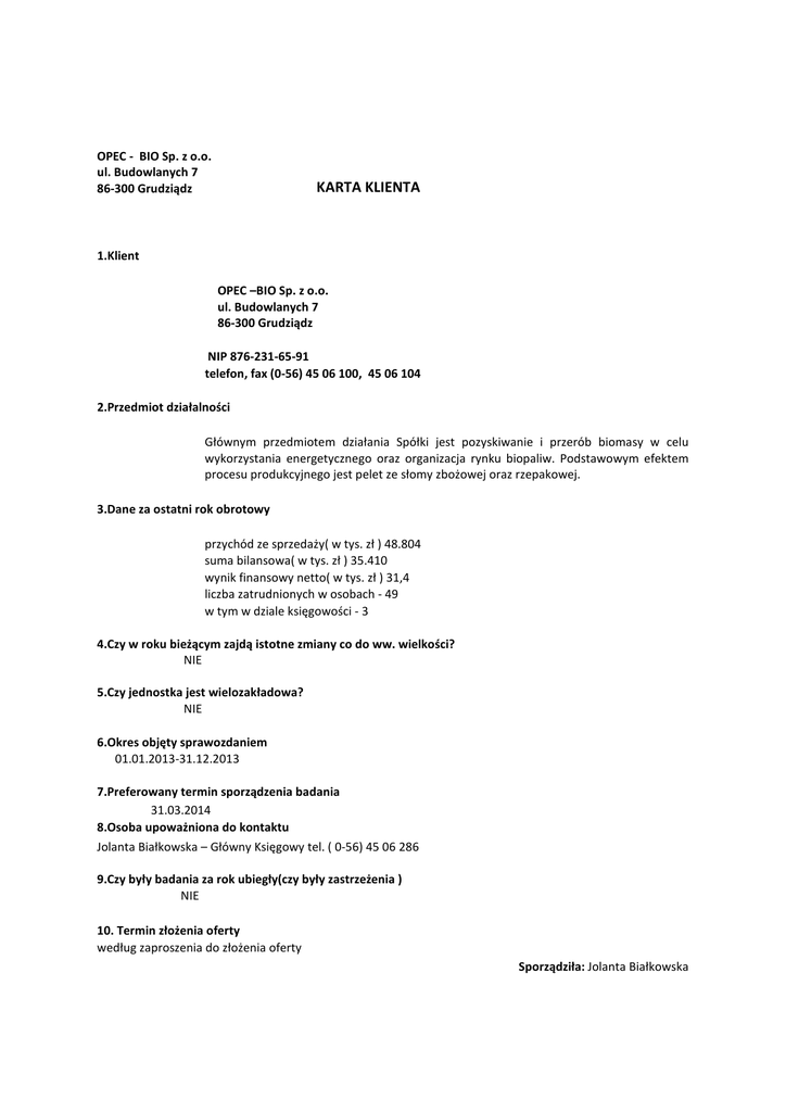 OPEC - BIO Sp. z o.o. ul. Budowlanych 7 86-300 Grudziądz KARTA KLIENTA 1.Klient OPEC –BIO Sp. z o.o. ul. Budowlanych 7 86-300 Grudziądz NIP 876-231-65-91 telefon, fax (0-56) 45 06 100, 45 06 104 2.Przedmiot działalności Głównym przedmiotem działania Spółki jest pozyskiwanie i przerób biomasy w celu wykorzystania energetycznego oraz organizacja rynku biopaliw. Podstawowym efektem procesu produkcyjnego jest pelet ze słomy zbożowej oraz rzepakowej. 3.Dane za ostatni rok obrotowy przychód ze sprzedaży( w tys. zł ) 48.804 suma bilansowa( w tys. zł ) 35.410 wynik finansowy netto( w tys. zł ) 31,4 liczba zatrudnionych w osobach - 49 w tym w dziale księgowości - 3 4.Czy w roku bieżącym zajdą istotne zmiany co do ww. wielkości? NIE 5.Czy jednostka jest wielozakładowa? NIE 6.Okres objęty sprawozdaniem 01.01.2013-31.12.2013 7.Preferowany termin sporządzenia badania 31.03.2014 8.Osoba upoważniona do kontaktu Jolanta Białkowska – Główny Księgowy tel. ( 0-56) 45 06 286 9.Czy były badania za rok ubiegły(czy były zastrzeżenia ) NIE 10. Termin złożenia oferty według zaproszenia do złożenia oferty Sporządziła: Jolanta Białkowska