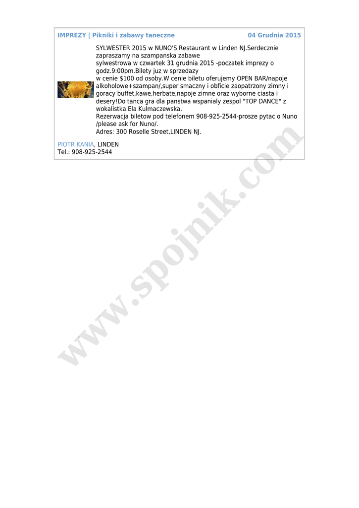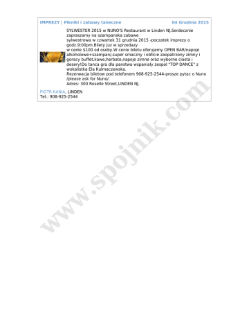 IMPREZY | Pikniki i zabawy taneczne 04 Grudnia 2015 m SYLWESTER 2015 w NUNO'S Restaurant w Linden NJ.Serdecznie zapraszamy na szampanska zabawe sylwestrowa w czwartek 31 grudnia 2015 -poczatek imprezy o godz.9:00pm.Bilety juz w sprzedazy w cenie $100 od osoby.W cenie biletu oferujemy OPEN BAR/napoje alkoholowe+szampan/,super smaczny i obficie zaopatrzony zimny i goracy buffet,kawe,herbate,napoje zimne oraz wyborne ciasta i desery!Do tanca gra dla panstwa wspanialy zespol "TOP DANCE" z wokalistka Ela Kulmaczewska. Rezerwacja biletow pod telefonem 908-925-2544-prosze pytac o Nuno /please ask for Nuno/. Adres: 300 Roselle Street,LINDEN NJ. w w w .s po jn ik .c o PIOTR KANIA, LINDEN Tel.: 908-925-2544