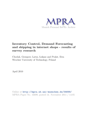 M PRA Munich Personal RePEc Archive Inventory Control, Demand Forecasting and shipping in internet shops - results of survey research Chodak, Grzegorz; Latus, Lukasz and Pralat, Ewa Wroclaw University of Technology, Poland April 2010 Online at http://mpra.ub.uni-muenchen.de/34699/ MPRA Paper No. 34699, posted 14. November 2011 / 14:05 Gospodarka magazynowa, prognozowanie popytu i wysyłka w sklepach internetowych – wyniki badań dr inż. Grzegorz Chodak1, mgr inż Łukasz Latus2, dr inż. Ewa Prałat3, Streszczenie w języku polskim: W artykule przedstawiono zagadnienia dotyczące prognozowania popytu i planowania stanów magazynowych w sklepach internetowych. Omówiono także sposoby prowadzenia gospodarki materiałowej i określania najistotniejszych z punktu widzenia sklepu grup towarów. Dalsza część artykułu zawiera analizę wyników badań ankietowych przeprowadzonych w 616 polskich sklepach internetowych. Badania dotyczyły stosowanego modelu logistycznego, sposobów prowadzenia konfekcjonowania i wysyłki produktów oraz metod prognozowania i planowania popytu. Streszczenie w języku angielskim: This article concerns the subject of demand forecasting and stocks status planning in online shops. One described the ways of materials management and setting the groups of most important products. The second part of the article contains the analysis of surveys results. They were conducted in 616 Polish online shops. The investigation concerns methods of demand forecasting, logistic models that are applied, chosen methods of packaging and shipping. Słowa kluczowe: konfekcjonowanie, wysyłka, sklep internetowy, handel elektroniczny Keywords: packaging, shipping, online shop, electronic commerce 1. Opis badań Badania dotyczące zasad prowadzenia gospodarki magazynowej i dystrybucji przez polskie sklepy internetowe przeprowadzono od czerwca do lipca 2009 roku. Były one realizowane przez autorów niniejszego artykułu w ramach bardziej rozległych badań prowadzonych przez serwis Sklepy24.pl a dotyczących charakterystycznych cech i wielkości mogących posłużyć do opisania i budowy modelu rynku e-Handlu w Polsce. Do udziału w badaniu zaproszono drogą mailową 5 798 sklepów internetowych zarejestrowanych w katalogu Sklepy24.pl. Ankieta umieszczona była na stronie tego serwisu. Zebrano 616 wypełnionych ankiet (odpowiedzi udzieliło 10,6% spośród powiadomionych sklepów). Pod koniec 2009 roku w Polsce działało prawdopodobnie około 7500 sklepów internetowych 4, badana próba stanowi więc około 8,2% całej populacji i jest największą w historii badań krajowych e-sklepów, a zarazem reprezentatywna. Celem opisywanych badań była identyfikacja stosowanych przez sklepy internetowe sposobów prowadzenia gospodarki magazynowej i dystrybucji.. Ze względu na rozległość celu dokonano jego dekompozycji na trzy cele szczegółowe: badanie sposobów prowadzenia gospodarki magazynowej i wysyłki w sklepach internetowych, analiza zasad prowadzenia dystrybucji w badanych sklepach internetowych, 1 adiunkt w Instytucie Organizacji i Zarządzania Politechniki Wrocławskiej doktorant w Instytucie Organizacji i Zarządzania Politechniki Wrocławskiej 3 adiunkt w Instytucie Organizacji i Zarządzania Politechniki Wrocławskiej 4 Raport „e-Handel Polska 2009” 2 analiza współpracy sklepów internetowych z przedsiębiorstwami kurierskimi i Pocztą Polską. Niniejszy artykuł dotyczy pierwszego celu badawczego. Jak już wspomniano, narzędziem badawczym była ankieta, która w części dotyczącej logistyki zawierała 26 pytań. Niektóre z nich zawierały podpunkty. Wszystkie były pytaniami zamkniętymi, część z nich umożliwiała jednak respondentowi podanie dodatkowych informacji. Większość, bo aż 15 pytań było pytaniami pojedynczego wyboru. Wszystkie pytania były obligatoryjne. W większości pytań zastosowano skale nominalną i porządkową, a w jednym skalę przedziałową. 2. Informacje o badanych sklepach Podział branżowy badanych sklepów przedstawiony został na rysunku nr 1. Sklepy mogły wskazać więcej niż jeden rodzaj działalności, dlatego też wskazania nie sumują się do 100%. Jak widać, najwięcej sklepów sprzedawało asortyment z dziedziny Dom & Ogród oraz Prezenty & Akcesoria. Auto i Moto Delikatesy 7,1% 3,1% Dom i Ogród 26,8% Dziecko 13,0% Foto i RTV-AGD 13,8% Hobby 11,2% Komputer 14,0% Książki i Multimedia 9,9% Odzież 17,5% Prezenty i Akcesoria 19,2% Sport i Turystyka 11,2% Zdrowie i Uroda 0,0% 15,6% 5,0% 10,0% 15,0% 20,0% 25,0% 30,0% Rysunek. 1. Branże, w jakich działały badane sklepy. W 2009 roku największą liczbą zamówień odnotowały sklepy z branży Książki & Multimedia (32,7%) oraz Foto & RTV-AGD (12,24%) i Odzież (11,56%). Jeśli chodzi natomiast o wartość sprzedaży, to przodowała tutaj branża Foto & RTV-AGD (27,6%), a następnie Dom & Ogród ( 14,3%) i Komputer (10,9%). Wśród sklepów biorących udział w badaniu najwięcej (36,9%) było takich, których staż na rynku wynosi pomiędzy 2 a 5 lat. Ponad połowa sklepów działa na rynku krócej niż dwa lata (rys. 2). pow yżej 5 lat; 12,2% krócej niż 1 rok; 23,1% pow yżej 2 lat - 5 lat; 36,9% pow yżej 1 roku - 2 lata; 27,8% Rysunek. 2. Staż badanych sklepów na rynku. Niemal tyle samo wśród badanych sklepów posiada także stacjonarną placówkę sprzedaży (51,5%), co prowadzi działalność wyłącznie w Internecie. 71,9% przedsiębiorców prowadzi tylko jeden sklep internetowy. Wśród badanych sklepów przeważają te, w których pracuje do dwóch osób (stanowią one ponad ¾ próbki). Sklepów zatrudniających powyżej 10 pracowników jest zaledwie 2,5% (rys. 3). 6-10 osób; 4,7% 11-20 osób; 1,8% powyżej 20 osób; 0,7% 1 osoba; 39,0% 3-5 osób; 16,9% 2 osoby; 36,9% Rysunek. 3. Liczba pracowników badanych e-sklepów. Połowa analizowanych sklepów miesięcznie wysyła zaledwie do 100 przesyłek, a niemal co trzeci pomiędzy 100 a 500. Zaledwie 3,