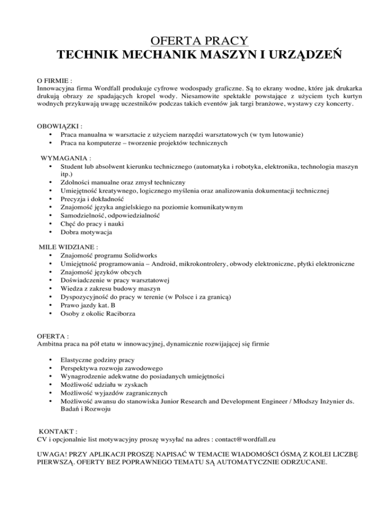 OFERTA PRACY TECHNIK MECHANIK MASZYN I URZĄDZEŃ O FIRMIE : Innowacyjna firma Wordfall produkuje cyfrowe wodospady graficzne. Są to ekrany wodne, które jak drukarka drukują obrazy ze spadających kropel wody. Niesamowite spektakle powstające z użyciem tych kurtyn wodnych przykuwają uwagę uczestników podczas takich eventów jak targi branżowe, wystawy czy koncerty. OBOWIĄZKI : • Praca manualna w warsztacie z użyciem narzędzi warsztatowych (w tym lutowanie) • Praca na komputerze – tworzenie projektów technicznych WYMAGANIA : • Student lub absolwent kierunku technicznego (automatyka i robotyka, elektronika, technologia maszyn itp.) • Zdolności manualne oraz zmysł techniczny • Umiejętność kreatywnego, logicznego myślenia oraz analizowania dokumentacji technicznej • Precyzja i dokładność • Znajomość języka angielskiego na poziomie komunikatywnym • Samodzielność, odpowiedzialność • Chęć do pracy i nauki • Dobra motywacja MILE WIDZIANE : • Znajomość programu Solidworks • Umiejętność programowania – Android, mikrokontrolery, obwody elektroniczne, płytki elektroniczne • Znajomość języków obcych • Doświadczenie w pracy warsztatowej • Wiedza z zakresu budowy maszyn • Dyspozycyjność do pracy w terenie (w Polsce i za granicą) • Prawo jazdy kat. B • Osoby z okolic Raciborza OFERTA : Ambitna praca na pół etatu w innowacyjnej, dynamicznie rozwijającej się firmie • • • • • • Elastyczne godziny pracy Perspektywa rozwoju zawodowego Wynagrodzenie adekwatne do posiadanych umiejętności Możliwość udziału w zyskach Możliwość wyjazdów zagranicznych Możliwość awansu do stanowiska Junior Research and Development Engineer / Młodszy Inżynier ds. Badań i Rozwoju KONTAKT : CV i opcjonalnie list motywacyjny proszę wysyłać na adres : [email protected] UWAGA! PRZY APLIKACJI PROSZĘ NAPISAĆ W TEMACIE WIADOMOŚCI ÓSMĄ Z KOLEI LICZBĘ PIERWSZĄ. OFERTY BEZ POPRAWNEGO TEMATU SĄ AUTOMATYCZNIE ODRZUCANE.