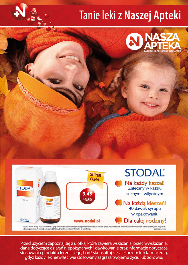 SUPER CENA! 9,45 13,50 Przed użyciem zapoznaj się z ulotką, która zawiera wskazania, przeciwwskazania, dane dotyczące działań niepożądanych i dawkowanie oraz informacje dotyczące stosowania produktu leczniczego, bądź skonsultuj się z lekarzem lub farmaceutą, gdyż każdy lek niewłaściwie stosowany zagraża twojemu życiu lub zdrowiu. Podaruj swoim bliskim zdrowie Każda okazja do składania życzeń naszym najbliższym, skłania nas do życzenia im Zdrowia. Teraz, razem z życzeniami, możemy ofiarować im Biovital Zdrowie. Współczesne babcie i dziadkowie to ludzie bardzo aktywni, którzy pracują i spędzają dużo czasu czynnie, również ze swoimi wnukami. Jednak z racji wieku czasem trudno im nadążyć za wszędobylskimi, energicznymi dziećmi. Coraz częściej odczuwają zmęczenie i brak energii, choć mają dużą determinację do działania. Aby wspomóc witalność naszych rodziców i dziadków, szczególnie w okresie jesienno-zimowym, warto pamiętać o zdrowym prezencie, jakim może być Biovital Zdrowie. Dzięki zawartości witamin z grupy B, witaminy C i E, żelaza oraz ekstraktu z głogu, Biovital Zdrowie korzystnie wpływa na serce, podnosi witalność i poprawia samopoczucie. Troska o zdrowie po 50. Oprócz regularnego stosowania preparatów wielowitaminowych osoby nieco starsze, zwłaszcza po pięćdziesiątym roku życia, powinny szczególnie dbać o zdrowie. Bardzo ważna jest codzienna, nawet minimalna aktywność fizyczna. Ich jadłospis powinien być oparty na produktach zbożowych, warzywach, owocach, oliwie oraz rybach. Należy pamiętać o ograniczeniu ilości spożywania szkodliwych tłuszczów zwierzęcych. Dieta osób po 50 roku życia powinna być regularnie wzbogacana odpowiednią dawką witamin i składników niezbędnych do normalnego funkcjonowania organizmu. Dlaczego warto stosować Biovital Zdrowie? Dzięki szczególnym właściwościom zawartych w nim składników, Biovital Zdrowie korzystnie wpływa na serce, podnosi witalność i poprawia samopoczucie. Składniki te pomagają zachować dobra kondycję fizyczną i psychiczną. • Witaminy z grupy B (B1, B2, B3, B6) mają wpływ na prawidłowy przebieg podstawowych procesów metabolicznych, a przez to również na prawidłową czynność serca i funkcjonowanie układu nerwowego. Są niezbędne dla prawidłowego przebiegu reakcji prowadzących do wytworzenia energii. • Witaminy C i E, jako naturalne przeciwutleniacze, ograniczają działanie wolnych rodników i opóźniają procesy starzenia się. • Witamina C jest niezbędna do utrzymania odporności organizmu. • Ekstrakt z owoców głogu jest bogaty we flawonoidy, o właściwościach przeciwutleniających, wpływa korzystnie na pracę serca, zwiększa dopływ tlenu i poprawia ukrwienie. • Żelazo to składnik krwi, który odpowiada za transport tlenu do wszystkich komórek organizmu. Prawidłowe dotlenienie poprawia zdolność koncentracji i ułatwia zasypianie. Żelazo jest też niezbędne do produkcji energii. • Biovital Zdrowie nie zawiera alkoholu • Zaleca się stosowanie dziennej dawki 30 ml, co odpowiada ilości równej 2 łyżkom stołowym. 41,50 52,60 BIOVITAL ZDROWIE, PŁYN, 1000 ML suplement diety Działanie: Biovital Zdrowie dzięki zawartym składnikom korzystnie wpływa na serce, podnosi witalność i poprawia samopoczucie. Biovital Zdrowie jest suplementem diety przeznaczonym dla osób dorosłych, zalecanym osobom przepracowanym, potrzebującym wzmocnienia organizmu niezależnie od wieku. Stosowanie: Zalecana porcja dzienna 30 ml odpowiada ilości równej 2 łyżkom stołowym. Suplement diety nie może być stosowany, jako substytut zróżnicowanej diety. Nie należy przekraczać zalecanej do spożycia porcji w ciągu dnia. Przed zastosowaniem suplementu diety należy sprawdzić datę ważności podaną na opakowaniu. Nie należy go stosować po terminie ważności. Dystrybutor: Bayer Sp. z o.o., Al. Jerozolimskie 158, 02-326 Warszawa; Informacja o produkcie w Polsce: Bayer Sp. z o.o. 2 www.naszaapteka.com.pl ACARD 60 TABLETEK ACC MAX 20 TABLETEK MUSUJĄCYCH ACC MAX. WYKRZTUŚ TO Z SIEBIE. SZYBKO! 5,70 14,95 8,90 19,20 Acard®,75 mg tabletki dojelitowe. Jedna tabletka dziennie to: zapobieganie zawałowi serca u osób dużego ryzyka, prewencja wtórna po przebytym zawale serca, zapobieganie napadom przejściowego niedokrwienia mózgu. ACARD®, 75 mg, tabletki dojelitowe. Skład: Jedna tabletka dojelitowa zawiera 75 mg kwasu acetylosalicylowego. Wskazania: Choroba niedokrwienna serca oraz wszelkie sytuacje kliniczne, w których celowe jest hamowanie agregacji płytek krwi. Przeciwwskazania: Kwasu acetylosalicylowego nie należy stosować: w przypadku nadwrażliwości na substancję czynną - kwas acetylosalicylowy, inne salicylany lub jakikolwiek składnik preparatu; u pacjentów ze skazą krwotoczną; u pacjentów z czynną chorobą wrzodową żołądka i (lub) dwunastnicy; u pacjentów z ciężką niewydolnością nerek; u pacjentów z ciężką niewydolnością wątroby; u pacjentów z napadami tzw. astmy aspirynowej w wywiadzie, wywołanymi podaniem salicylanów lub substancji o podobnym działaniu, szczególnie niesteroidowych leków przeciwzapalnych; jednocześnie z metotreksatem w dawkach 15 mg na tydzień lub większych; w ostatnim trymestrze ciąży; u dzieci w wieku do 12 lat. Podmiot odpowiedzialny: Warszawskie Zakłady Farmaceutyczne Polfa S.A. ALOES SOK 1000 ML Skład: 1 tabletka musująca zawiera 200 mg acetylocysteiny. Wskazania: Lek rozrzedzający wydzielinę dróg oddechowych i ułatwiający jej odkrztuszanie u pacjentów z zapaleniem oskrzeli związanym z przeziębieniem. Przeciwwskazania: Nadwrażliwość na acetylocysteinę lub jakąkolwiek substancję pomocniczą, czynna choroba żołądka i dwunastnicy, ostry stan astmatyczny, zmniejszona zdolność odkrztuszania wydzieliny, ciąża i okres karmienia piersią. Podmiot odpowiedzialny: Sandoz GmbH, Biochemiestrasse 10, A-6250 Kundl, Austr
