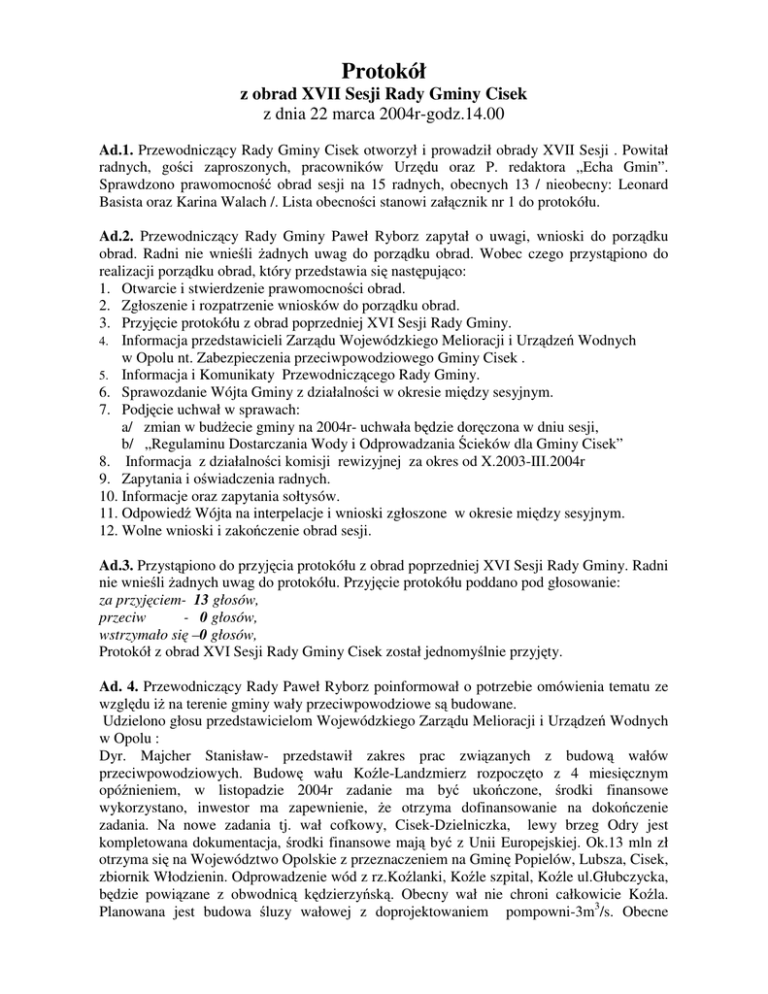 Protokół z obrad XVII Sesji Rady Gminy Cisek z dnia 22 marca 2004r-godz.14.00 Ad.1. Przewodnicz cy Rady Gminy Cisek otworzył i prowadził obrady XVII Sesji . Powitał radnych, go ci zaproszonych, pracowników Urz du oraz P. redaktora „Echa Gmin”. Sprawdzono prawomocno obrad sesji na 15 radnych, obecnych 13 / nieobecny: Leonard Basista oraz Karina Walach /. Lista obecno ci stanowi zał cznik nr 1 do protokółu. Ad.2. Przewodnicz cy Rady Gminy Paweł Ryborz zapytał o uwagi, wnioski do porz dku obrad. Radni nie wnie li adnych uwag do porz dku obrad. Wobec czego przyst piono do realizacji porz dku obrad, który przedstawia si nast puj co: 1. Otwarcie i stwierdzenie prawomocno ci obrad. 2. Zgłoszenie i rozpatrzenie wniosków do porz dku obrad. 3. Przyj cie protokółu z obrad poprzedniej XVI Sesji Rady Gminy. 4. Informacja przedstawicieli Zarz du Wojewódzkiego Melioracji i Urz dze Wodnych w Opolu nt. Zabezpieczenia przeciwpowodziowego Gminy Cisek . 5. Informacja i Komunikaty Przewodnicz cego Rady Gminy. 6. Sprawozdanie Wójta Gminy z działalno ci w okresie mi dzy sesyjnym. 7. Podj cie uchwał w sprawach: a/ zmian w bud ecie gminy na 2004r- uchwała b dzie dor czona w dniu sesji, b/ „Regulaminu Dostarczania Wody i Odprowadzania cieków dla Gminy Cisek” 8. Informacja z działalno ci komisji rewizyjnej za okres od X.2003-III.2004r 9. Zapytania i o wiadczenia radnych. 10. Informacje oraz zapytania sołtysów. 11. Odpowied Wójta na interpelacje i wnioski zgłoszone w okresie mi dzy sesyjnym. 12. Wolne wnioski i zako czenie obrad sesji. Ad.3. Przyst piono do przyj cia protokółu z obrad poprzedniej XVI Sesji Rady Gminy. Radni nie wnie li adnych uwag do protokółu. Przyj cie protokółu poddano pod głosowanie: za przyj ciem- 13 głosów, przeciw - 0 głosów, wstrzymało si –0 głosów, Protokół z obrad XVI Sesji Rady Gminy Cisek został jednomy lnie przyj ty. Ad. 4. Przewodnicz cy Rady Paweł Ryborz poinformował o potrzebie omówienia tematu ze wzgl du i na terenie gminy wały przeciwpowodziowe s budowane. Udzielono głosu przedstawicielom Wojewódzkiego Zarz du Melioracji i Urz dze Wodnych w Opolu : Dyr. Majcher Stanisław- przedstawił zakres prac zwi zanych z budow wałów przeciwpowodziowych. Budow wału Ko le-Landzmierz rozpocz to z 4 miesi cznym opó nieniem, w listopadzie 2004r zadanie ma by uko czone, rodki finansowe wykorzystano, inwestor ma zapewnienie, e otrzyma dofinansowanie na doko czenie zadania. Na nowe zadania tj. wał cofkowy, Cisek-Dzielniczka, lewy brzeg Odry jest kompletowana dokumentacja, rodki finansowe maj by z Unii Europejskiej. Ok.13 mln zł otrzyma si na Województwo Opolskie z przeznaczeniem na Gmin Popielów, Lubsza, Cisek, zbiornik Włodzienin. Odprowadzenie wód z rz.Ko lanki, Ko le szpital, Ko le ul.Głubczycka, b dzie powi zane z obwodnic k dzierzy sk . Obecny wał nie chroni całkowicie Ko la. Planowana jest budowa luzy wałowej z doprojektowaniem pompowni-3m3/s. Obecne zadania kwotowo wyniosły 5-6mln zł. Potok Cisek ma swoje koryto mi dzy zabudowaniami, nadmienił, e mieszka cy powinni si zgodzi na wyprostowanie koryta potoku. Nadmienił o problemach budowy zbiornika Racibórz, wie Nieboczowy w pow. Raciborskim nie wyra a zgody na likwidacj wsi, zabezpieczenie wsi b dzie bardzo kłopotliwe. Zdecydowano aby przej do dyskusji, problemy radnych mo na wyja ni poprzez dyskusj . Radny Oleks Walter- Ko le-1. Landzmierz termin zako czenia? 2.Kiedy odcinek dalszy w kierunku potoku Dzielniczka 3. Potok Cisek, scenariusz, dokumentacja, sprawy formalno prawne.4. w gór rzeki Odry obwałowanie miejscowo ci Roszowicki Las – Przewóz? Dyr. Majcher Stanisław-udzielił wyja nie , Ko le- Landzmierz prace b d zako czone w listopadzie br, w drugiej kolejno ci b dzie robiony wał cofkowy, robione s ju projekty, prawdopodobnie b dzie to rok 2005, je eli b d pieni dze, dokumenty, decyzje, na sze zada zło ono zapotrzebowanie do Funduszu Rozwoju Regionalnego. Odno nie potoku Cisek, oraz obwałowanie w gór rzeki Odry jest zaplanowane jako II etap obwałowania, dokumentacja jest kompletowana, 2-3 lata jest na realizacj zadania. Radny Ketzler Alojzy- zapytał o cało zamkni cia zadania? prosił o realne daty, nikomu nie yczy powodzi, które gospodarstwa planowane s do kasacji? Dyr.Majcher wyja nił, e dzisiaj nikt takiej daty nie okre li, nale ałoby powiedzie je eli b d pieni dze, Gmina jest poinformowana o budynkach do kasacji, mieszka cy równie . Sołtys Golenia Ryszard- na terenie wsi Kobylice budowane s wały pytanie 1: budowa obwodnicy odbiega w czasie, wjazd do Ko la przy zamkni ciu wału obecnego ? od ul.Raciborskiej wał jest gliniasty zawnioskował aby utwardzono ok. 20 m wału, byłby to odcinek ewakuacyjny z Kobylic. 2; ile oczek maj rury pod wałem ? W Landzmierzu s 2 rury, w Kobylicach ma by 1 rura ? Dyr.Majcher- monta rur dopasowany jest do powierzchni zlewni, nie mo na w wale robi zbyt wiele otworów, poniewa osłabiaj inwestycj . Odno nie utwardzenia wału poinformował, e ok 400 m wału na odcinku Ko le-Kobylice b dzie doprojektowane. Sołtys Golenia Ryszard- zapytał o wyja nienia odno nie budowy wału cofkowego? Ile metrów od wału mo na wydobywa ziemi ? Dlaczego z wyrobiska OKSM w Kobylicach nie wybiera si ziemi? Zapytał o zabieraniu ziemi z gruntu P.Dembo czyka. Dyr.Majcher wyja nił, e wał lewostronny jest ni szy od prawostronnego. Ziemi mo na wydobywa w odległo ci nie mniejszej ni 50 m od wału, rodzaj gruntu decyduje o odległo ci. Z OKSM przeprowadzono rozmowy, przedsi biorstwo narzuciło wysok cen , na dzie dzisiejszy ZMiUW nie ma potrzeby zakupu ziemi, ziemi wykupiono od rolników indywidualnych. Wyja nił, uzgodnienia z P.Dembo czykiem, zapewnił, e P Dembo czyk napewno nie b dzie poszkodowany. Radny Oleks Walter- ile potrzeba pieni dzy na potok Cisek , ile na potok Dzielniczka. Dyr. Majcher wyja nił, e na roboty obecne kosztorys opiewał na kwot 16-17 mln.zł. a zrobiono za 6-7 mln.zł, potok Cisek kubatura du a ale prosta, 
