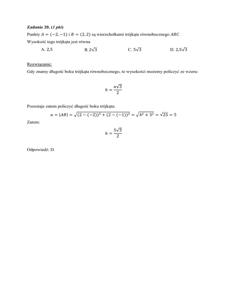 Zadanie 20. (1 pkt) Punkty 2, 1 i 2, 2 są wierzchołkami trójkąta równobocznego . Wysokość tego trójkąta jest równa A. 2,5 C. 5√3 B. 2√3 D. 2,5√3 Rozwiązanie: Gdy znamy długość boku trójkąta równobocznego, to wysokości możemy policzyć ze wzoru: √3 2 Pozostaje zatem policzyć długość boku trójkąta: || 2 2ଶ 2 1ଶ 4ଶ 3ଶ √25 5 Zatem: Odpowiedź: D. 5√3 2