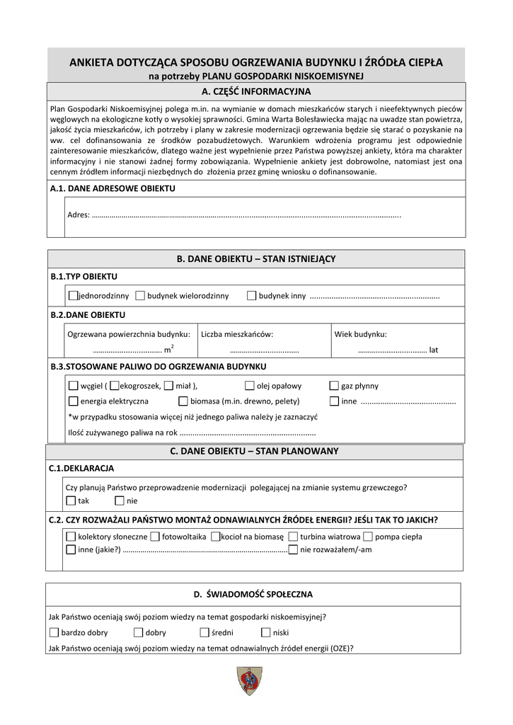 ANKIETA DOTYCZĄCA SPOSOBU OGRZEWANIA BUDYNKU I ŹRÓDŁA CIEPŁA na potrzeby PLANU GOSPODARKI NISKOEMISYNEJ A. CZĘŚĆ INFORMACYJNA Plan Gospodarki Niskoemisyjnej polega m.in. na wymianie w domach mieszkańców starych i nieefektywnych pieców węglowych na ekologiczne kotły o wysokiej sprawności. Gmina Warta Bolesławiecka mając na uwadze stan powietrza, jakość życia mieszkańców, ich potrzeby i plany w zakresie modernizacji ogrzewania będzie się starać o pozyskanie na ww. cel dofinansowania ze środków pozabudżetowych. Warunkiem wdrożenia programu jest odpowiednie zainteresowanie mieszkańców, dlatego ważne jest wypełnienie przez Państwa powyższej ankiety, która ma charakter informacyjny i nie stanowi żadnej formy zobowiązania. Wypełnienie ankiety jest dobrowolne, natomiast jest ona cennym źródłem informacji niezbędnych do złożenia przez gminę wniosku o dofinansowanie. A.1. DANE ADRESOWE OBIEKTU Adres: ………………………………………………………..................................................................................... B. DANE OBIEKTU – STAN ISTNIEJĄCY B.1.TYP OBIEKTU jednorodzinny budynek wielorodzinny budynek inny ............................................................ B.2.DANE OBIEKTU Ogrzewana powierzchnia budynku: ………....................…. m Liczba mieszkańców: 2 Wiek budynku: ………....................…. ………....................…. lat B.3.STOSOWANE PALIWO DO OGRZEWANIA BUDYNKU węgiel ( ekogroszek, miał ), energia elektryczna olej opałowy biomasa (m.in. drewno, pelety) gaz płynny inne ............................................ *w przypadku stosowania więcej niż jednego paliwa należy je zaznaczyć Ilość zużywanego paliwa na rok ............................................................... C. DANE OBIEKTU – STAN PLANOWANY C.1.DEKLARACJA Czy planują Państwo przeprowadzenie modernizacji polegającej na zmianie systemu grzewczego? tak nie C.2. CZY ROZWAŻALI PAŃSTWO MONTAŻ ODNAWIALNYCH ŹRÓDEŁ ENERGII? JEŚLI TAK TO JAKICH? kolektory słoneczne fotowoltaika kocioł na biomasę inne (jakie?) ……………………………………………………………………….. turbina wiatrowa nie rozważałem/-am D. ŚWIADOMOŚĆ SPOŁECZNA Jak Państwo oceniają swój poziom wiedzy na temat gospodarki niskoemisyjnej? bardzo dobry dobry średni niski Jak Państwo oceniają swój poziom wiedzy na temat odnawialnych źródeł energii (OZE)? pompa ciepła bardzo dobry dobry średni niski Czy są Państwo zainteresowani otrzymywaniem informacji dotyczących zewnętrznych form wsparcia na realizację zadań związanych z efektywnością energetyczną i gospodarką niskoemisyjną? Jeżeli tak, proszę o podanie adresu e-mail lub innej formy kontaktu: ………………………………………………………………………………………………………………………………………………………………………………