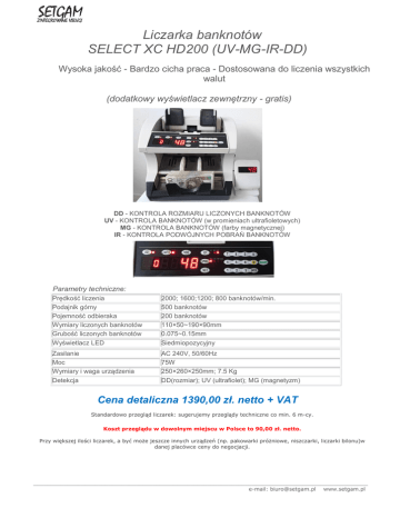 Liczarka banknotów SELECT XC HD200 (UV-MG-IR-DD) Wysoka jakość - Bardzo cicha praca - Dostosowana do liczenia wszystkich walut (dodatkowy wyświetlacz zewnętrzny - gratis) DD - KONTROLA ROZMIARU LICZONYCH BANKNOTÓW UV - KONTROLA BANKNOTÓW (w promieniach ultrafioletowych) MG - KONTROLA BANKNOTÓW (farby magnetycznej) IR - KONTROLA PODWÓJNYCH POBRAŃ BANKNOTÓW Parametry techniczne: Prędkość liczenia Podajnik górny Pojemność odbieraka Wymiary liczonych banknotów Grubość liczonych banknotów Wyświetlacz LED 2000; 1600;1200; 800 banknotów/min. 500 banknotów 200 banknotów 110×50~190×90mm 0.075~0.15mm Siedmiopozycyjny Zasilanie Moc Wymiary i waga urządzenia Detekcja AC 240V, 50/60Hz 75W 250×260×250mm; 7.5 Kg DD(rozmiar); UV (ultrafiolet); MG (magnetyzm) Cena detaliczna 1390,00 zł. netto + VAT Standardowo przegląd liczarek: sugerujemy przeglądy techniczne co min. 6 m-cy. Koszt przeglądu w dowolnym miejscu w Polsce to 90,00 zł. netto. Przy większej ilości liczarek, a być może jeszcze innych urządzeń (np. pakowarki próżniowe, niszczarki, liczarki bilonu)w danej placówce ceny do negocjacji. __________________________________________________________________________________________________ e-mail: [email protected] www.setgam.pl Liczarka banknotów Ratiotec T 200 (UV-MG-IR-DD) automatyczna weryfikacja autentyczności banknotów dla wybranych walut : PLN; EURO; USD; NOK; SEK; GBP; CHF; CZK; RON Wysoka jakość - Bardzo cicha praca - Dostosowana do liczenia wszystkich walut DD - KONTROLA ROZMIARU LICZONYCH BANKNOTÓW UV - KONTROLA BANKNOTÓW (w świetle ultrafioletowym) MG - KONTROLA BANKNOTÓW (farby magnetycznej) MT - KONTROLA BANKNOTÓW (nitki magnetycznej) IR - KONTROLA POBORU PODWÓJNYCH BANKNOTÓW Parametry techniczne: Prędkość liczenia Podajnik górny Pojemność odbieraka Wymiary liczonych banknotów Grubość liczonych banknotów Wyświetlacz LED 1500;1200; 900 banknotów/min. 300 banknotów 220 banknotów 110×50~190×90mm 0.075~0.15mm LCD Zasilanie Moc Wymiary i waga urządzenia Detekcja AC 230-240V, 50/60Hz 75W 260 x 280 x 260mm; 7.0 Kg DD(rozmiar); UV (ultrafiolet); MG/MT (magnetyzm); IR (podczerwień) Cena detaliczna 2090,00 zł. netto + VAT Standardowo przegląd liczarek: sugerujemy przeglądy techniczne co min. 6 m-cy. Koszt przeglądu w dowolnym miejscu w Polsce to 90,00 zł. netto. Przy większej ilości liczarek, a być może jeszcze innych urządzeń (np. pakowarki próżniowe, niszczarki, liczarki bilonu)w danej placówce ceny do negocjacji. __________________________________________________________________________________________________ e-mail: [email protected] www.setgam.pl
