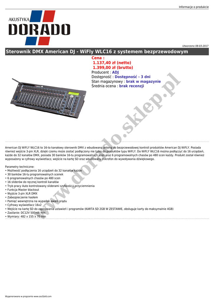 Informacje o produkcie Utworzono 08-03-2017 Sterownik DMX American DJ - WiFly WLC16 z systemem bezprzewodowym Cena : 1.137,40 zł (netto) 1.399,00 zł (brutto) o. sk le p. p l Producent : ADJ Dostępność : Dostępność - 3 dni Stan magazynowy : brak w magazynie Średnia ocena : brak recenzji .d or ad American DJ WiFLY WLC16 to 16-to kanałowy sterownik DMX z wbudowaną anteną do bezprzewodowej kontroli produktów American DJ WiFLY. Posiada również wejście 3-pin XLR, dzięki czemu może zostać podłączony nie tylko do produktów typu WiFLY. Do WiFLY WLC16 można podłączyć do 16 urządzeń, każde do 32 kanałów DMX, posiada 30 banków 16-tu programowalnych scen oraz 6 programowalnych chasów po 480 scen każdy. Produkt został również wyposażony w cyfrowy wyświetlacz, wejście na kartę SD oraz wbudowany mikrofon do wywoływania dźwiękowego. w w w Parametry techniczne: • Możliwość podłączenia 16 urządzeń do 32 kanałów każde • 30 banków 16-tu programowalnych scenek • 6 programowalnych chasów po 480 scen • 16 sliderów do ręcznej kontroli kanałów • Tryb pracy Auto kontrolowany sliderami szybkości i przyciemnienia • Funkcja Master blackout • Wyjście 3-pin XLR DMX • Zabezpieczenie hasłem • Pamięć wewnętrzna na wypadek awarii prądu • Cyfrowy wyświetlacz 16x2 • Wejście na kartę SD do zapisywania ustawień i programów (KARTA SD 2GB W ZESTAWIE, obsługuje karty do maksymalnie 4GB) • Zasilanie: DC12V 500mA min • Wymiary: 482 x 155 x 70 mm Wygenerowano w programie www.oscGold.com