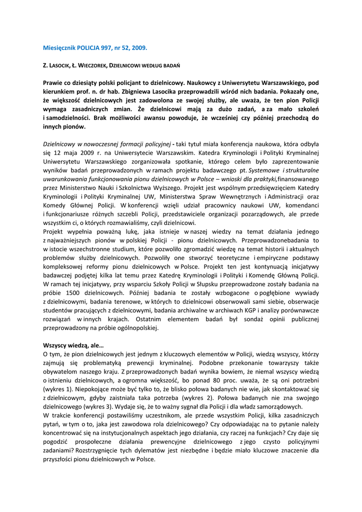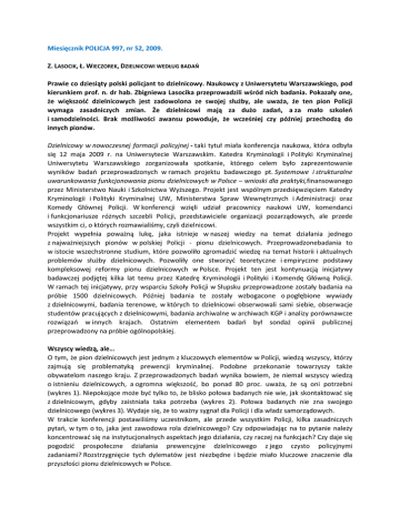 Miesięcznik POLICJA 997, nr 52, 2009. Z. LASOCIK, Ł. WIECZOREK, DZIELNICOWI WEDŁUG BADAŃ Prawie co dziesiąty polski policjant to dzielnicowy. Naukowcy z Uniwersytetu Warszawskiego, pod kierunkiem prof. n. dr hab. Zbigniewa Lasocika przeprowadzili wśród nich badania. Pokazały one, że większość dzielnicowych jest zadowolona ze swojej służby, ale uważa, że ten pion Policji wymaga zasadniczych zmian. Że dzielnicowi mają za dużo zadań, a za mało szkoleń i samodzielności. Brak możliwości awansu powoduje, że wcześniej czy później przechodzą do innych pionów. Dzielnicowy w nowoczesnej formacji policyjnej - taki tytuł miała konferencja naukowa, która odbyła się 12 maja 2009 r. na Uniwersytecie Warszawskim. Katedra Kryminologii i Polityki Kryminalnej Uniwersytetu Warszawskiego zorganizowała spotkanie, którego celem było zaprezentowanie wyników badań przeprowadzonych w ramach projektu badawczego pt. Systemowe i strukturalne uwarunkowania funkcjonowania pionu dzielnicowych w Polsce – wnioski dla praktyki,finansowanego przez Ministerstwo Nauki i Szkolnictwa Wyższego. Projekt jest wspólnym przedsięwzięciem Katedry Kryminologii i Polityki Kryminalnej UW, Ministerstwa Spraw Wewnętrznych i Administracji oraz Komedy Głównej Policji. W konferencji wzięli udział pracownicy naukowi UW, komendanci i funkcjonariusze różnych szczebli Policji, przedstawiciele organizacji pozarządowych, ale przede wszystkim ci, o których rozmawialiśmy, czyli dzielnicowi. Projekt wypełnia poważną lukę, jaka istnieje w naszej wiedzy na temat działania jednego z najważniejszych pionów w polskiej Policji - pionu dzielnicowych. Przeprowadzonebadania to w istocie wszechstronne studium, które pozwoliło zgromadzić wiedzę na temat historii i aktualnych problemów służby dzielnicowych. Pozwoliły one stworzyć teoretyczne i empiryczne podstawy kompleksowej reformy pionu dzielnicowych w Polsce. Projekt ten jest kontynuacją inicjatywy badawczej podjętej kilka lat temu przez Katedrę Kryminologii i Polityki i Komendę Główną Policji. W ramach tej inicjatywy, przy wsparciu Szkoły Policji w Słupsku przeprowadzone zostały badania na próbie 1500 dzielnicowych. Później badania te zostały wzbogacone o pogłębione wywiady z dzielnicowymi, badania terenowe, w których to dzielnicowi obserwowali sami siebie, obserwacje studentów pracujących z dzielnicowymi, badania archiwalne w archiwach KGP i analizy porównawcze rozwiązań w innych krajach. Ostatnim elementem badań był sondaż opinii publicznej przeprowadzony na próbie ogólnopolskiej. Wszyscy wiedzą, ale… O tym, że pion dzielnicowych jest jednym z kluczowych elementów w Policji, wiedzą wszyscy, którzy zajmują się problematyką prewencji kryminalnej. Podobne przekonanie towarzyszy także obywatelom naszego kraju. Z przeprowadzonych badań wynika bowiem, że niemal wszyscy wiedzą o istnieniu dzielnicowych, a ogromna większość, bo ponad 80 proc. uważa, że są oni potrzebni (wykres 1). Niepokojące może być tylko to, że blisko połowa badanych nie wie, jak skontaktować się z dzielnicowym, gdyby zaistniała taka potrzeba (wykres 2). Połowa badanych nie zna swojego dzielnicowego (wykres 3). Wydaje się, że to ważny sygnał dla Policji i dla władz samorządowych. W trakcie konferencji postawiliśmy uczestnikom, ale przede wszystkim Policji, kilka zasadniczych pytań, w tym o to, jaka jest zawodowa rola dzielnicowego? Czy odpowiadając na to pytanie należy koncentrować się na instytucjonalnych aspektach jego działania, czy raczej na funkcjach? Czy daje się pogodzić prospołeczne działania prewencyjne dzielnicowego z jego czysto policyjnymi zadaniami? Rozstrzygnięcie tych dylematów jest niezbędne i będzie miało kluczowe znaczenie dla przyszłości pionu dzielnicowych w Polsce. Sami o sobie Obraz dzielnicowych w ich własnych oczach jest dość niejednorodny, a nawet nasycony sprzecznościami. Oto bowiem ponad 80 proc. badanych twierdzi, że są zadowoleni z wykonywanej służby (wykres 4), a ponad połowa odczuwa nawet satysfakcję z tego co robi, a jednocześnie znaczną większość, bo prawie trzy czwarte stanowią ci, którzy twierdzą, że w pionie dzielnicowych konieczne są zasadnicze zmiany (wykres 5). Z jednej strony badani deklarują pozytywne motywacje do pracy i przekonanie o potrzebie istnienia pionu dzielnicowych, z drugiej zaś przyznają, że warunki organizacyjne, jakie stwarza im Policja, nie gwarantują właściwego wykonywania zadań. Dzielnicowi deklarują dobre, a czasem nawet bardzo dobre przygotowanie do pracy (wykres 6), ale przyznają, że brakuje im szkoleń, nie tylko tych specjalistycznych (55 proc.). Dobrym przykładem może być tutaj kontakt ze społeczeństwem. Dzielnicowi w swojej pracy lubią kontakt z ludźmi, choć się go trochę obawiają, ponieważ nie są właściwie przygotowywani do tej pracy. Kursy dla dzielnicowych dotyczą zagadnień ogólnych, natomiast mniej uwagi poświęca się umiejętnościom psychologicznym, sztuce komunikacji czy pracy z rodzinami, zwłaszcza tymi, w których występuje przemoc. Dlatego trzeba dołożyć wszelkich starań, aby tę lukę w szkoleniach czym prędzej zniwelować. Pracę dzielnicowych reguluje zarządzenie KGP nr 5281 Zainteresowani oceniają je raczej dobrze, ale twierdzą, że zarządzenie to bardzo często nie jest przestrzegane. Ich zdaniem szczególnym utrudnieniem dla dzielnicowych jest brak samodzielności. Dzielnicowi, jak sami przyznają, często nie wykonują zaplanowanych przez siebie czynności, ponieważ przełożeni nakładają na nich inne zadania. Sytuacja ta powoduje, że dzielnicowi nie są kreatywni, nie poświęcają swoje pracy tyle czasu, ile powinni. Sami zresztą są świadomi tej sytuacji, bo jak przyznają, aby z wszystkim zdążyć, często wykonują swoją pracę szybko i rutynowo. Mówiąc o ocenie pracy dzielnicowych przez nich samych, zwrócić uwagę należy na jeszcze j