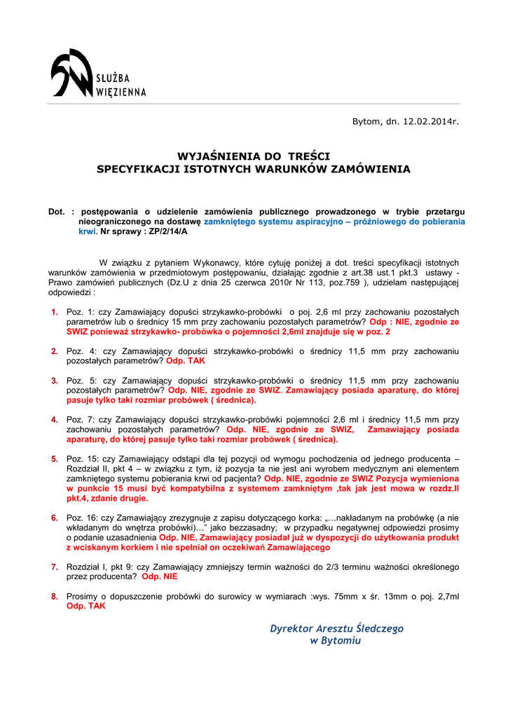 Bytom, dn. 12.02.2014r. WYJAŚNIENIA DO TREŚCI SPECYFIKACJI ISTOTNYCH WARUNKÓW ZAMÓWIENIA Dot. : postępowania o udzielenie zamówienia publicznego prowadzonego w trybie przetargu nieograniczonego na dostawę zamkniętego systemu aspiracyjno – próżniowego do pobierania krwi. Nr sprawy : ZP/2/14/A W związku z pytaniem Wykonawcy, które cytuję poniżej a dot. treści specyfikacji istotnych warunków zamówienia w przedmiotowym postępowaniu, działając zgodnie z art.38 ust.1 pkt.3 ustawy Prawo zamówień publicznych (Dz.U z dnia 25 czerwca 2010r Nr 113, poz.759 ), udzielam następującej odpowiedzi : 1. Poz. 1: czy Zamawiający dopuści strzykawko-probówki o poj. 2,6 ml przy zachowaniu pozostałych parametrów lub o średnicy 15 mm przy zachowaniu pozostałych parametrów? Odp : NIE, zgodnie ze SWIZ ponieważ strzykawko- probówka o pojemności 2,6ml znajduje się w poz. 2 2. Poz. 4: czy Zamawiający dopuści strzykawko-probówki o średnicy 11,5 mm przy zachowaniu pozostałych parametrów? Odp. TAK 3. Poz. 5: czy Zamawiający dopuści strzykawko-probówki o średnicy 11,5 mm przy zachowaniu pozostałych parametrów? Odp. NIE, zgodnie ze SWIZ. Zamawiający posiada aparaturę, do której pasuje tylko taki rozmiar probówek ( średnica). 4. Poz. 7: czy Zamawiający dopuści strzykawko-probówki pojemności 2,6 ml i średnicy 11,5 mm przy zachowaniu pozostałych parametrów? Odp. NIE, zgodnie ze SWIZ, Zamawiający posiada aparaturę, do której pasuje tylko taki rozmiar probówek ( średnica). 5. Poz. 15: czy Zamawiający odstąpi dla tej pozycji od wymogu pochodzenia od jednego producenta – Rozdział II, pkt 4 – w związku z tym, iż pozycja ta nie jest ani wyrobem medycznym ani elementem zamkniętego systemu pobierania krwi od pacjenta? Odp. NIE, zgodnie ze SWIZ Pozycja wymieniona w punkcie 15 musi być kompatybilna z systemem zamkniętym ,tak jak jest mowa w rozdz.II pkt.4, zdanie drugie. 6. Poz. 16: czy Zamawiający zrezygnuje z zapisu dotyczącego korka: „…nakładanym na probówkę (a nie wkładanym do wnętrza probówki)…” jako bezzasadny; w przypadku negatywnej odpowiedzi prosimy o podanie uzasadnienia Odp. NIE, Zamawiający posiadał już w dyspozycji do użytkowania produkt z wciskanym korkiem i nie spełniał on oczekiwań Zamawiającego 7. Rozdział I, pkt 9: czy Zamawiający zmniejszy termin ważności do 2/3 terminu ważności określonego przez producenta? Odp. NIE 8. Prosimy o dopuszczenie probówki do surowicy w wymiarach :wys. 75mm x śr. 13mm o poj. 2,7ml Odp. TAK Dyrektor Aresztu Śledczego w Bytomiu