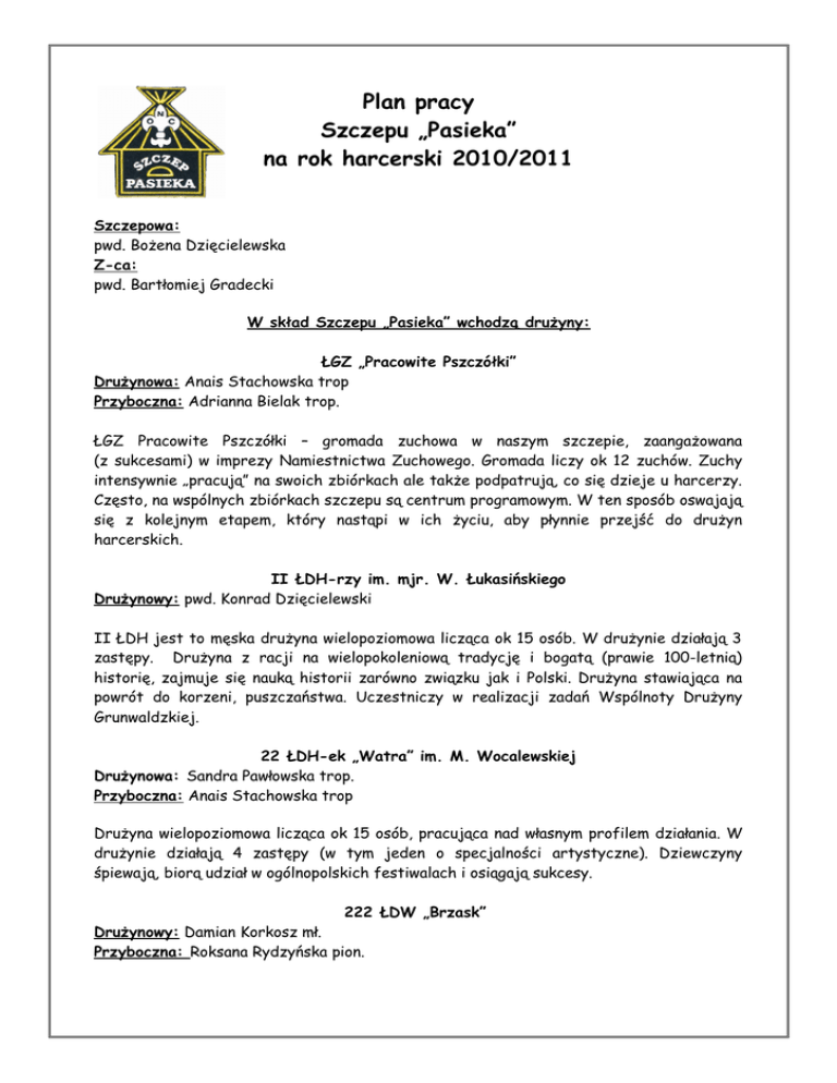 Plan pracy Szczepu „Pasieka” na rok harcerski 2010/2011 Szczepowa: pwd. Bożena Dzięcielewska Z-ca: pwd. Bartłomiej Gradecki W skład Szczepu „Pasieka” wchodzą drużyny: ŁGZ „Pracowite Pszczółki” Drużynowa: Anais Stachowska trop Przyboczna: Adrianna Bielak trop. ŁGZ Pracowite Pszczółki – gromada zuchowa w naszym szczepie, zaangażowana (z sukcesami) w imprezy Namiestnictwa Zuchowego. Gromada liczy ok 12 zuchów. Zuchy intensywnie „pracują” na swoich zbiórkach ale także podpatrują, co się dzieje u harcerzy. Często, na wspólnych zbiórkach szczepu są centrum programowym. W ten sposób oswajają się z kolejnym etapem, który nastąpi w ich życiu, aby płynnie przejść do drużyn harcerskich. II ŁDH-rzy im. mjr. W. Łukasińskiego Drużynowy: pwd. Konrad Dzięcielewski II ŁDH jest to męska drużyna wielopoziomowa licząca ok 15 osób. W drużynie działają 3 zastępy. Drużyna z racji na wielopokoleniową tradycję i bogatą (prawie 100-letnią) historię, zajmuje się nauką historii zarówno związku jak i Polski. Drużyna stawiająca na powrót do korzeni, puszczaństwa. Uczestniczy w realizacji zadań Wspólnoty Drużyny Grunwaldzkiej. 22 ŁDH-ek „Watra” im. M. Wocalewskiej Drużynowa: Sandra Pawłowska trop. Przyboczna: Anais Stachowska trop Drużyna wielopoziomowa licząca ok 15 osób, pracująca nad własnym profilem działania. W drużynie działają 4 zastępy (w tym jeden o specjalności artystyczne). Dziewczyny śpiewają, biorą udział w ogólnopolskich festiwalach i osiągają sukcesy. 222 ŁDW „Brzask” Drużynowy: Damian Korkosz mł. Przyboczna: Roksana Rydzyńska pion. Drużyna wędrownicza składająca się z członków drużyn harcerskich i kadry, licząca ok 9 osób. Drużyna ma na celu zintegrowanie starszych osób w szczepie oraz ma być podpowiedzią do odnalezienia dalszego pola służby. Obecnie brak osoby na funkcji kwatermistrza szczepu. Kadra szczepu to: 3 instruktorów (2 z otwartą próbą phm) 3 osoby z Naramiennikiem Wędrowniczym (oraz 1 otwartą próbę) 1 otwartą próbę na HO 4 otwartą próbę na sam. 1 otwartą próbę na ćwika Rady szczepu odbywać się będę raz na 2 miesiące lecz jeśli zajdzie potrzeba częściej (termin nie jest stały). Siedzibą szczepu jest harcówka przy ul. Żubardzkiej 3, miejscem działania natomiast 56 Szkoła Podstawowa. Szczep nie posiada konstytucji. Szczep posiada własny sprzęt pionierski, który uzupełniony został przed HALem 2010 natomiast teraz wymaga naprawy i dodatkowego uzupełnienia. Za stan techniczny sprzętu oraz jego uzupełnianie odpowiedzialny będzie kwatermistrz szczepu. Pomimo działania w szczepie drużyny stawiają na indywidualność programową i pracę wg własnych planów. W związku z tym zbiórki szczepu będą zbiórkami okolicznościowymi, integracyjnymi. Chcemy również aby Śnieżkowe Spotkania Noworoczne stały się nową tradycją w szczepie. W tym roku planujemy również bardziej zaangażować się w życie naszej osiedlowej społeczności. Przez cały rok planujemy brać czynnie udział w imprezach osiedlowych oraz przygotować festyn dla mieszkańców. Będziemy również (jak dotychczas) razem z Policją i Strażą Miejską przeprowadzać coroczną Akcję „Cytryna”. Zarówno drużyny jak i gromada będą też uczestniczyć w imprezach hufcowych. Drużyny harcerskie współpracując z gromadą zuchową oswajają najmłodszych członków szczepu ze swoją pracą i przygotowują do przejścia zuchów do drużyn. Osoby osiągające wiek wędrowniczy mają też miejsce do kontynuacji drogi harcerskiej w kolejnym pionie metodycznym. Data 17.09.2010 Cały rok 21.09.2010 25.09.2010 Forma i temat Odpowiedzialny Rozpoczęcie Roku Harcerskiego Udział w imprezach osiedlowych. Rozmowy Organizacyjne Bożena Dzięcielewska 71 rocznica powstania Szarych Szeregów Bożena Dzięcielewska Uwagi Kadry drużyn Kadra Szczepu Sprzątanie pomników na Ogrodowej 07.10.2010 0810.10.2010 październik 01.11.2010 11.11.2010 pod koniec listopada 1719.12.2010 01.01.2011 1820.02.2011 Marzec / kwiecień 01.04.2011 kwiecień maj 01.06.2011 Hufcowe Rozpoczęcie Roku Harcerskiego Wyjazd w Ciemno Hufiec/Kadra Szczepu Hufiec Kominek lub Biwak szczepu Kadra Szczepu Akcja Znicz Kadra Szczepu Rajd Kadry Szczepu Bartłomiej Gradecki Impreza Andrzejkowa dla Kadry Szczepu Sandra Pawlowska Biwak wigilijny Bożena Dzięcielewska, Bartłomiej Gradecki Śnieżkowe Spotkanie Noworoczne Dzień Myśli Braterskiej Biwak Sandra Pawlowska, Konrad Dzięcielewski Damian Korkosz Rajd Arsenał Hufiec Mokotów Akcja „Cytryna” Konrad Dzięcielewski Festyn dla osiedla Konrad Dzięcielewski Biwak Szczepu „Św. Jerzy” Kadra Szczepu Impreza z okazji Dnia Dziecka 51 Złaz Hufca Anais Stachowska 11-12.06.2011 Zakończenie Roku czerwiec Hufiec lipiec sierpień Kadra Szczepu Harcerskiego. HAL 2011 Bożena Dzięcielewska Dla Kadr Drużyn Dla Kadr Drużyn Kadry Drużyn